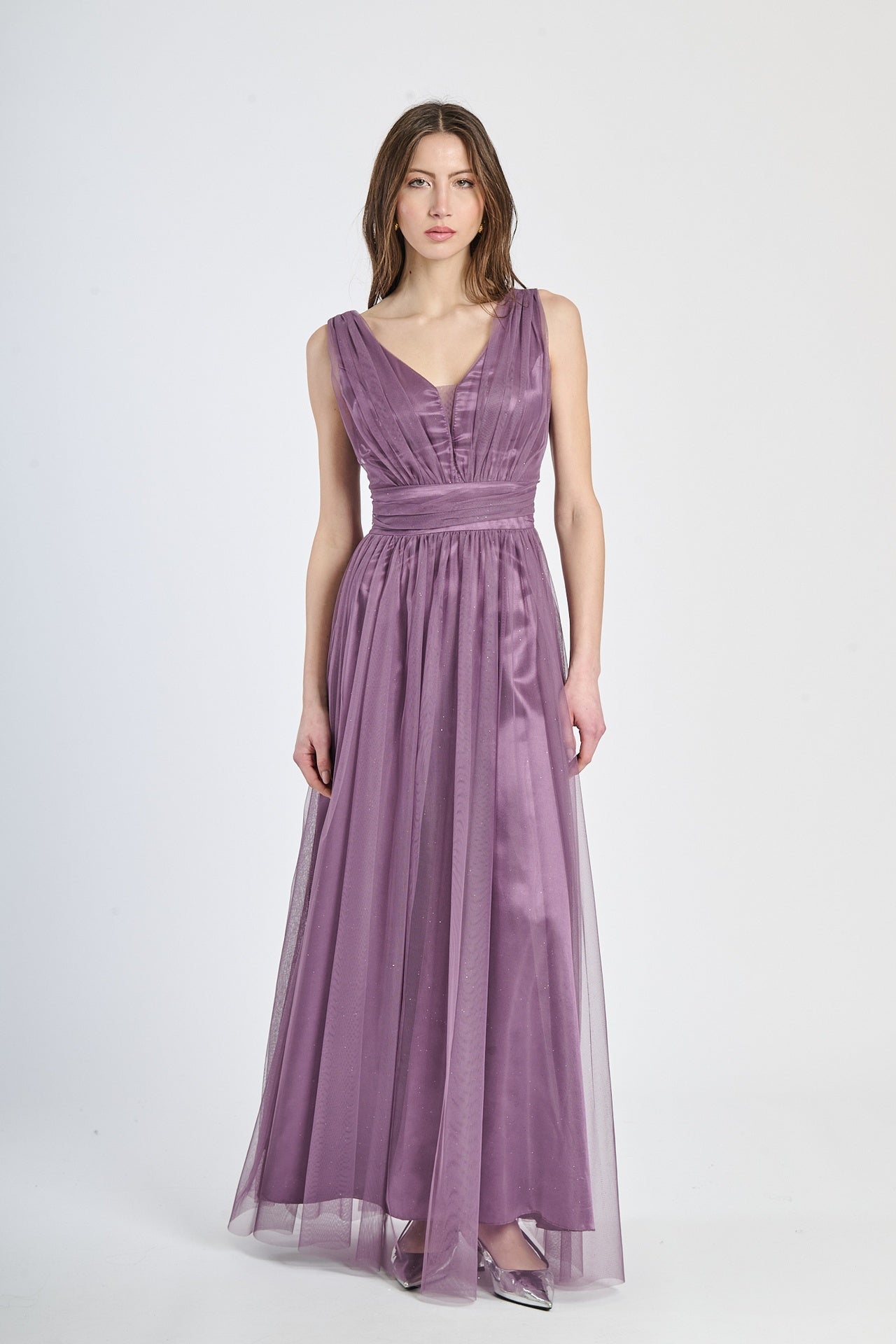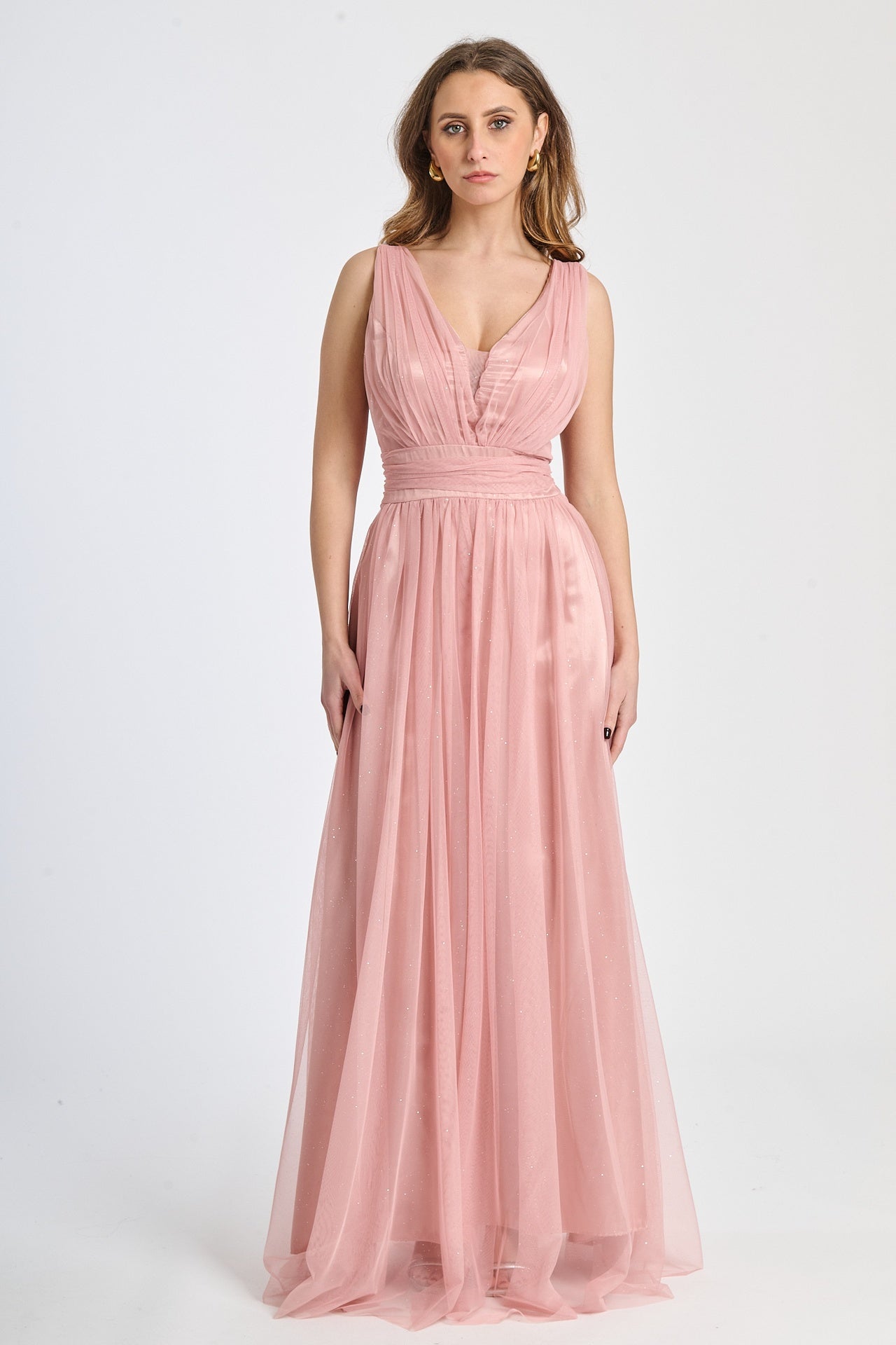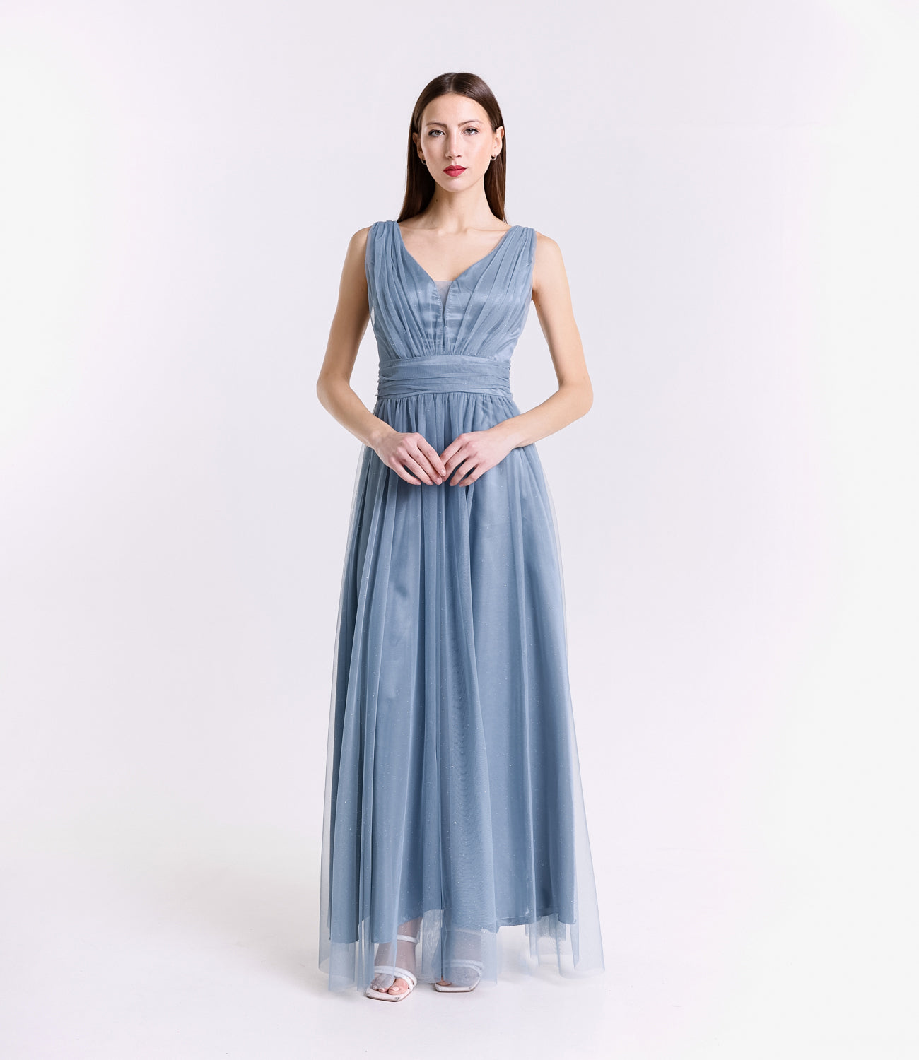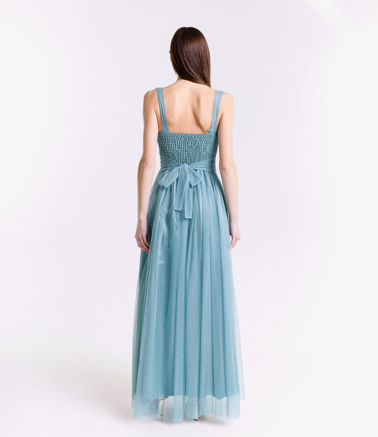 Lasciati incantare dalla grazia e dalla leggerezza di questo abito lungo, realizzato in morbido tulle, presenta una silhouette fluida e raffinata che scivola dolcemente sulla figura, valorizzando con eleganza ogni movimento.