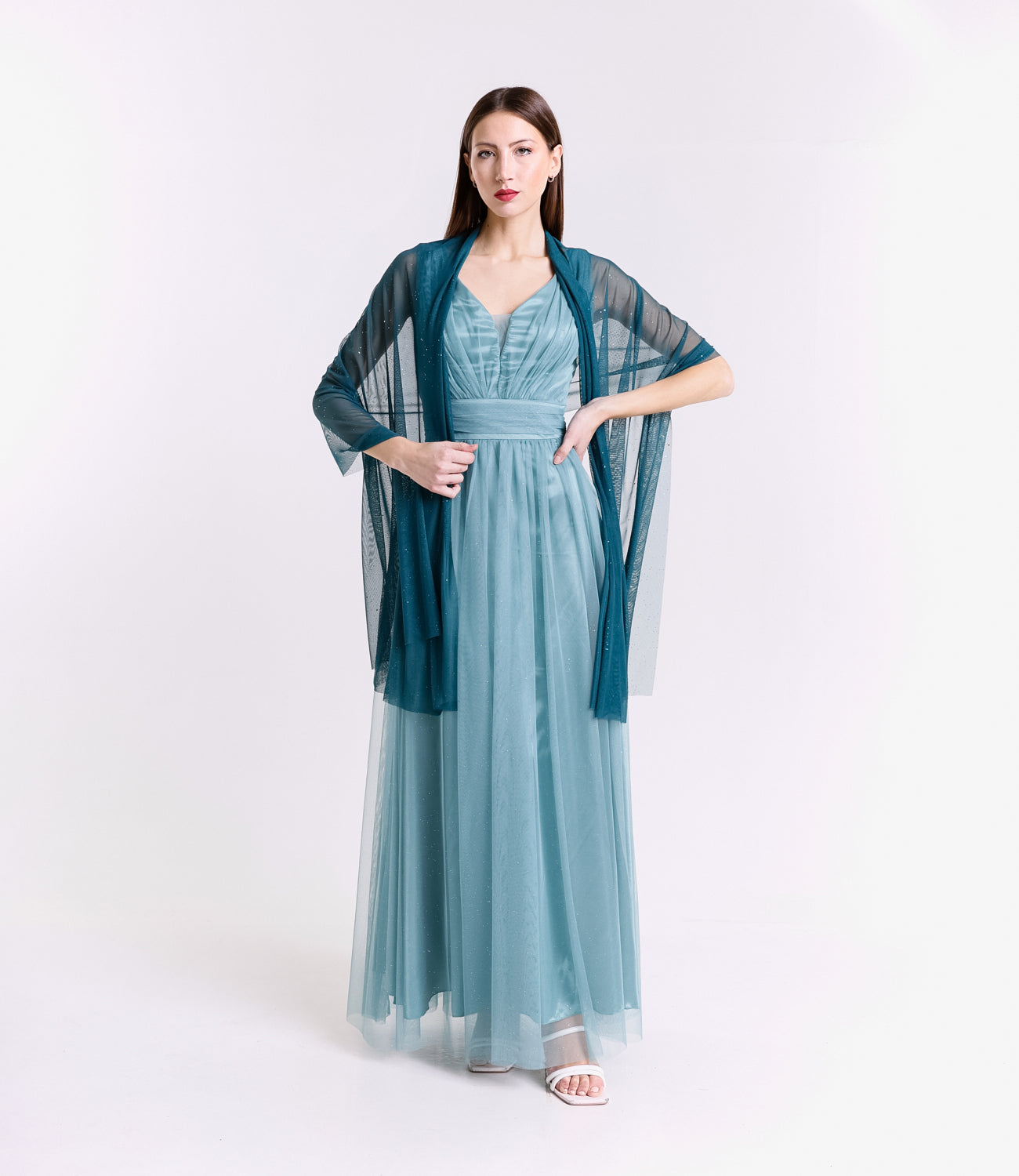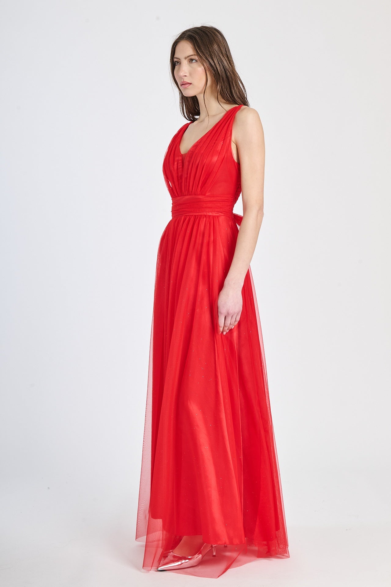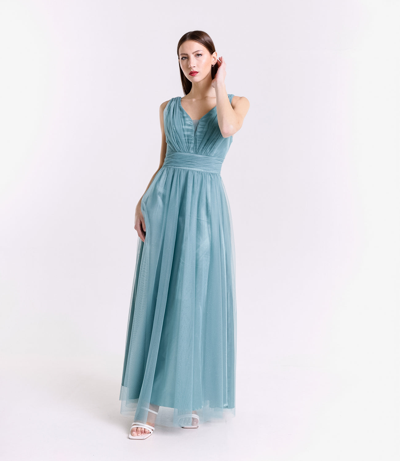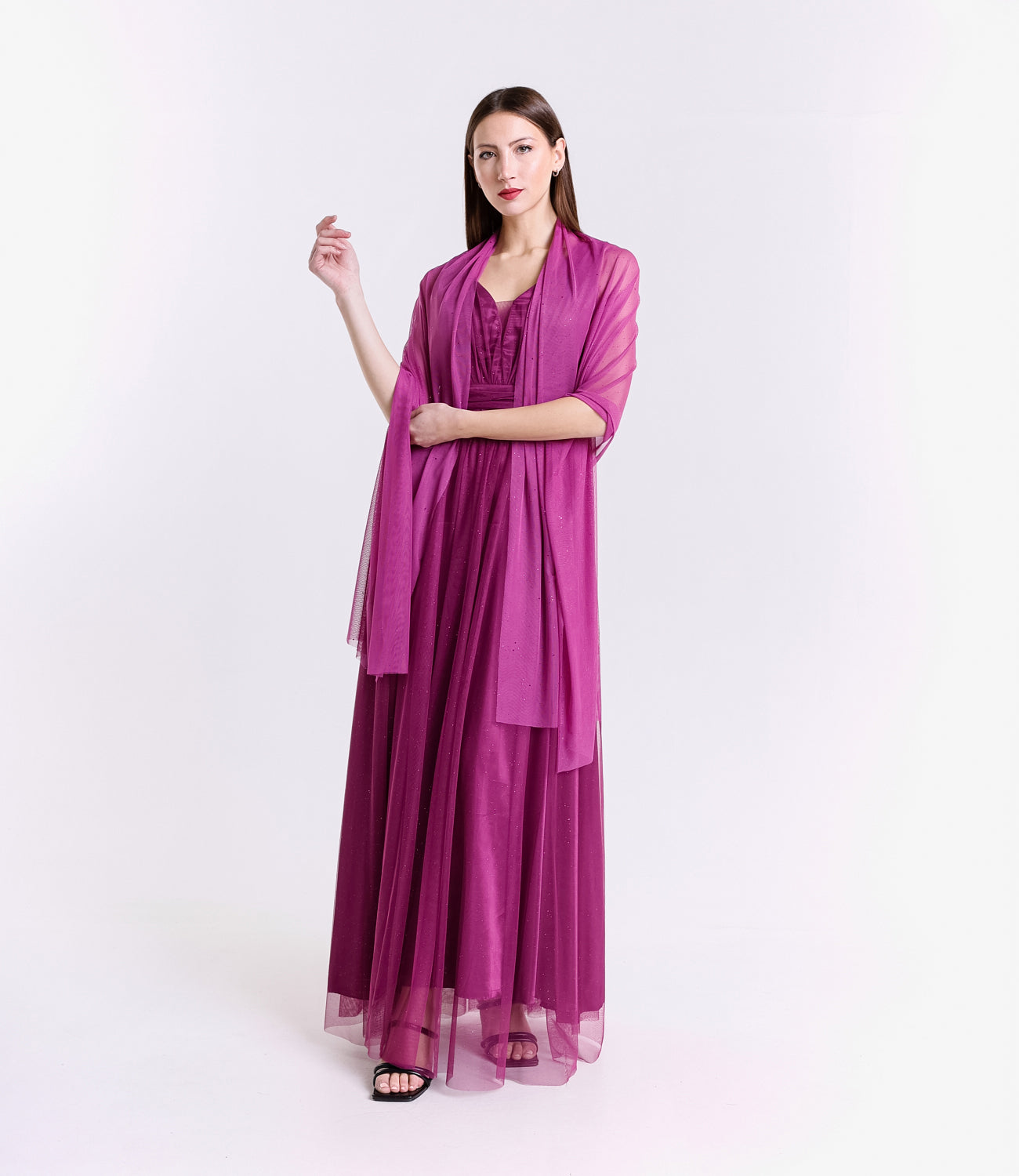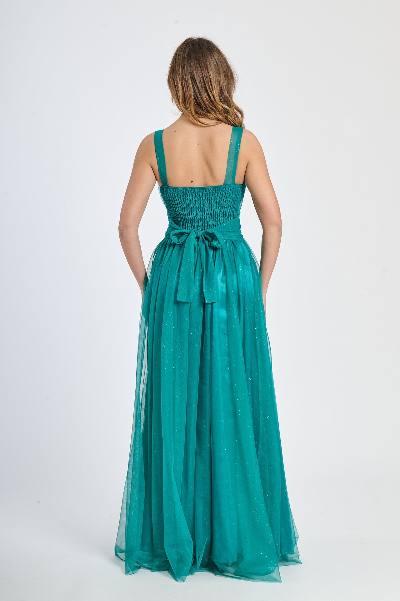 Lasciati incantare dalla grazia e dalla leggerezza di questo abito lungo, realizzato in morbido tulle, presenta una silhouette fluida e raffinata che scivola dolcemente sulla figura, valorizzando con eleganza ogni movimento.