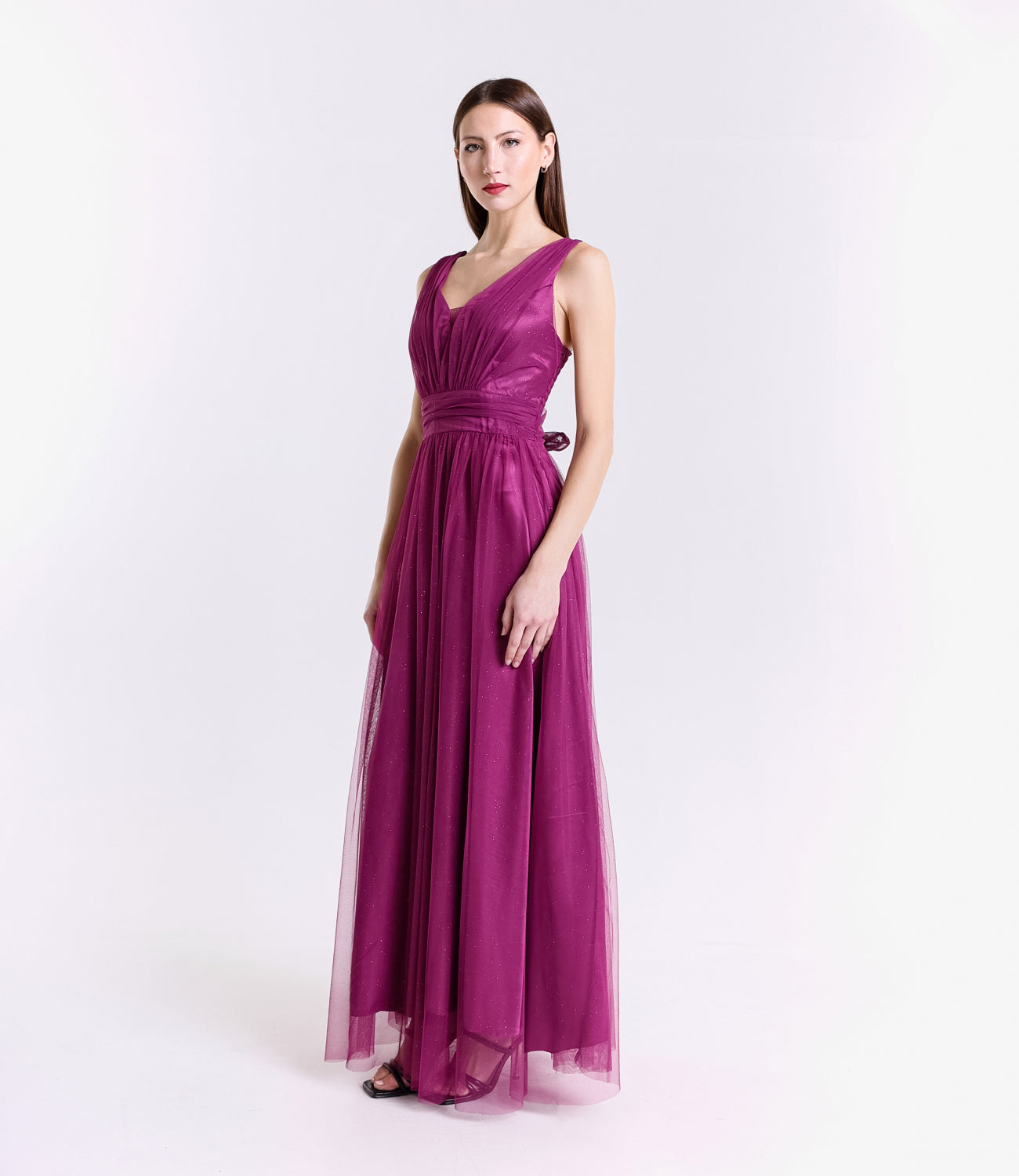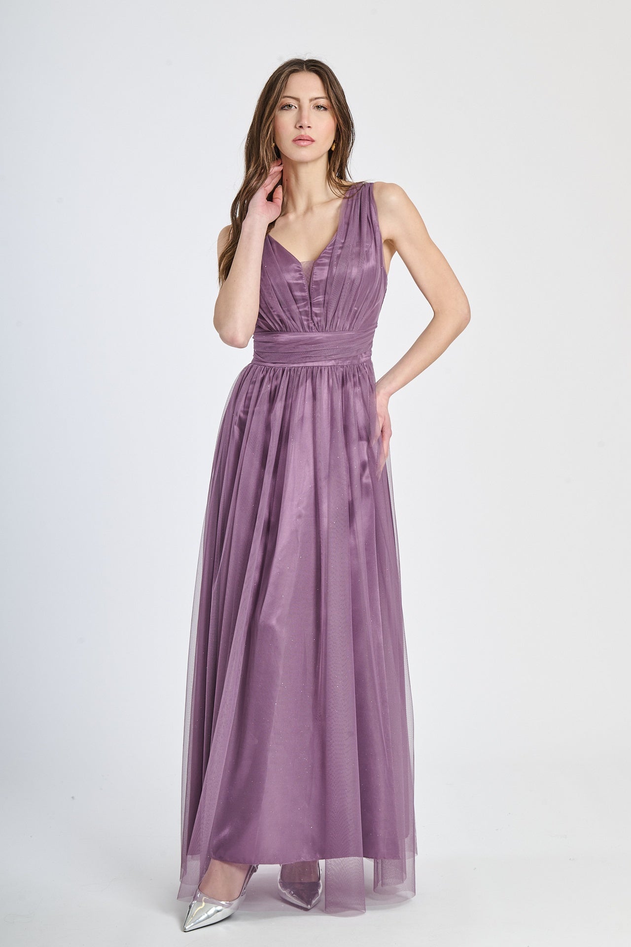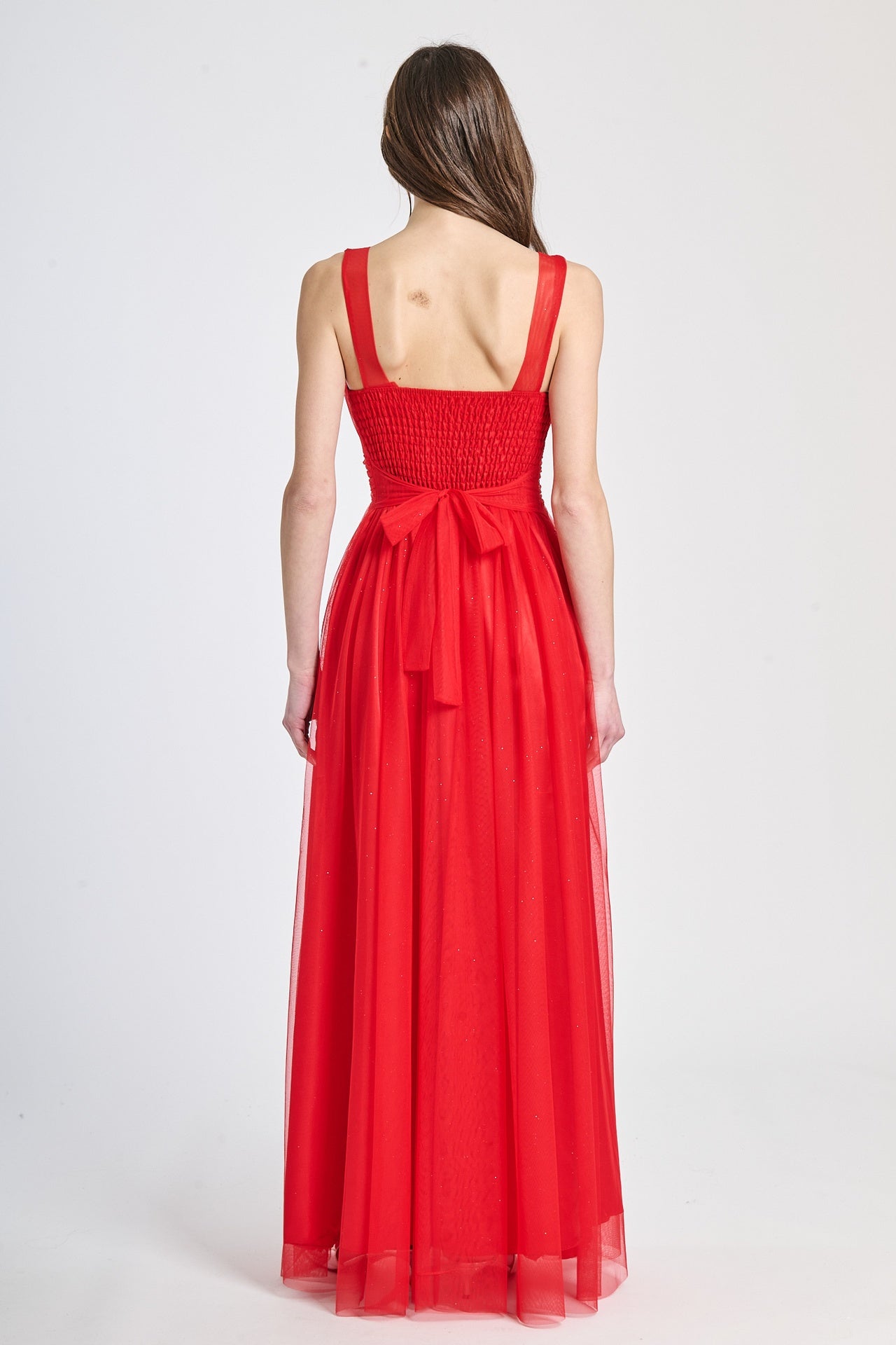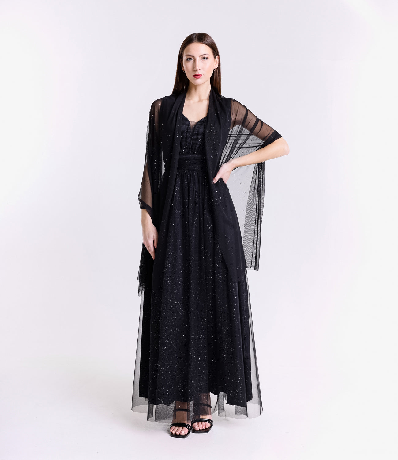 Lasciati incantare dalla grazia e dalla leggerezza di questo abito lungo, realizzato in morbido tulle, presenta una silhouette fluida e raffinata che scivola dolcemente sulla figura, valorizzando con eleganza ogni movimento.