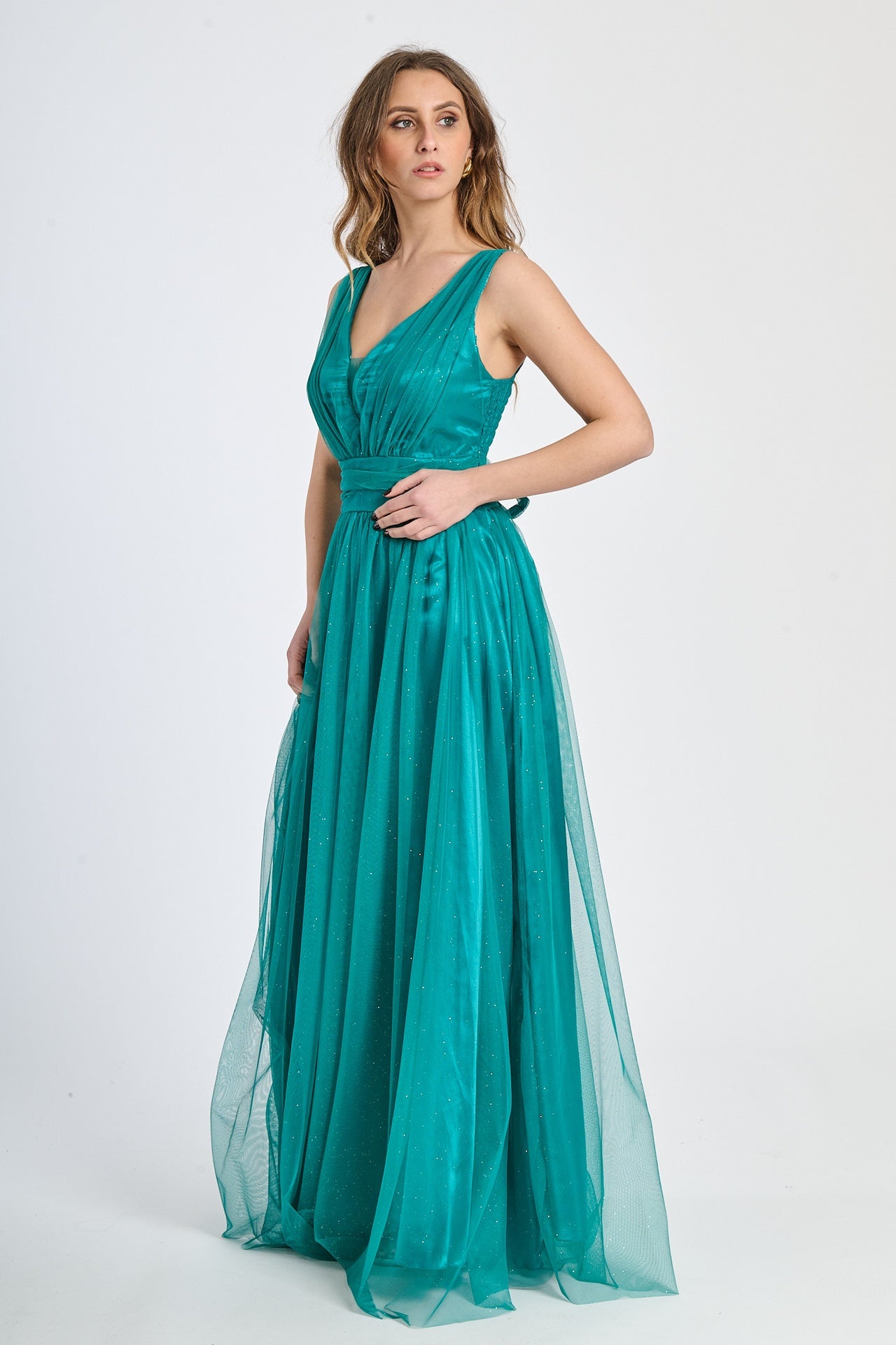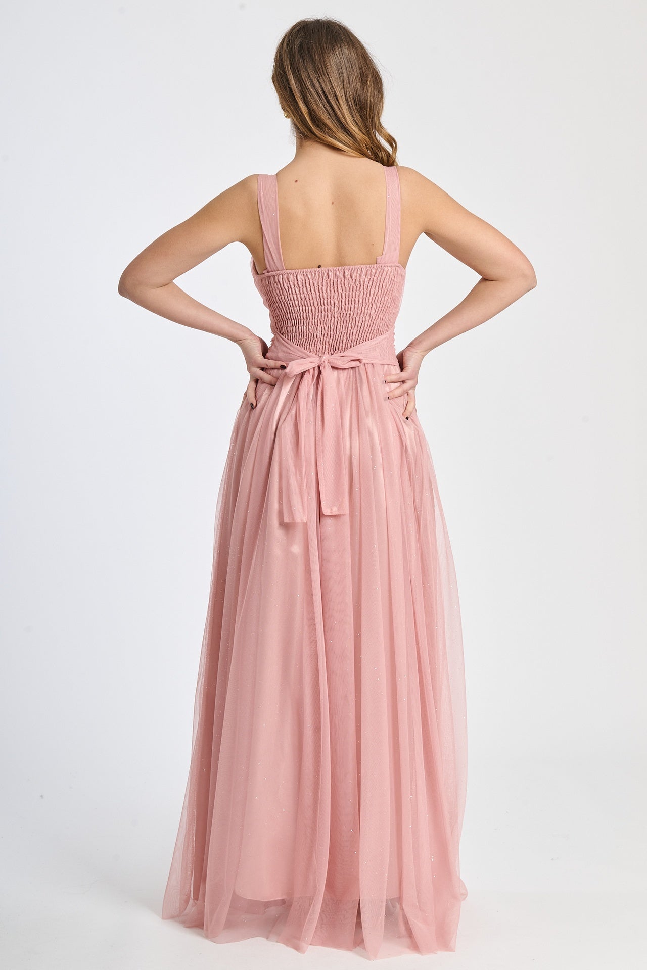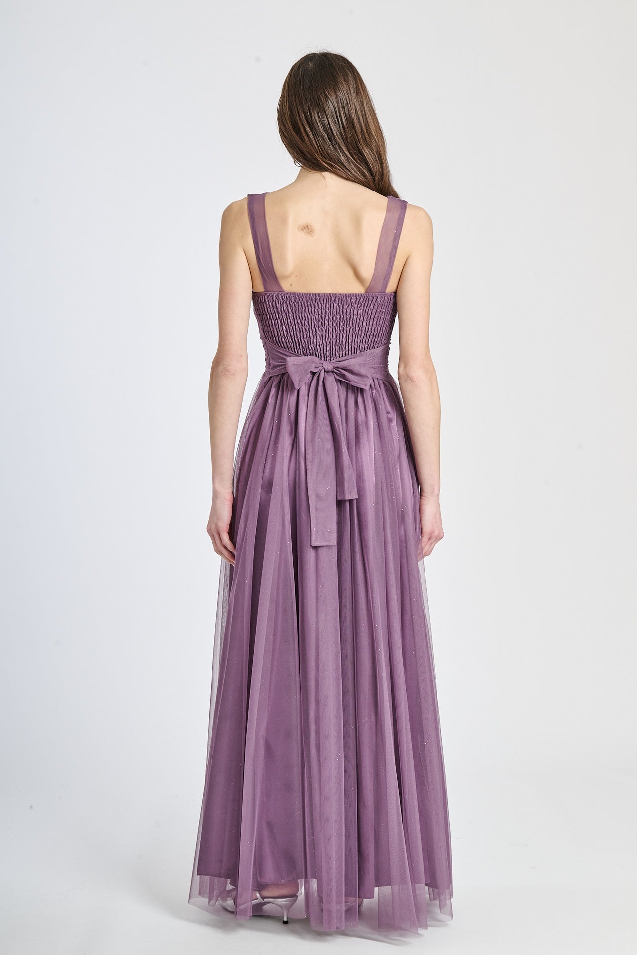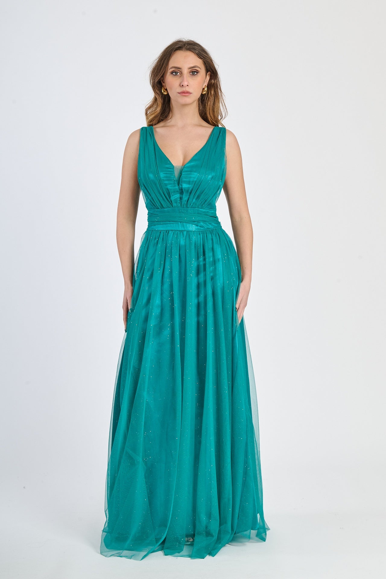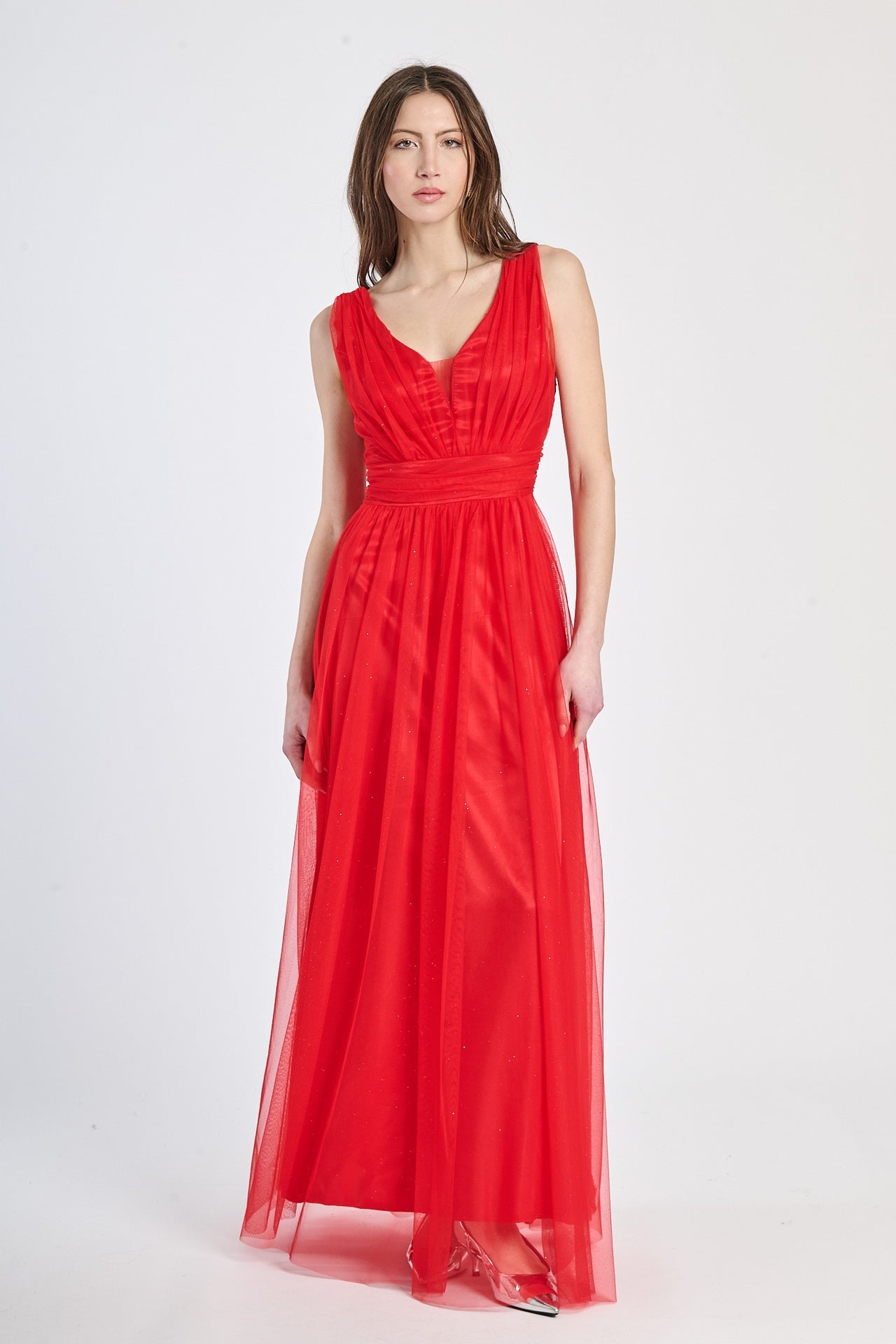 Lasciati incantare dalla grazia e dalla leggerezza di questo abito lungo, realizzato in morbido tulle, presenta una silhouette fluida e raffinata che scivola dolcemente sulla figura, valorizzando con eleganza ogni movimento.