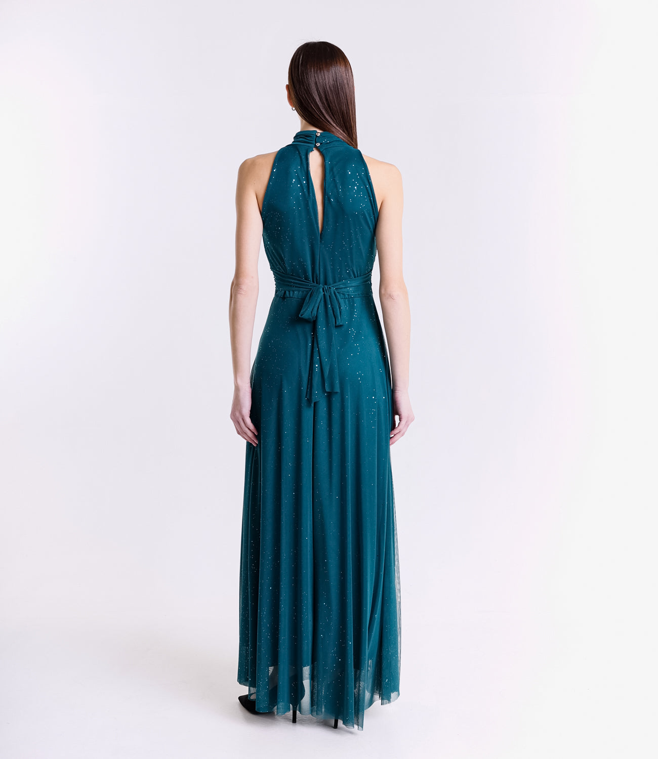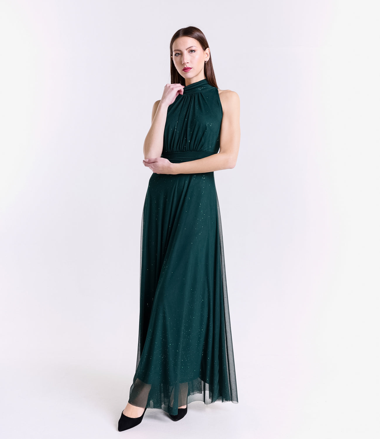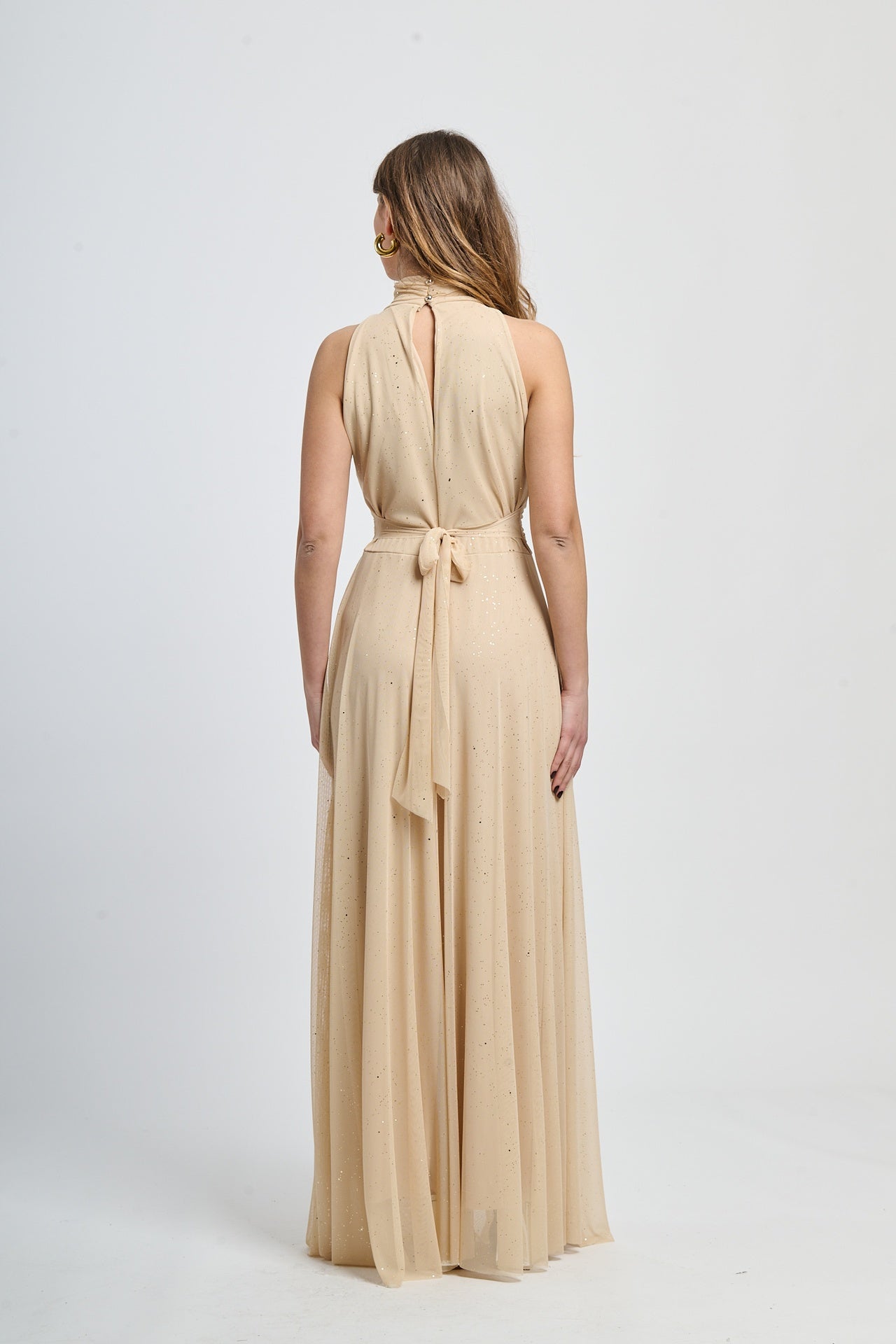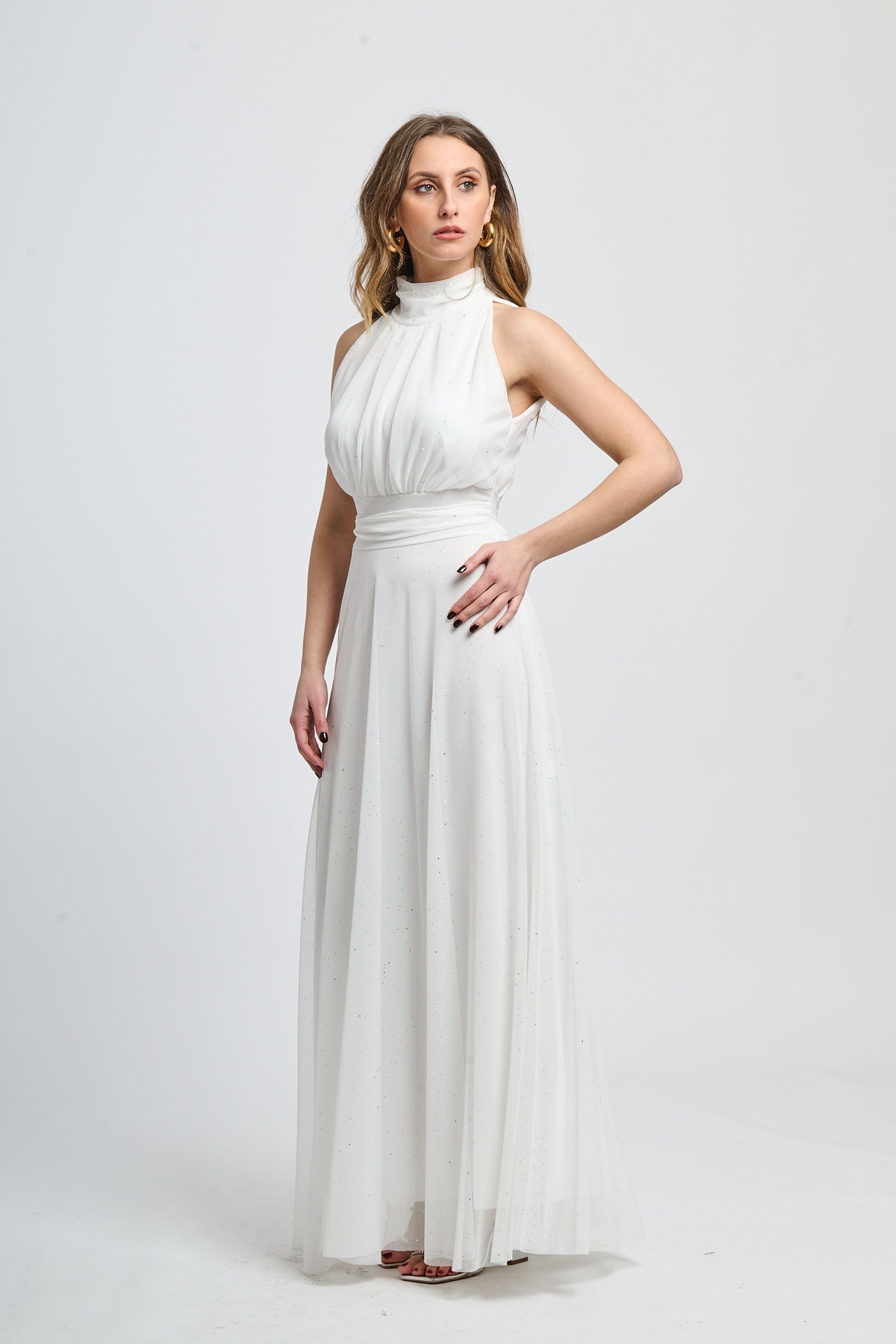 Questo abito con collo alto drappeggiato è la scelta ideale per chi desidera un look sofisticato e contemporaneo. Il corpetto presenta un elegante drappeggio che si unisce in un raffinato collo alto, mentre la vita segnata valorizza la silhouette. La gonna lunga in tulle leggero con applicazioni luminose dona movimento e un tocco di brillantezza discreta.