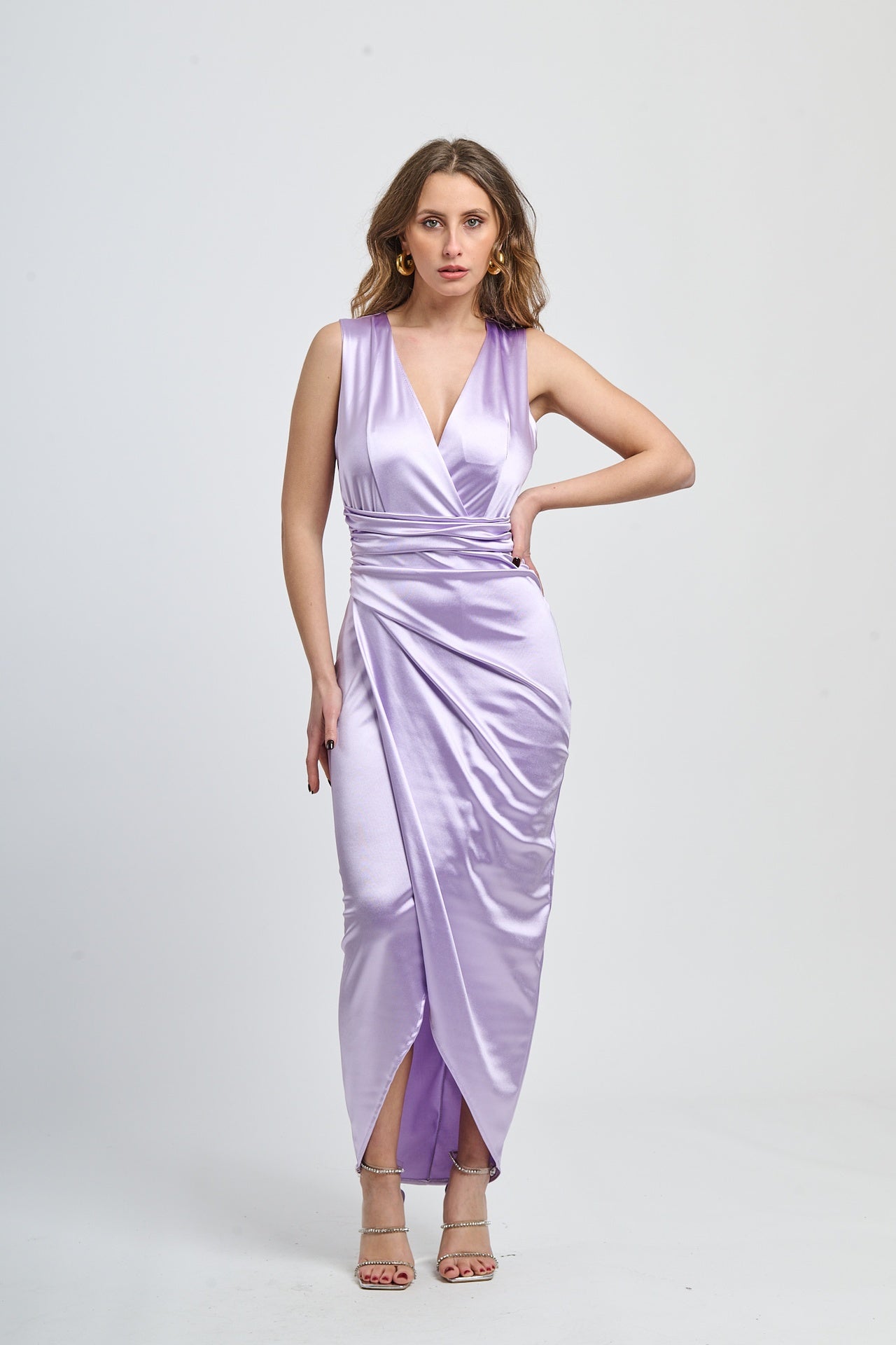 Scintillante e sofisticato, questo abito midi è pensato per catturare ogni sguardo. Il profondo scollo a V valorizza con grazia il décolleté, mentre il drappeggio laterale crea un effetto snellente che modella la silhouette in modo naturale. La gonna asimmetrica con spacco frontale aggiunge un tocco seducente senza rinunciare all’eleganza.