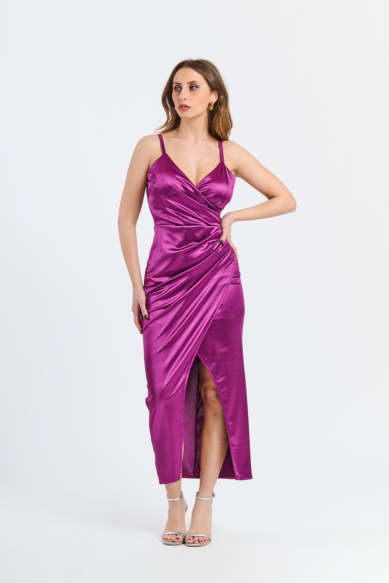 Abito lungo in raso lucido con scollo a V incrociato, drappeggio laterale e spalline sottili.