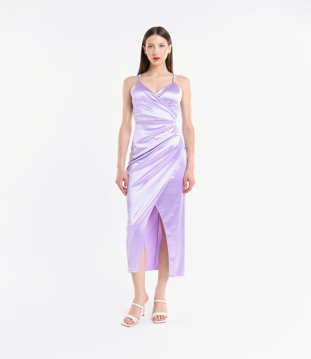 Raffinato e sensuale, questo abito lungo satinato è pensato per chi ama farsi notare con classe. Il corpetto incrociato valorizza il décolleté, mentre il drappeggio laterale e lo spacco frontale donano movimento e femminilità.