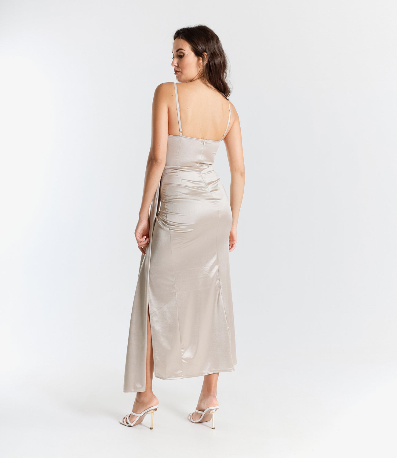 La scollatura a cuore e le spalline sottili sottolineano con grazia il décolleté, mentre lo spacco profondo sulla gamba aggiunge un tocco di sensualità che conquista al primo sguardo.