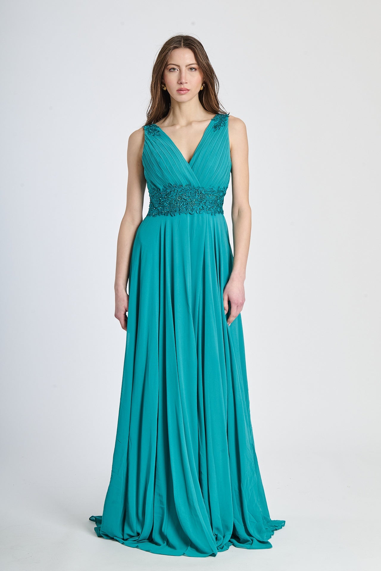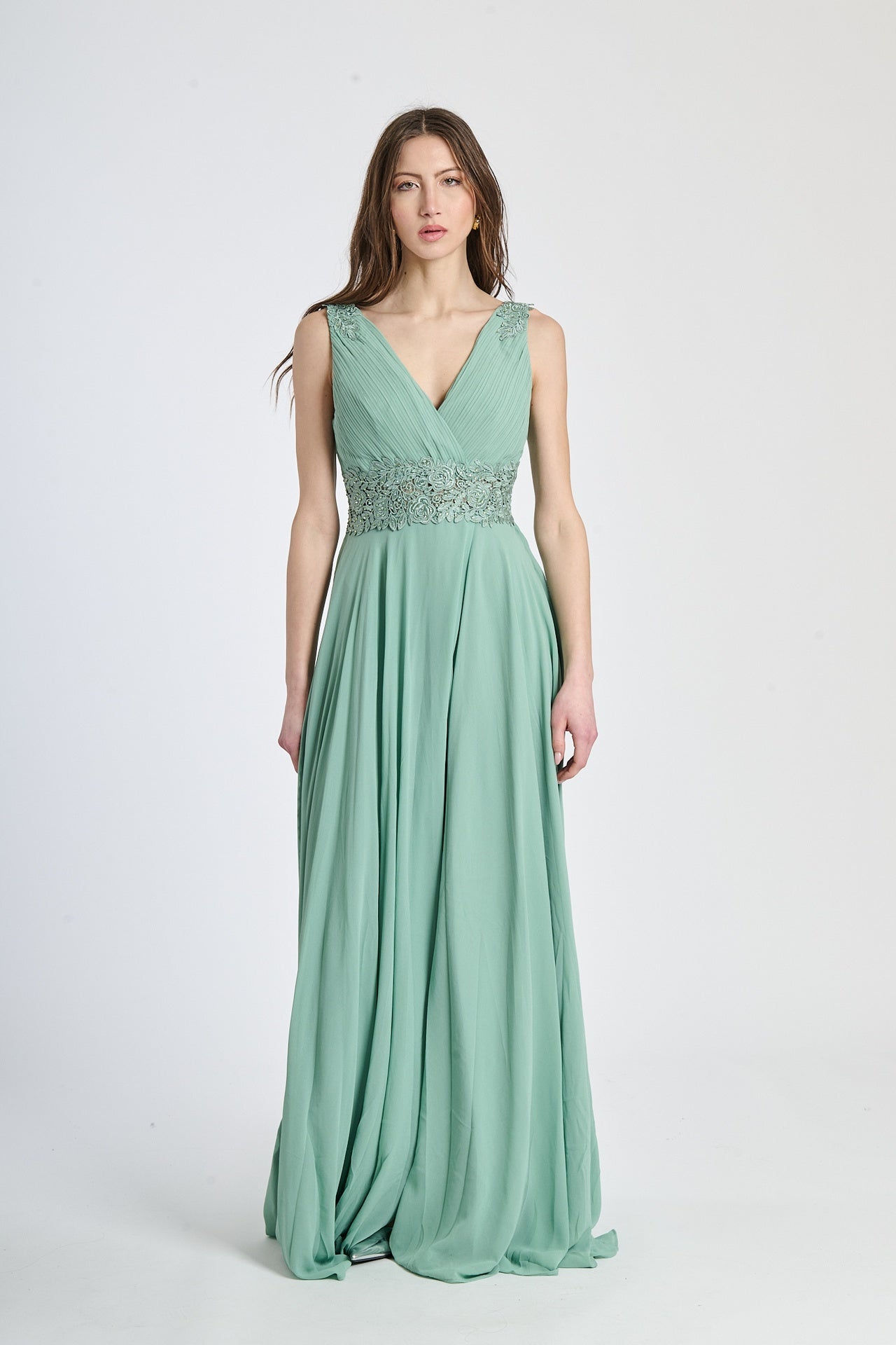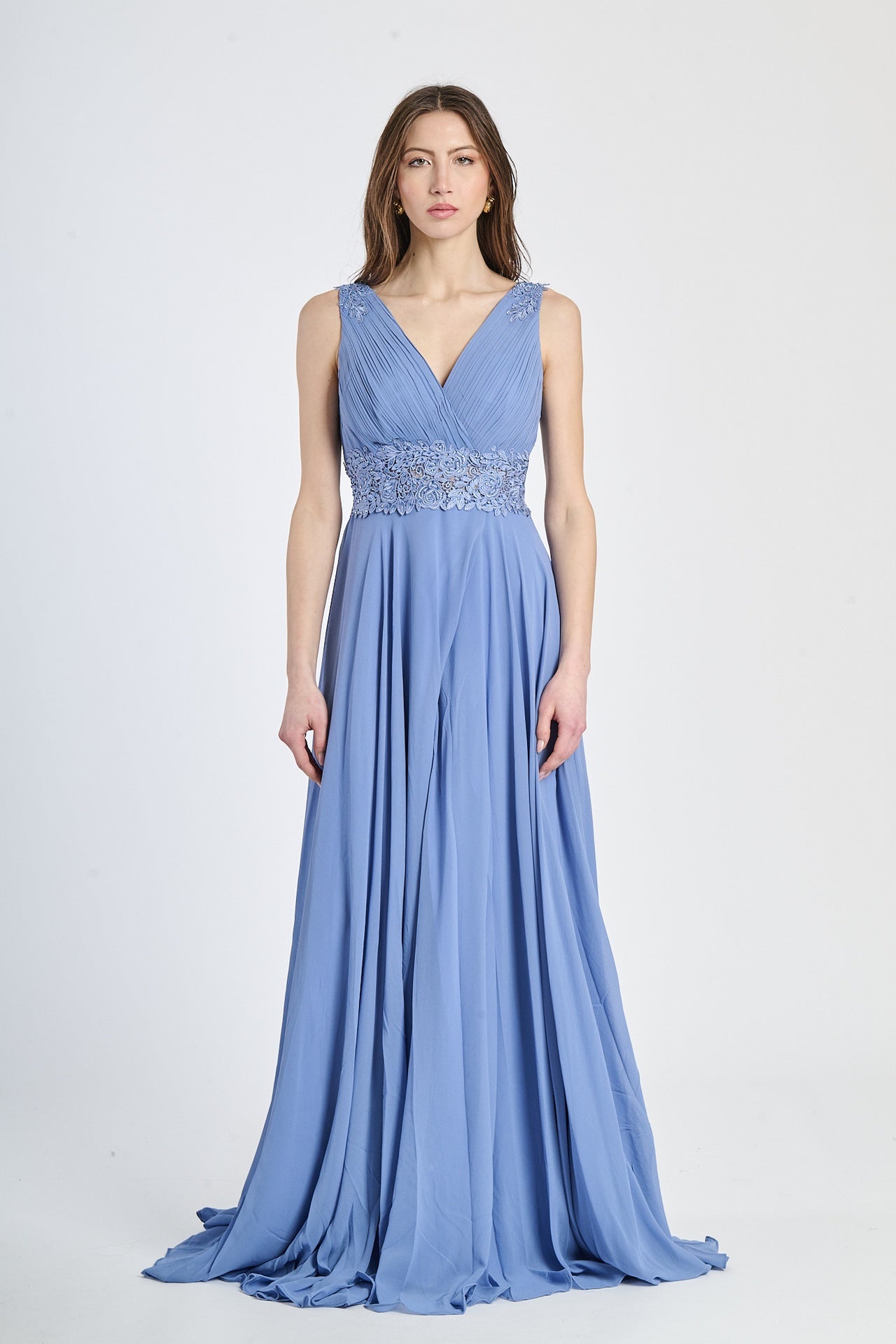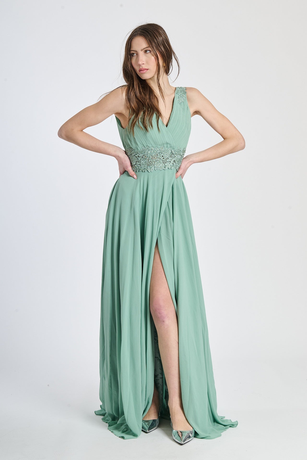 Lasciati conquistare dal fascino senza tempo di questo abito lungo, perfetto per cerimonie, gala o serate da sogno. Il corpino in pizzo ricamato valorizza il décolleté con eleganza, mentre lo scollo a V dona slancio alla figura. La gonna ampia in chiffon scivola fluida ad ogni passo, creando un effetto etereo e principesco.