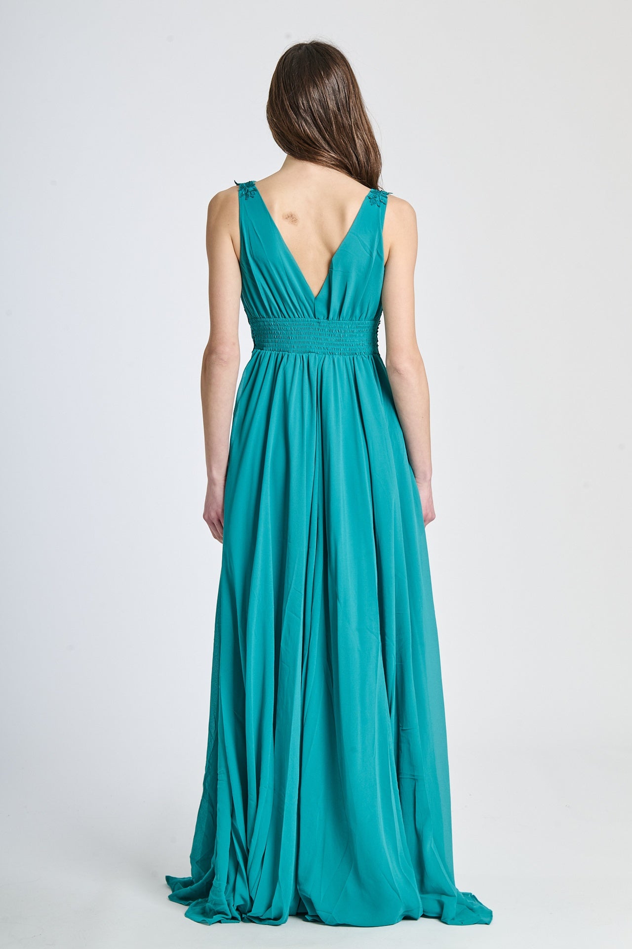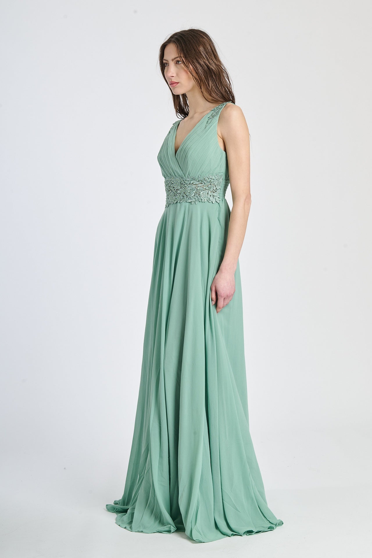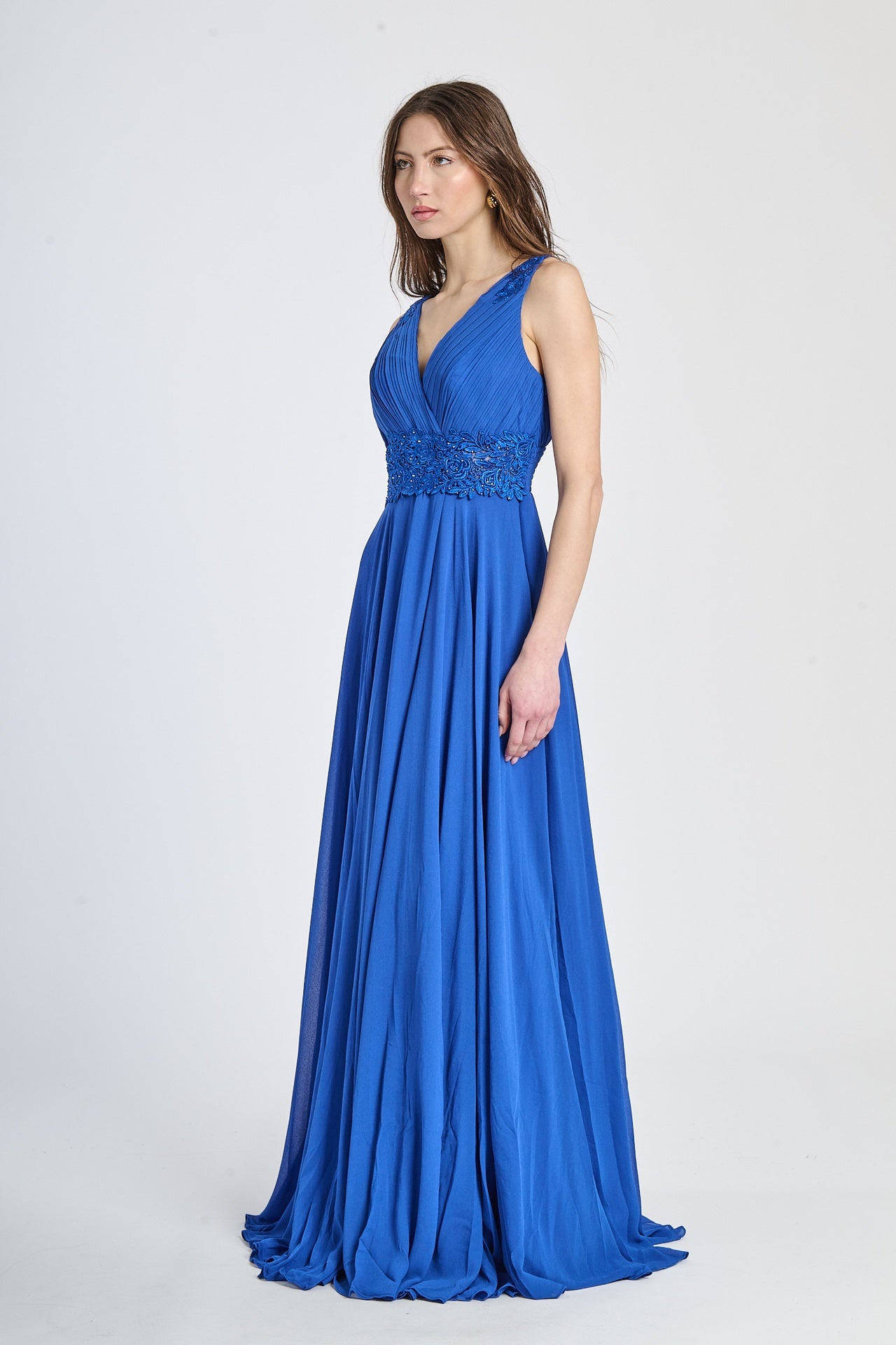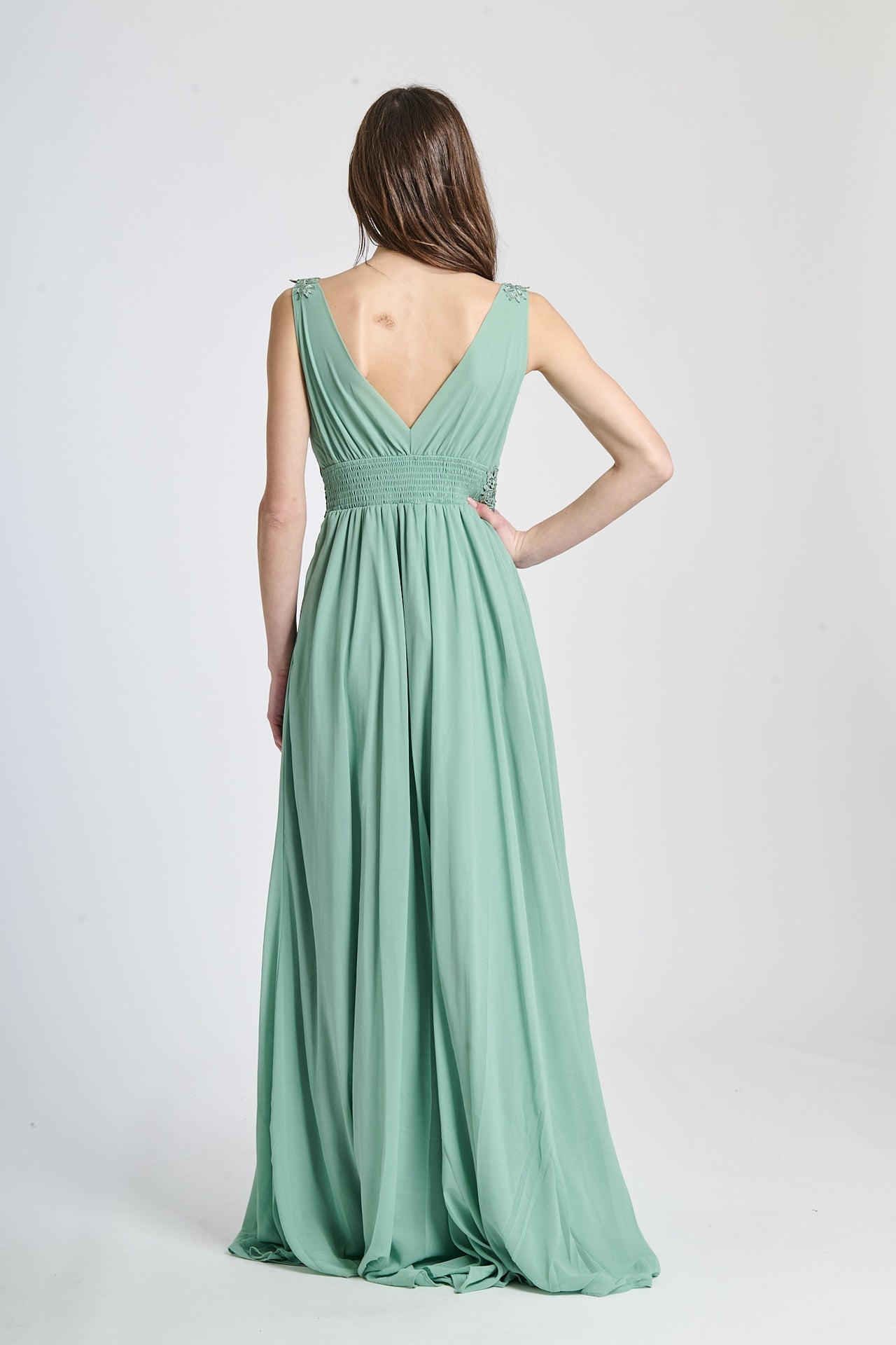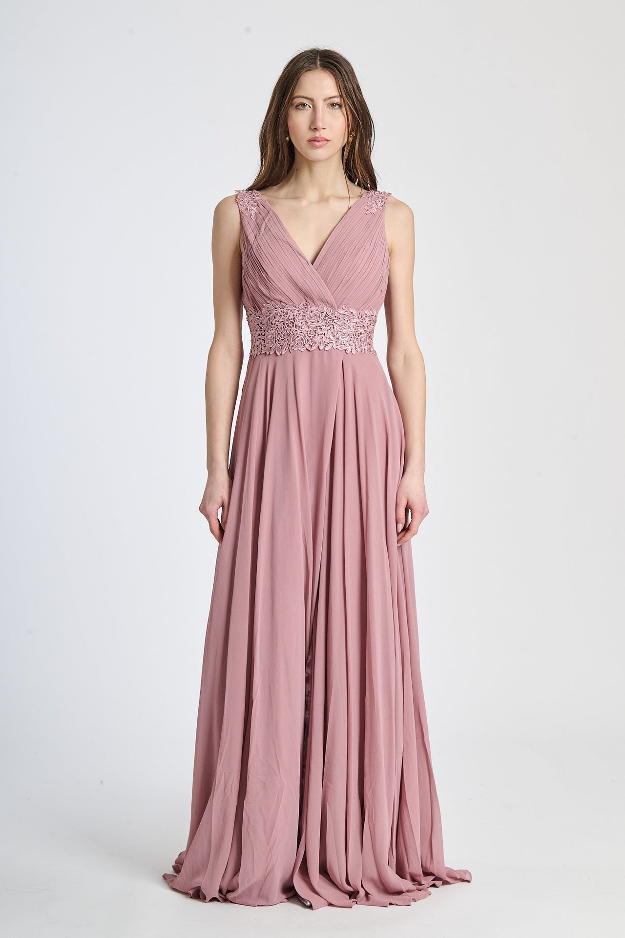 Lasciati conquistare dal fascino senza tempo di questo abito lungo, perfetto per cerimonie, gala o serate da sogno. Il corpino in pizzo ricamato valorizza il décolleté con eleganza, mentre lo scollo a V dona slancio alla figura. La gonna ampia in chiffon scivola fluida ad ogni passo, creando un effetto etereo e principesco.