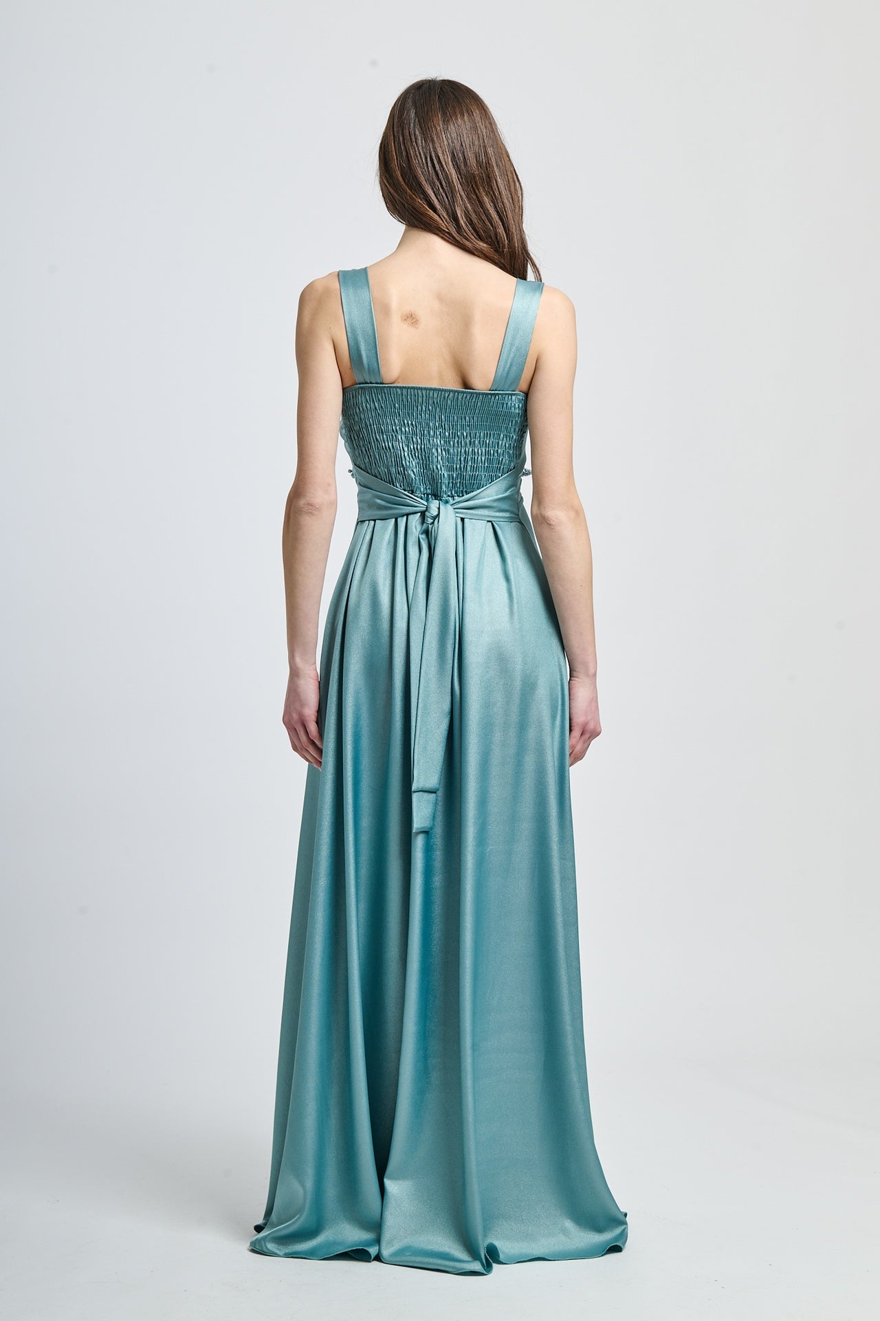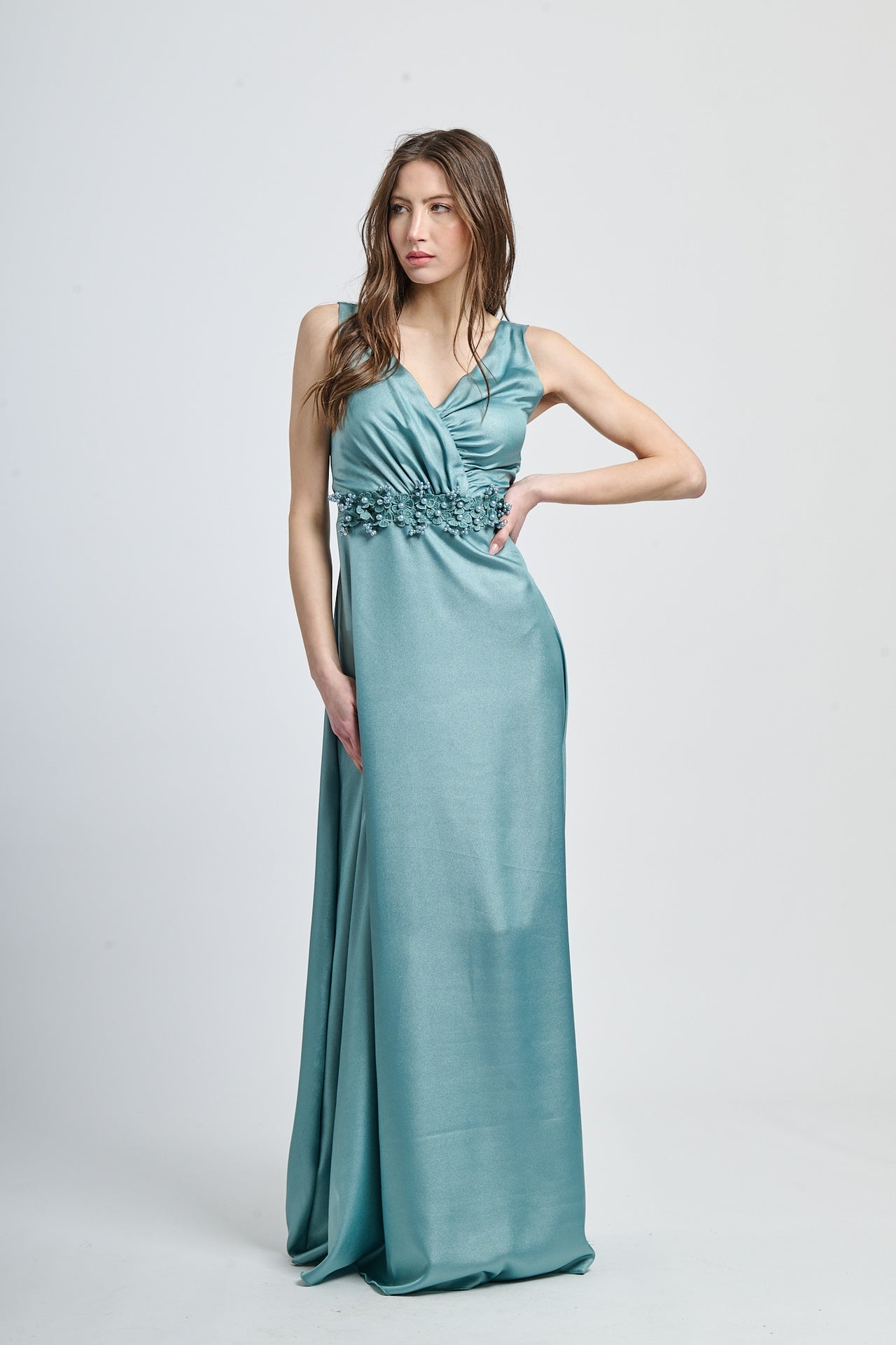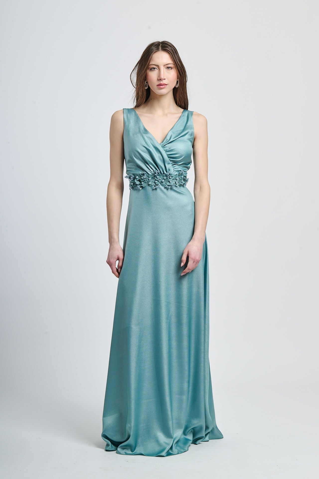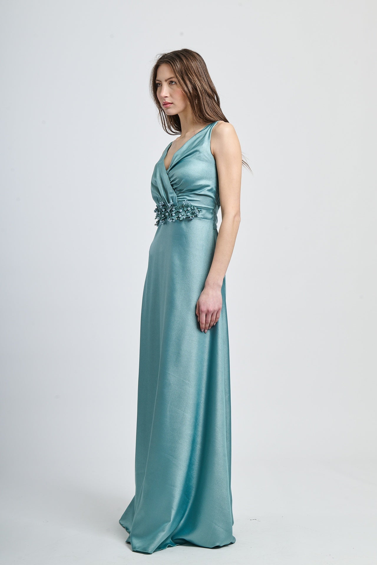 Lasciati avvolgere dal fascino delicato di questo abito lungo in raso color celeste. Il tessuto morbido e luminoso accarezza le forme con grazia, mentre il corpino drappeggiato con scollo a V valorizza il décolleté con eleganza. Il punto vita è impreziosito da un raffinato dettaglio floreale tono su tono, che dona un tocco romantico e sofisticato. La gonna ampia e fluida scivola leggera fino al pavimento, regalando un movimento armonioso ad ogni passo.
