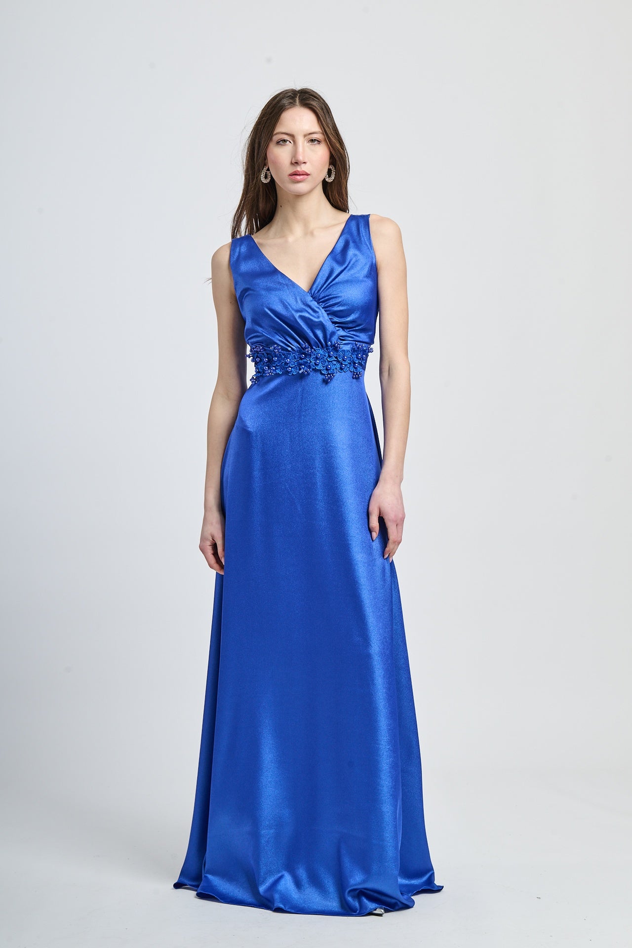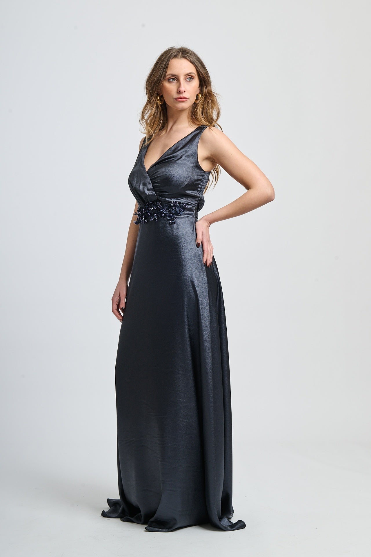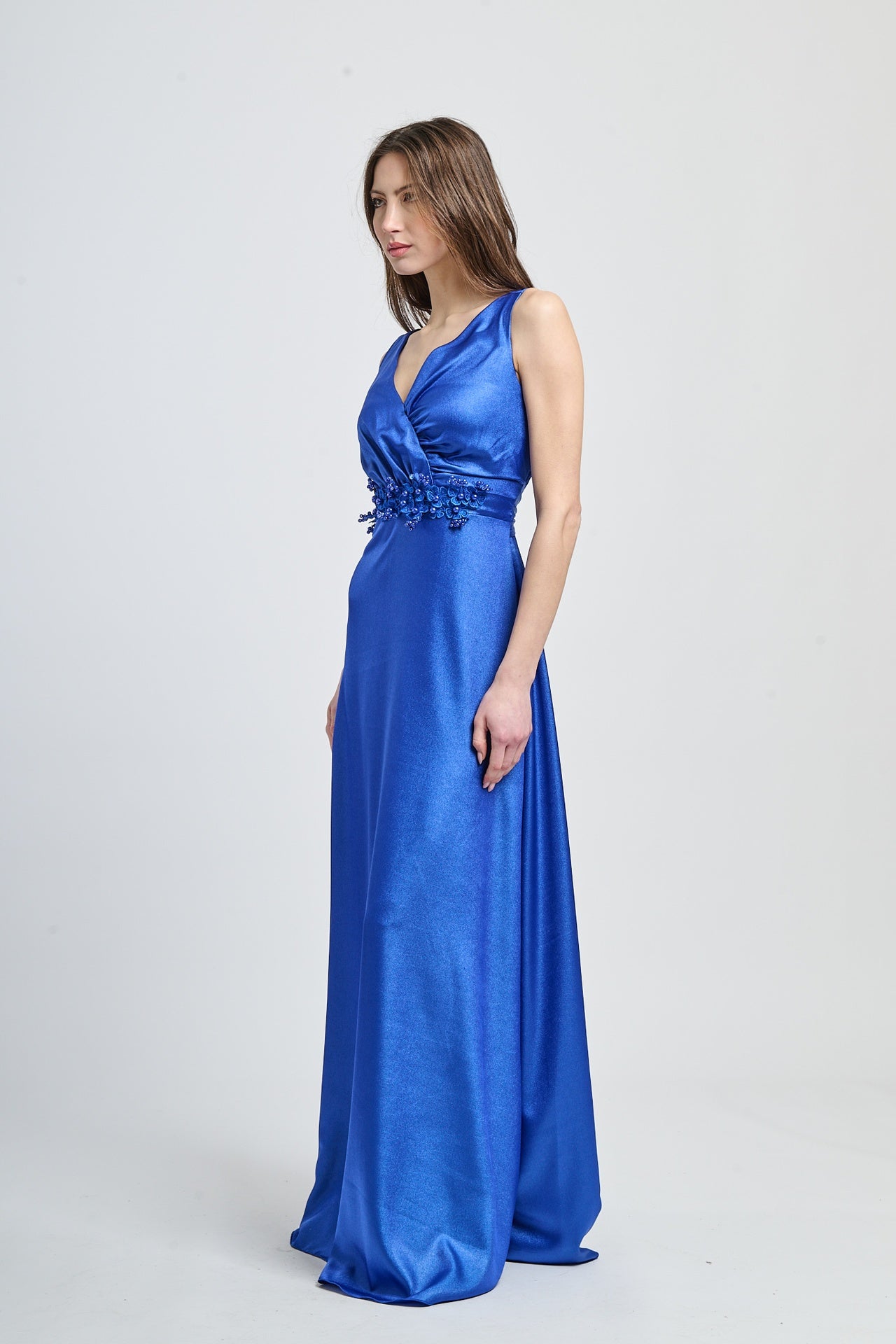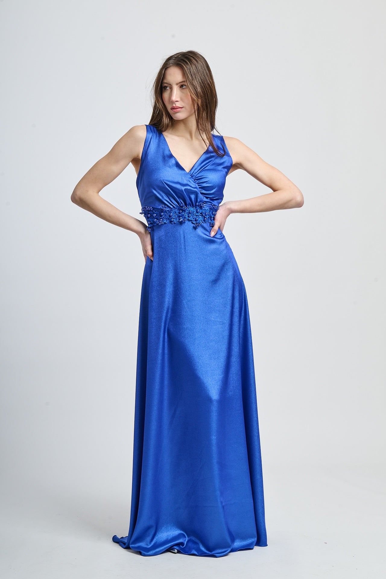 Lasciati avvolgere dal fascino delicato di questo abito lungo in raso color celeste. Il tessuto morbido e luminoso accarezza le forme con grazia, mentre il corpino drappeggiato con scollo a V valorizza il décolleté con eleganza. Il punto vita è impreziosito da un raffinato dettaglio floreale tono su tono, che dona un tocco romantico e sofisticato. La gonna ampia e fluida scivola leggera fino al pavimento, regalando un movimento armonioso ad ogni passo.