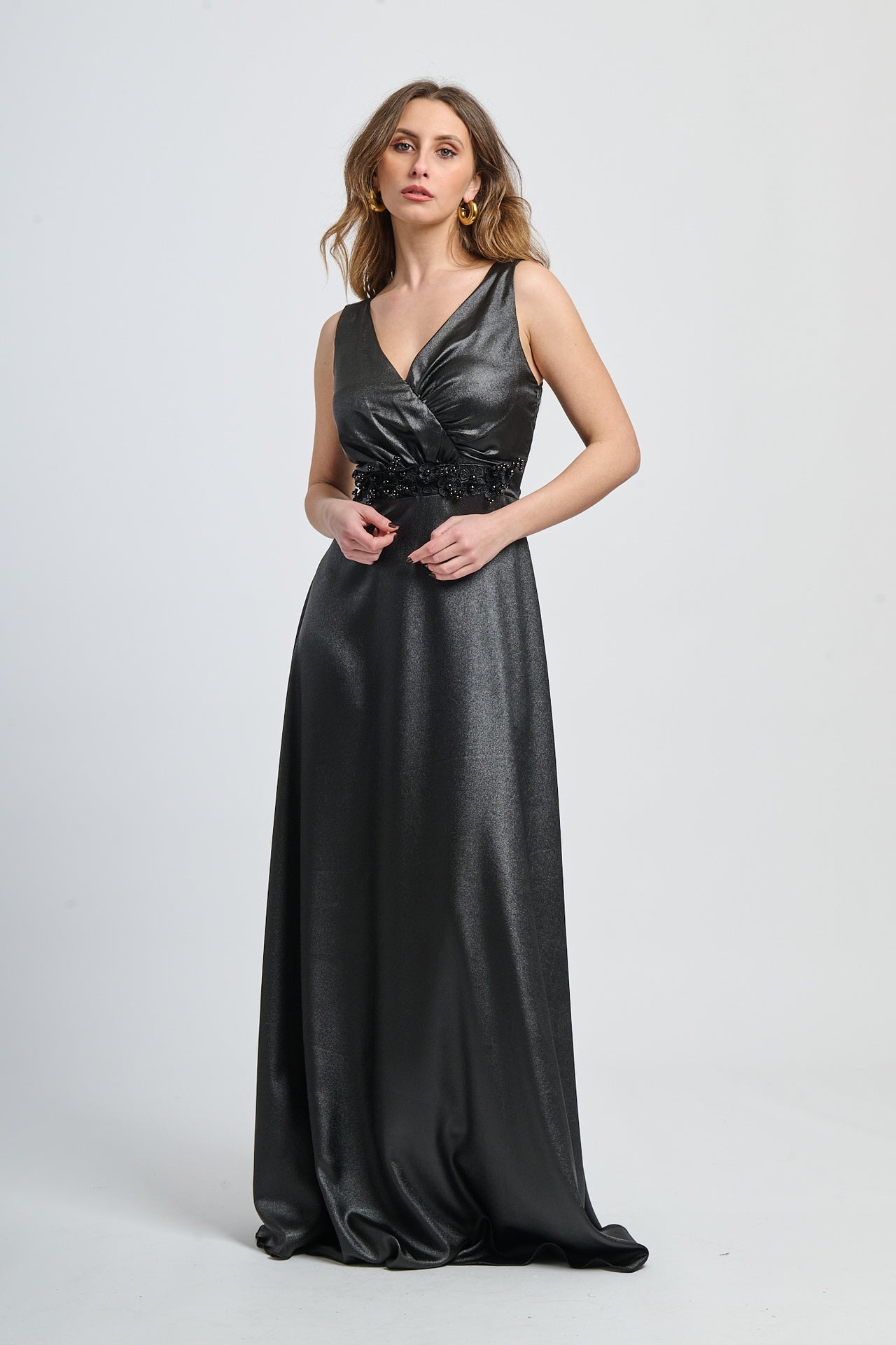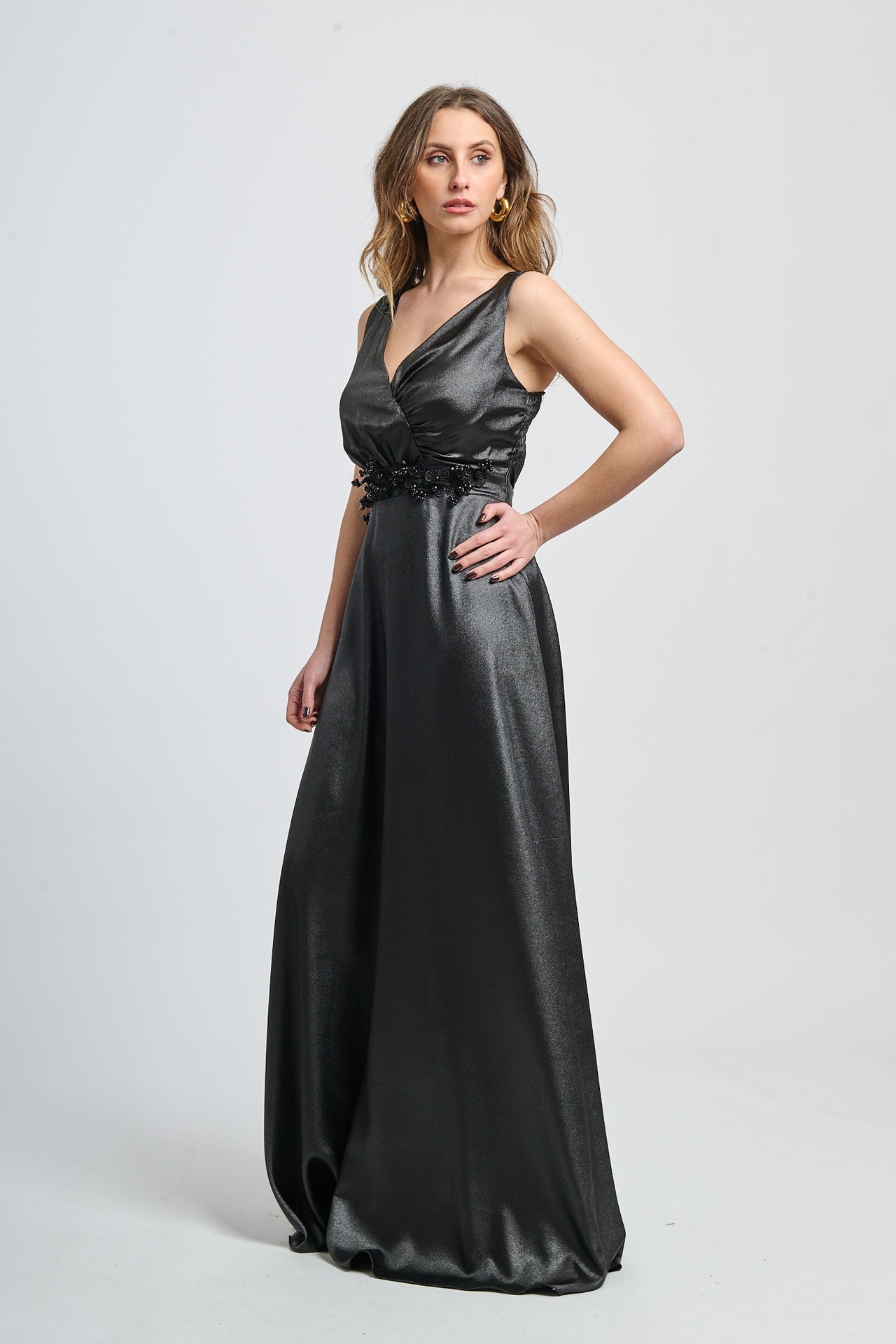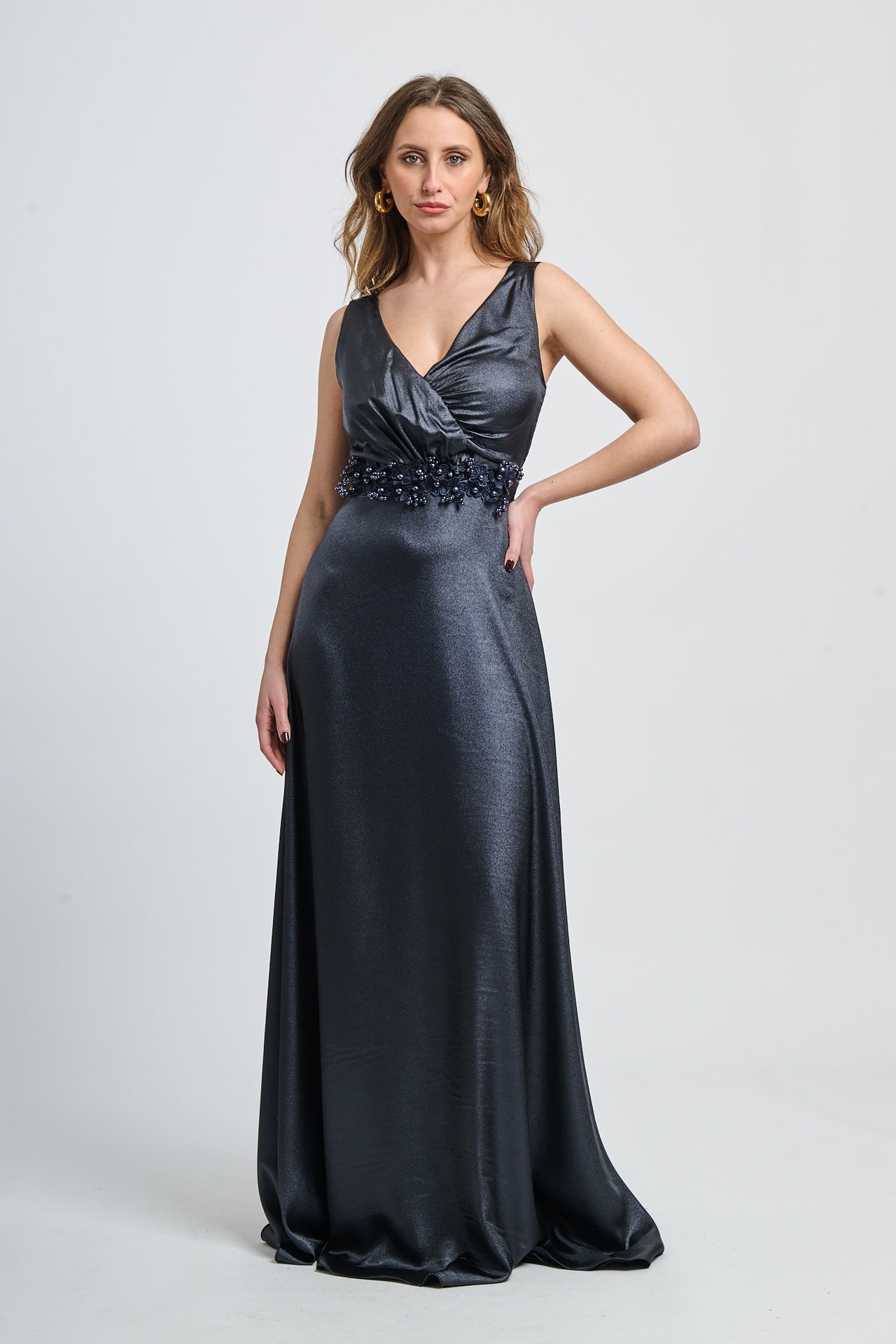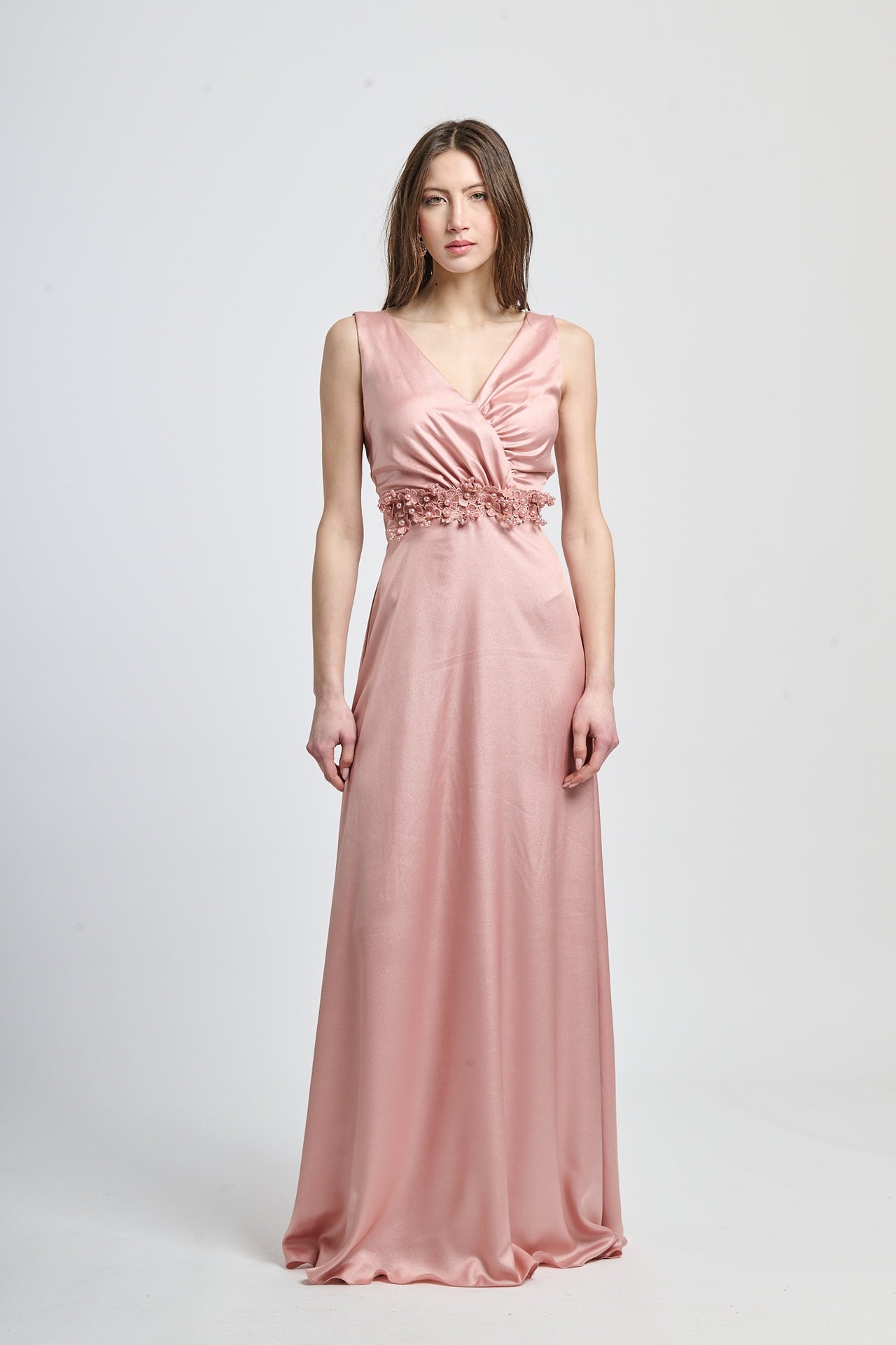 Lasciati avvolgere dal fascino delicato di questo abito lungo in raso color celeste. Il tessuto morbido e luminoso accarezza le forme con grazia, mentre il corpino drappeggiato con scollo a V valorizza il décolleté con eleganza. Il punto vita è impreziosito da un raffinato dettaglio floreale tono su tono, che dona un tocco romantico e sofisticato. La gonna ampia e fluida scivola leggera fino al pavimento, regalando un movimento armonioso ad ogni passo.