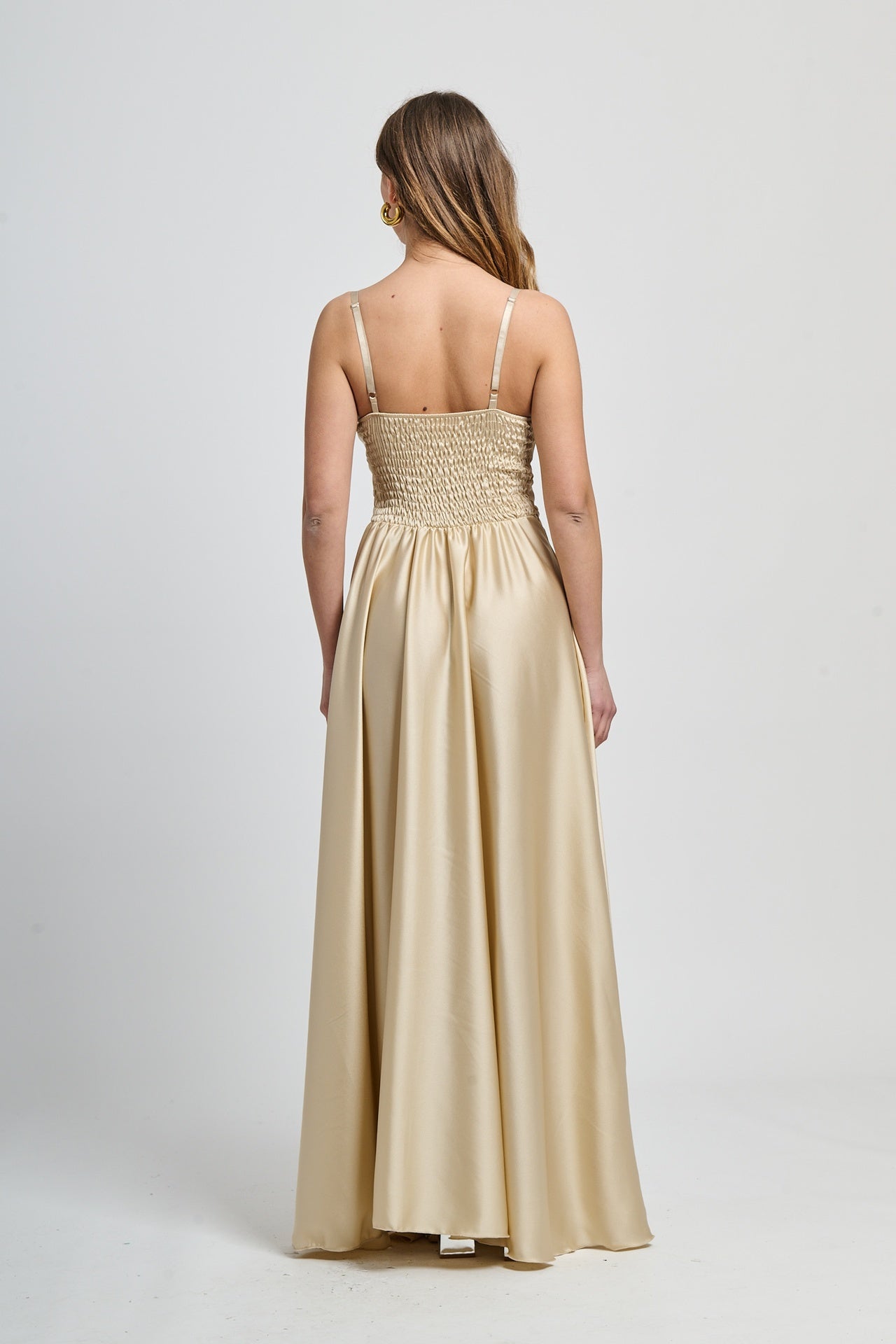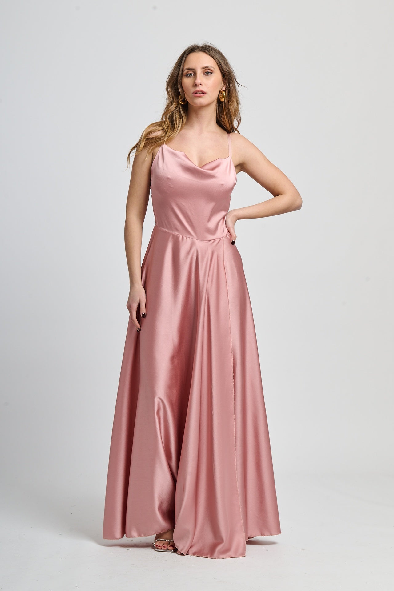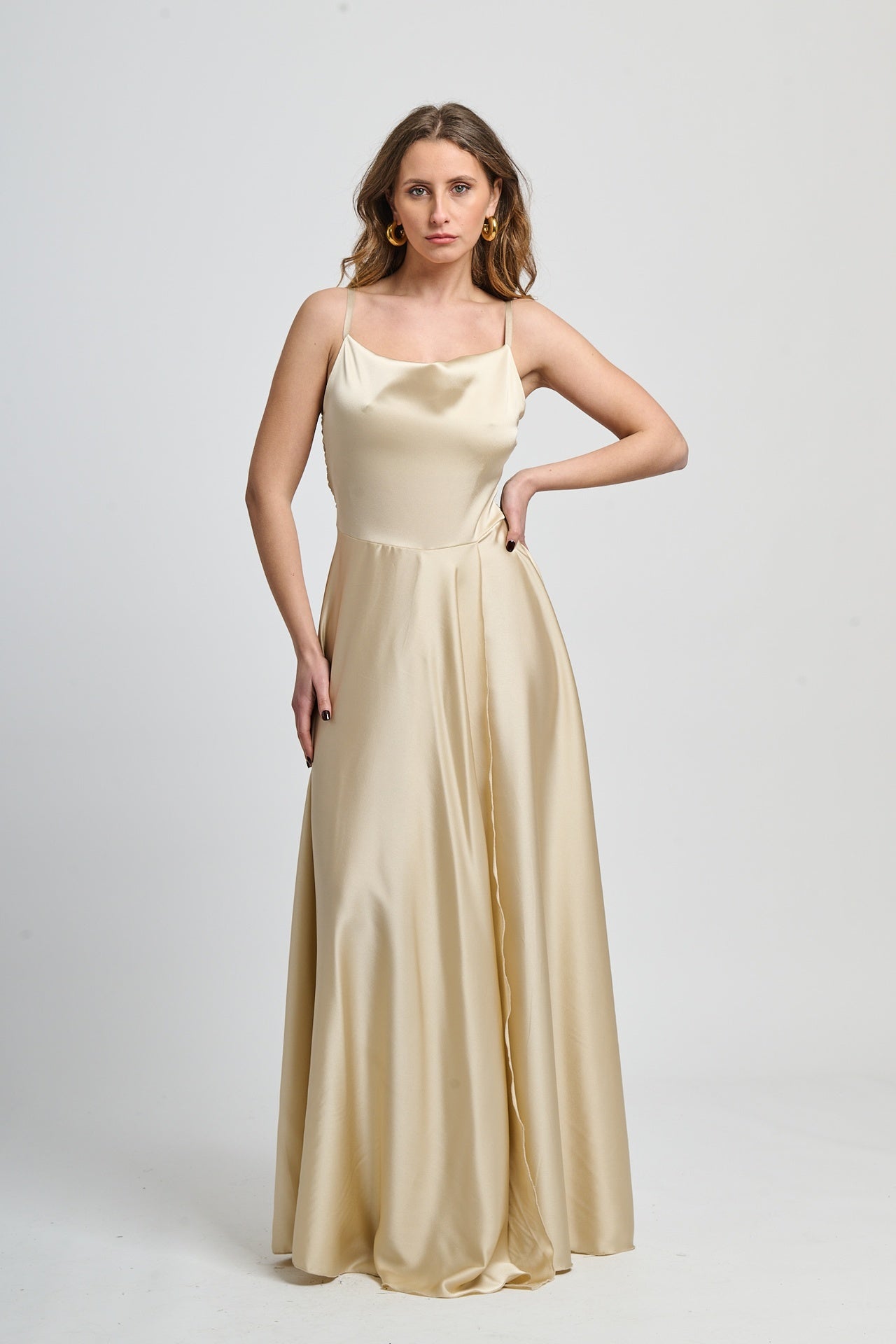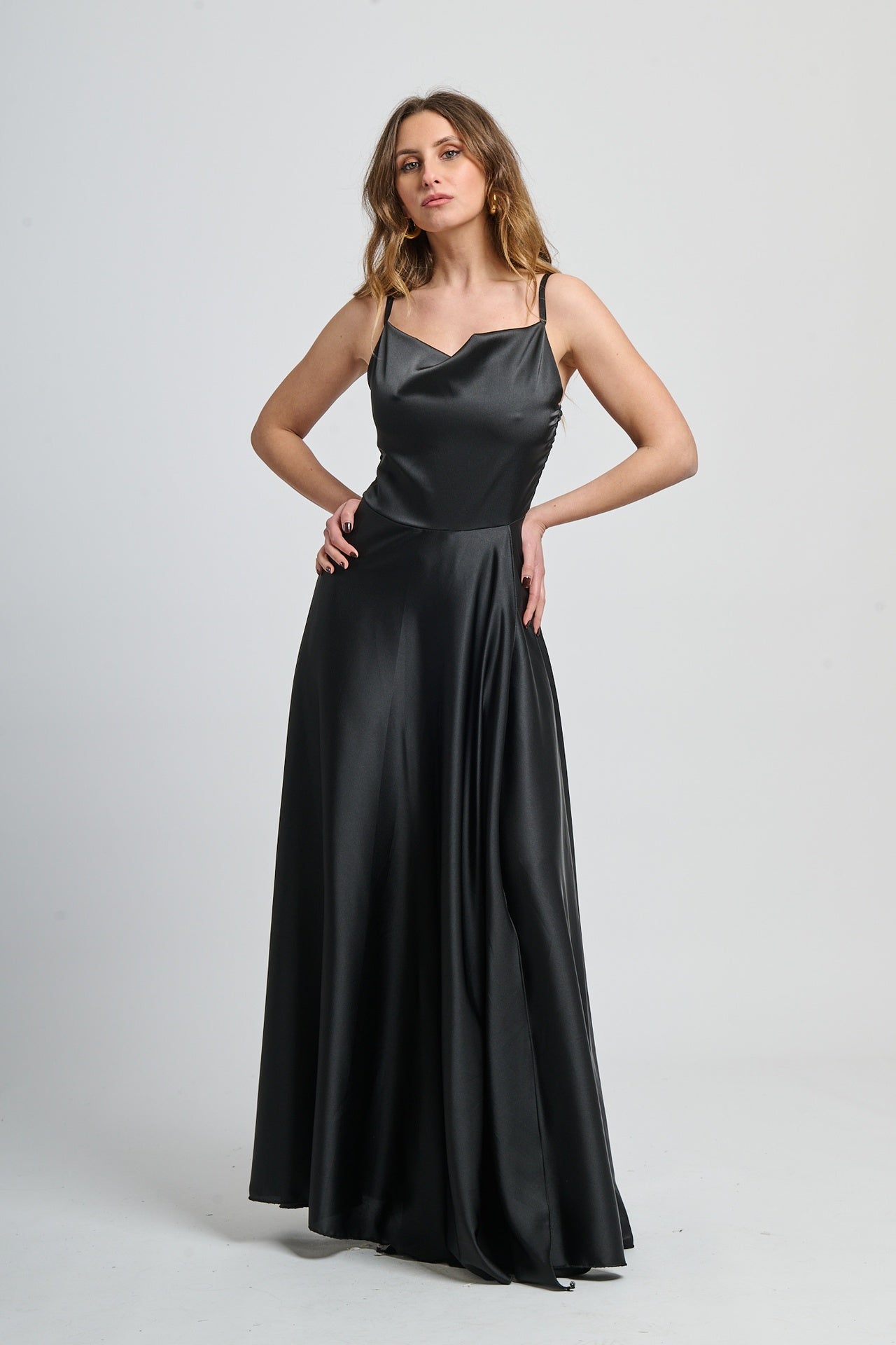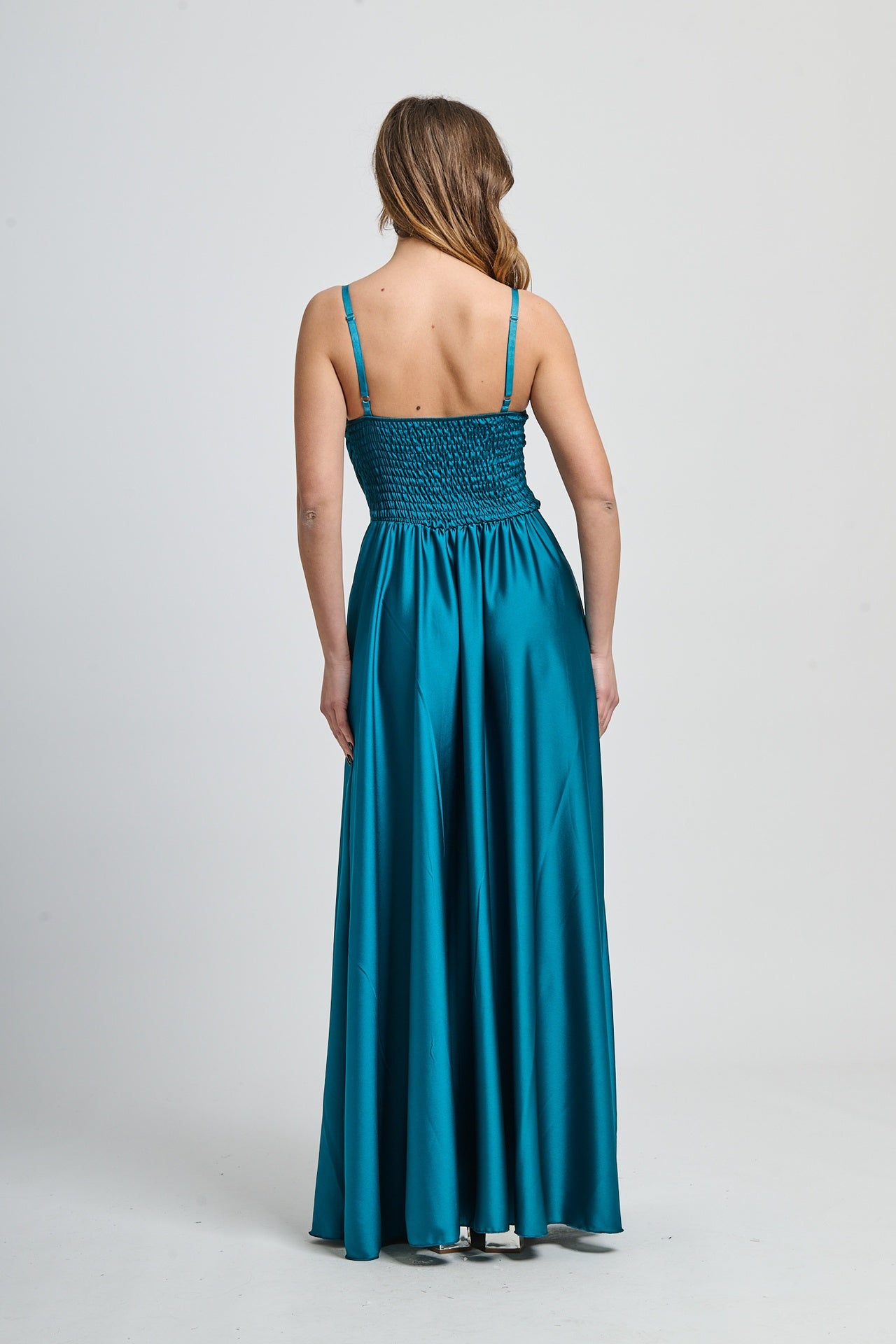 Raffinato, seducente e di grande impatto: questo abito lungo in raso è pensato per chi vuole brillare con eleganza e personalità. Il design minimalista dello scollo dritto con spalline sottili esalta la silhouette con discrezione, mentre lo spacco profondo sulla gamba aggiunge un tocco di sensualità irresistibile. Il tessuto satinato cattura la luce ad ogni movimento, regalando un effetto seta che non passa inosservato.