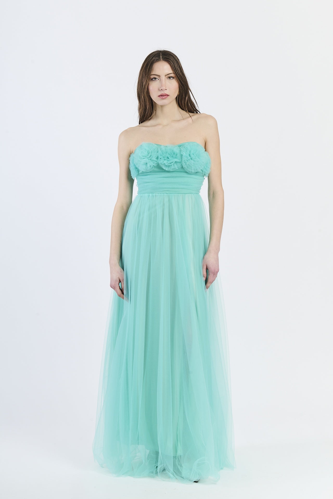 Un abito che incanta al primo sguardo: etereo, romantico e incredibilmente femminile. Questo abito lungo è realizzato in un tessuto leggero e vaporoso che fluttua ad ogni passo, donando grazia e movimento.