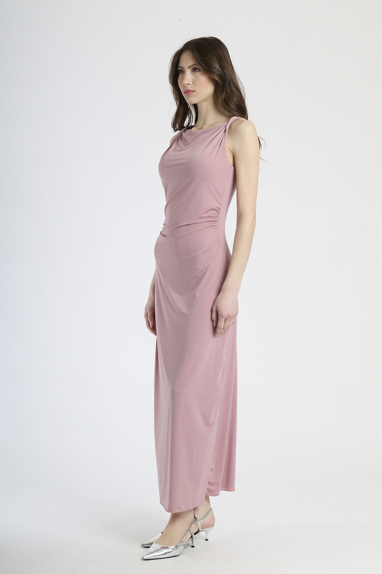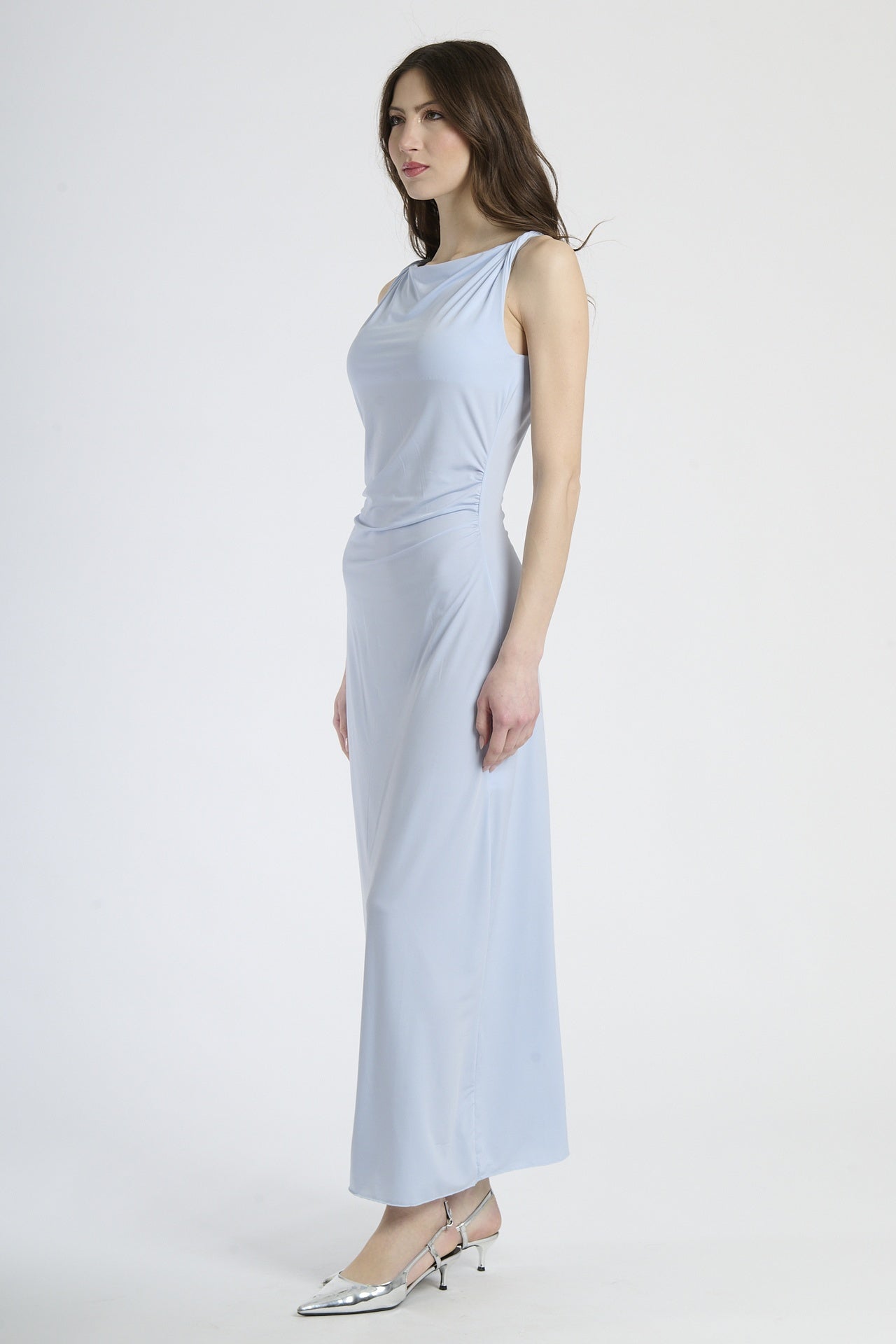 Un abito che parla con la sua semplicità, esprimendo uno stile deciso, moderno e raffinato. Il taglio dritto e pulito abbraccia la silhouette con discrezione, mentre il girocollo e le spalle scoperte regalano un’eleganza senza tempo. Questo modello è l’incarnazione perfetta del “less is more”.