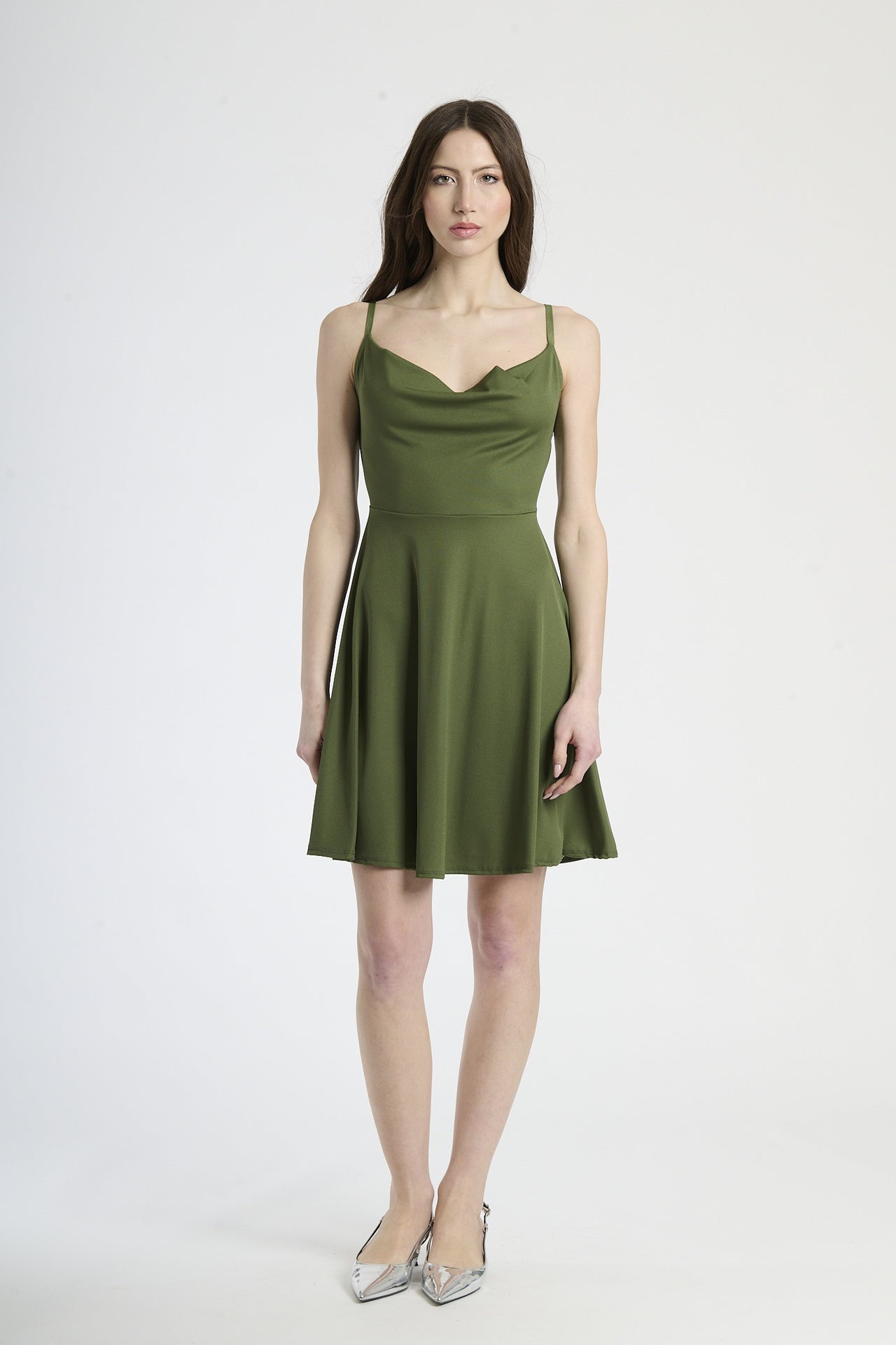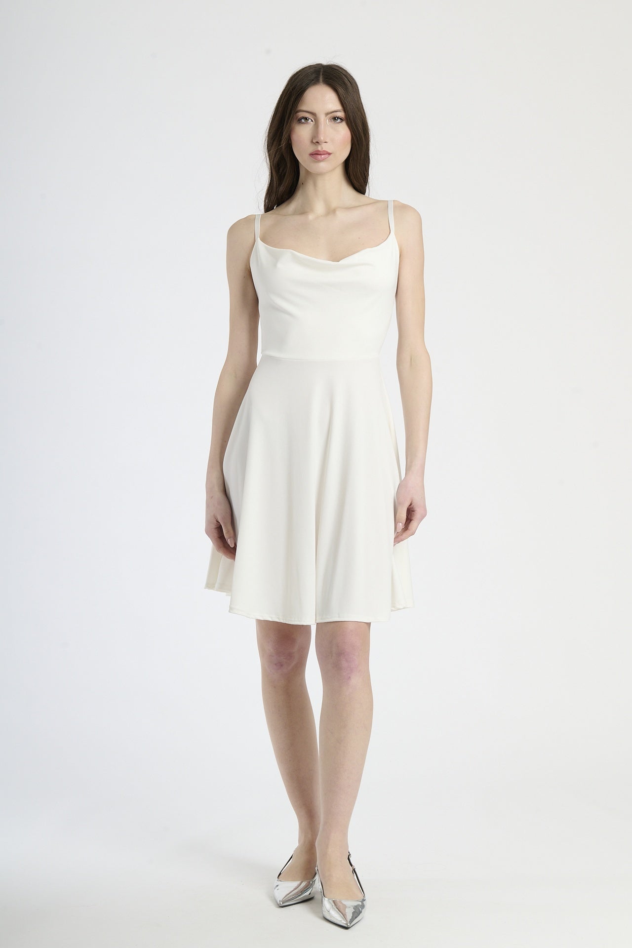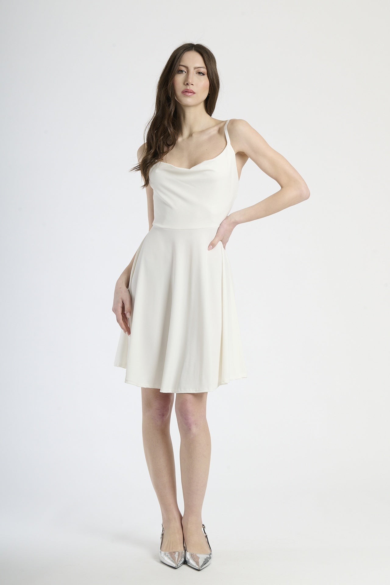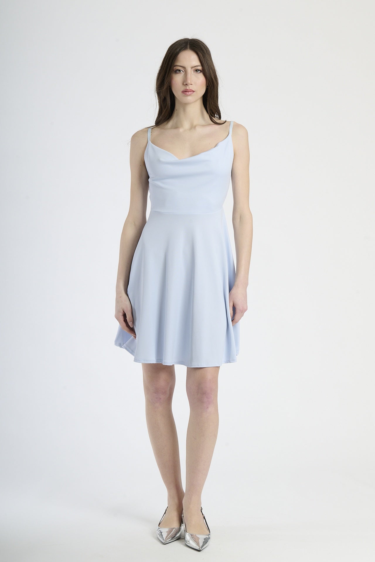 Un abito che esprime eleganza naturale e movimento: questo vestito corto in tonalità è la scelta ideale per chi ama uno stile romantico ma essenziale. Il corpetto aderente con scollo morbido effetto drappeggiato valorizza la parte superiore del corpo, mentre la gonna svasata dona un tocco dinamico e fluido.