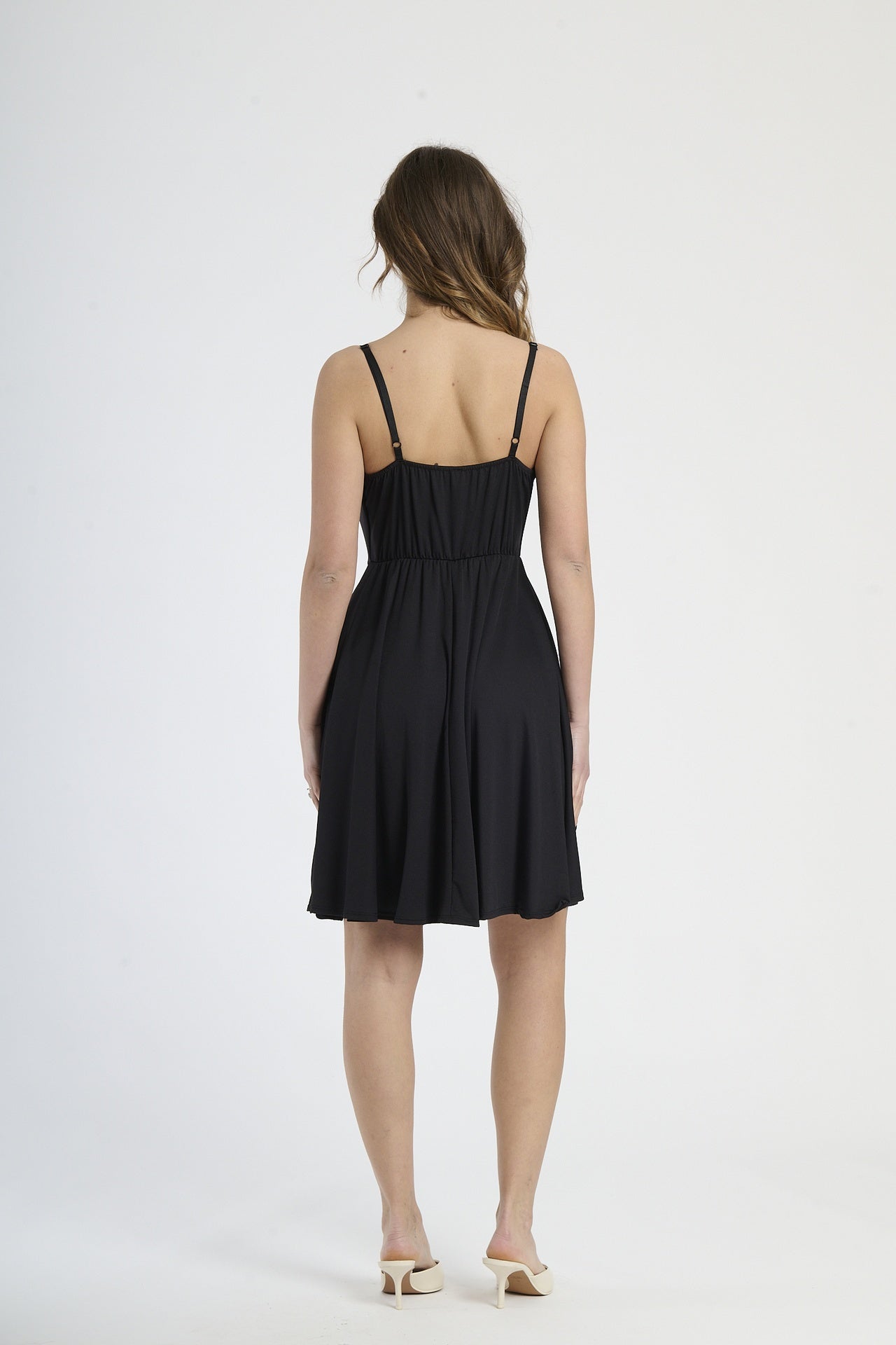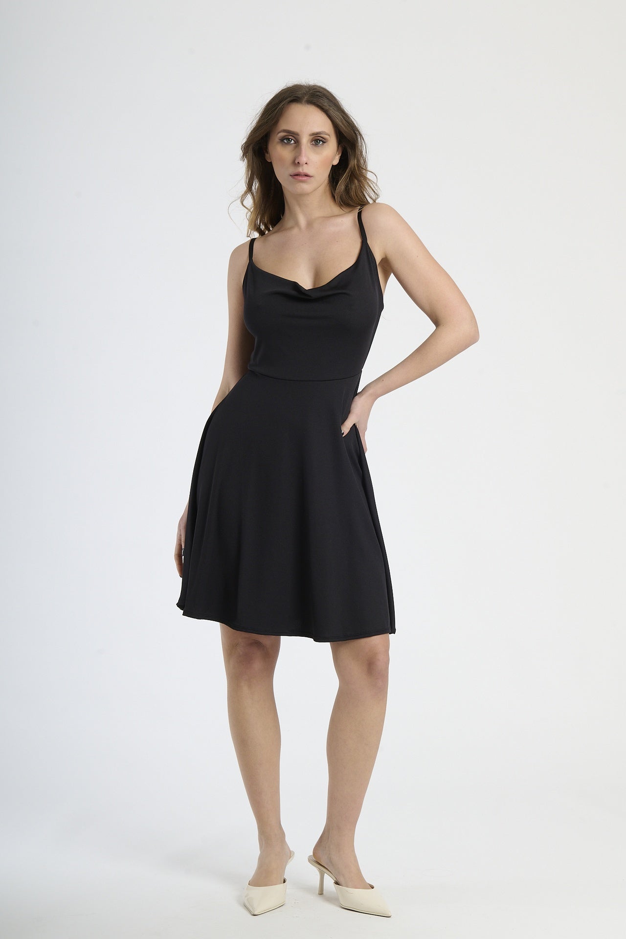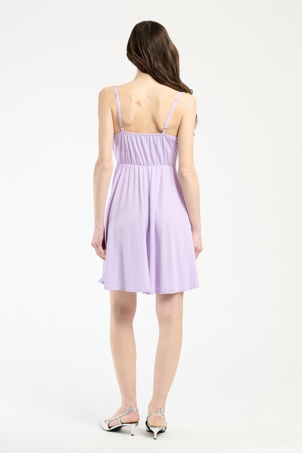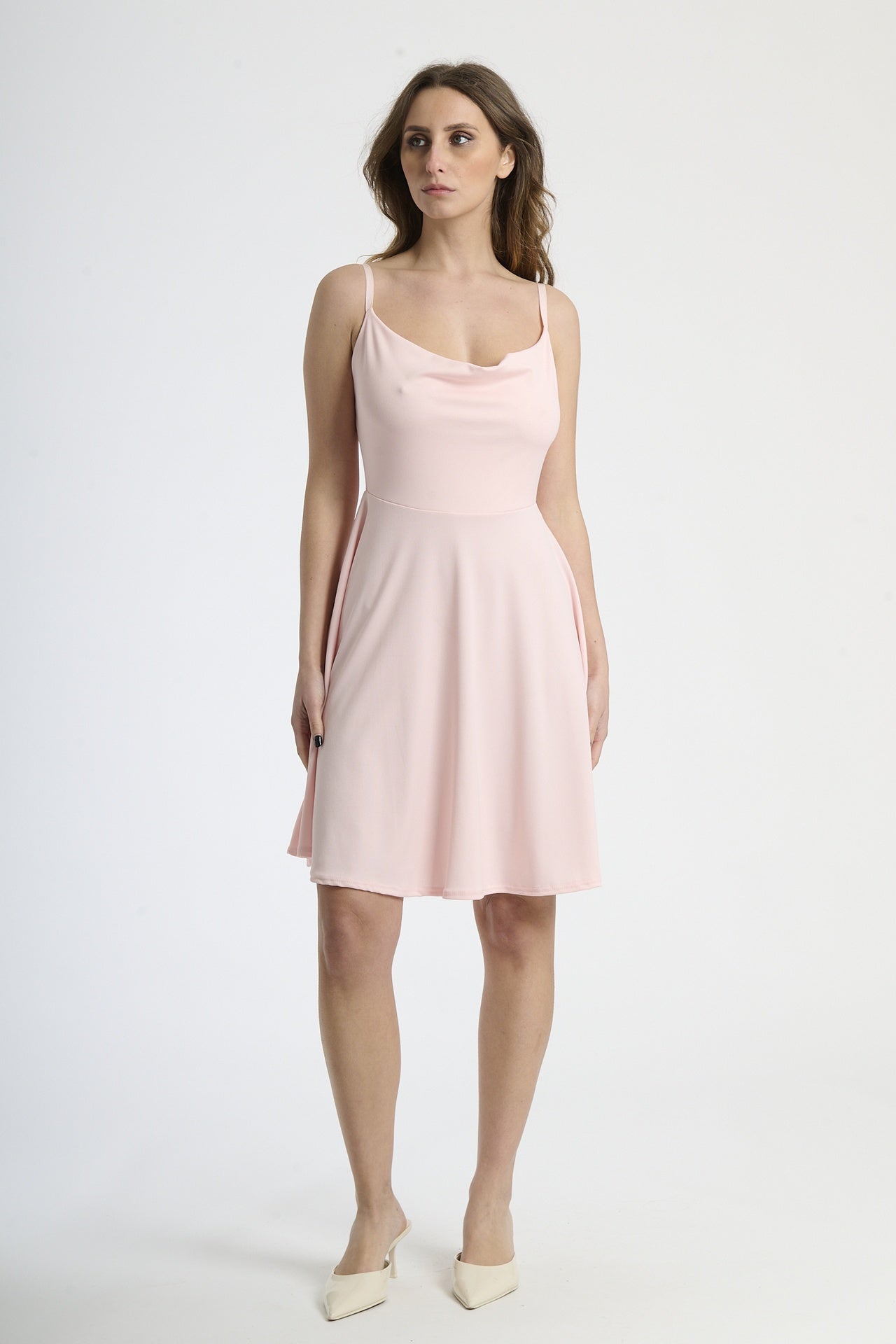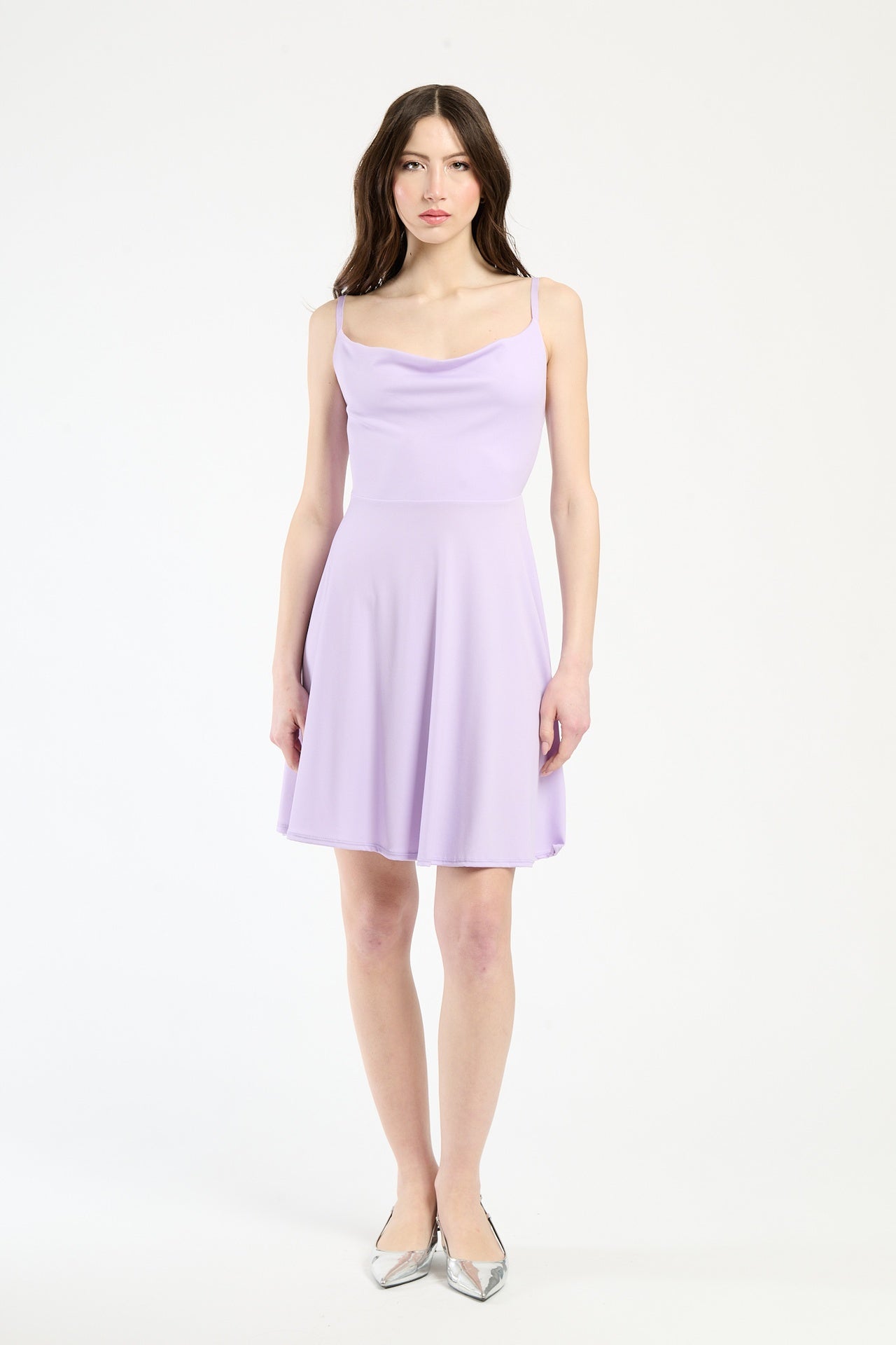 Un abito che esprime eleganza naturale e movimento: questo vestito corto in tonalità è la scelta ideale per chi ama uno stile romantico ma essenziale. Il corpetto aderente con scollo morbido effetto drappeggiato valorizza la parte superiore del corpo, mentre la gonna svasata dona un tocco dinamico e fluido.