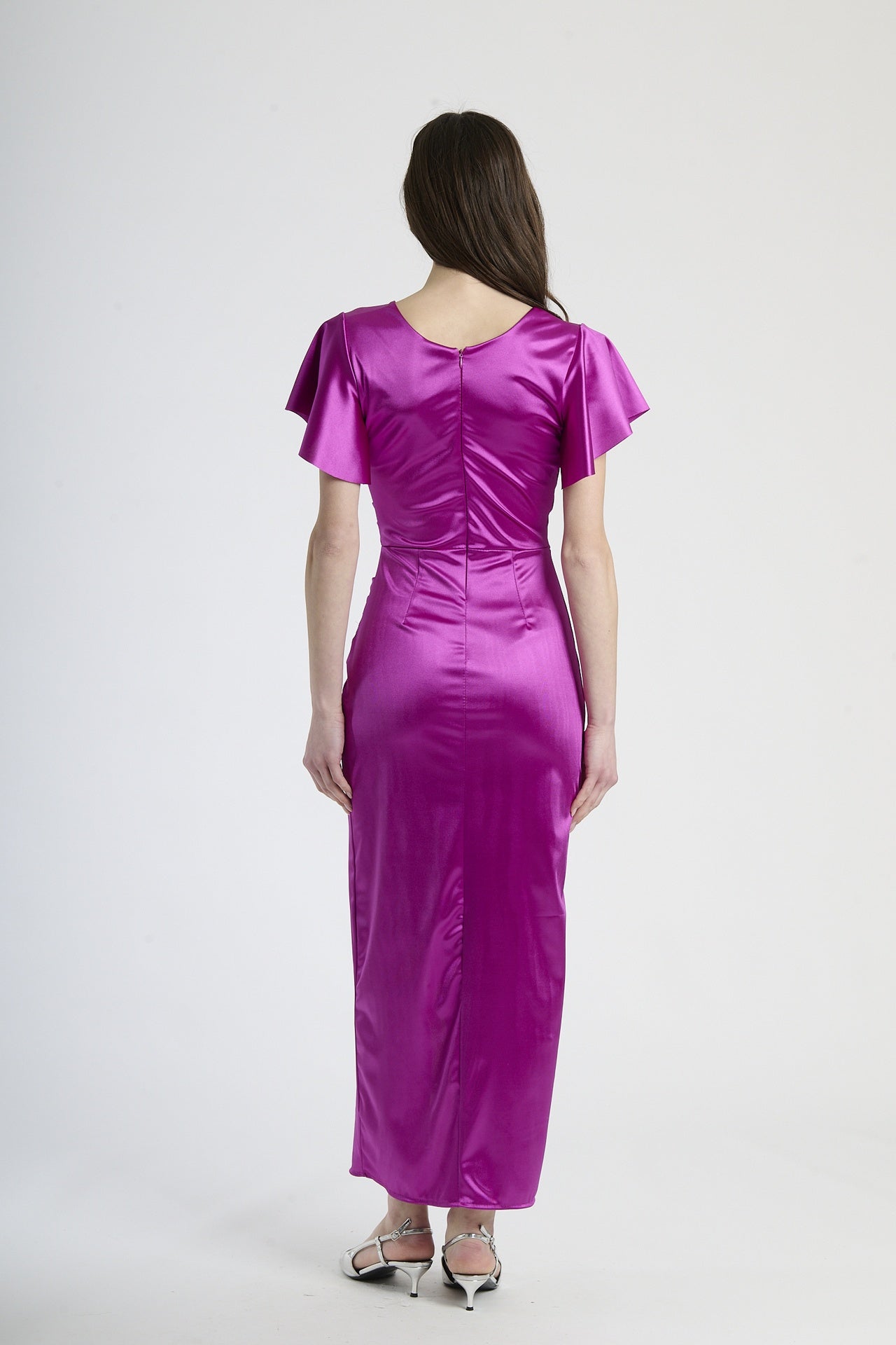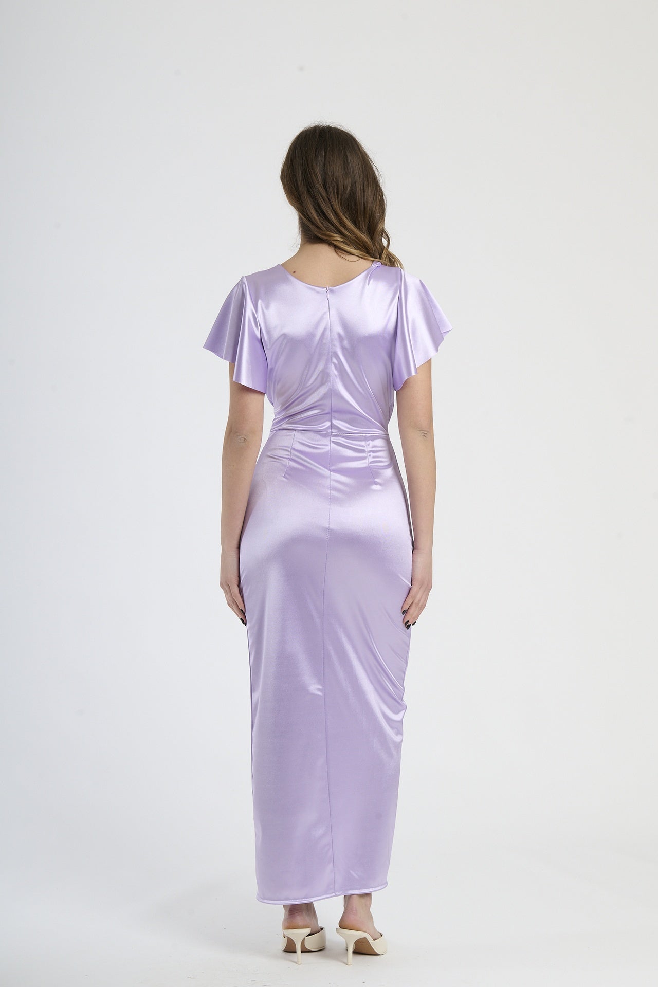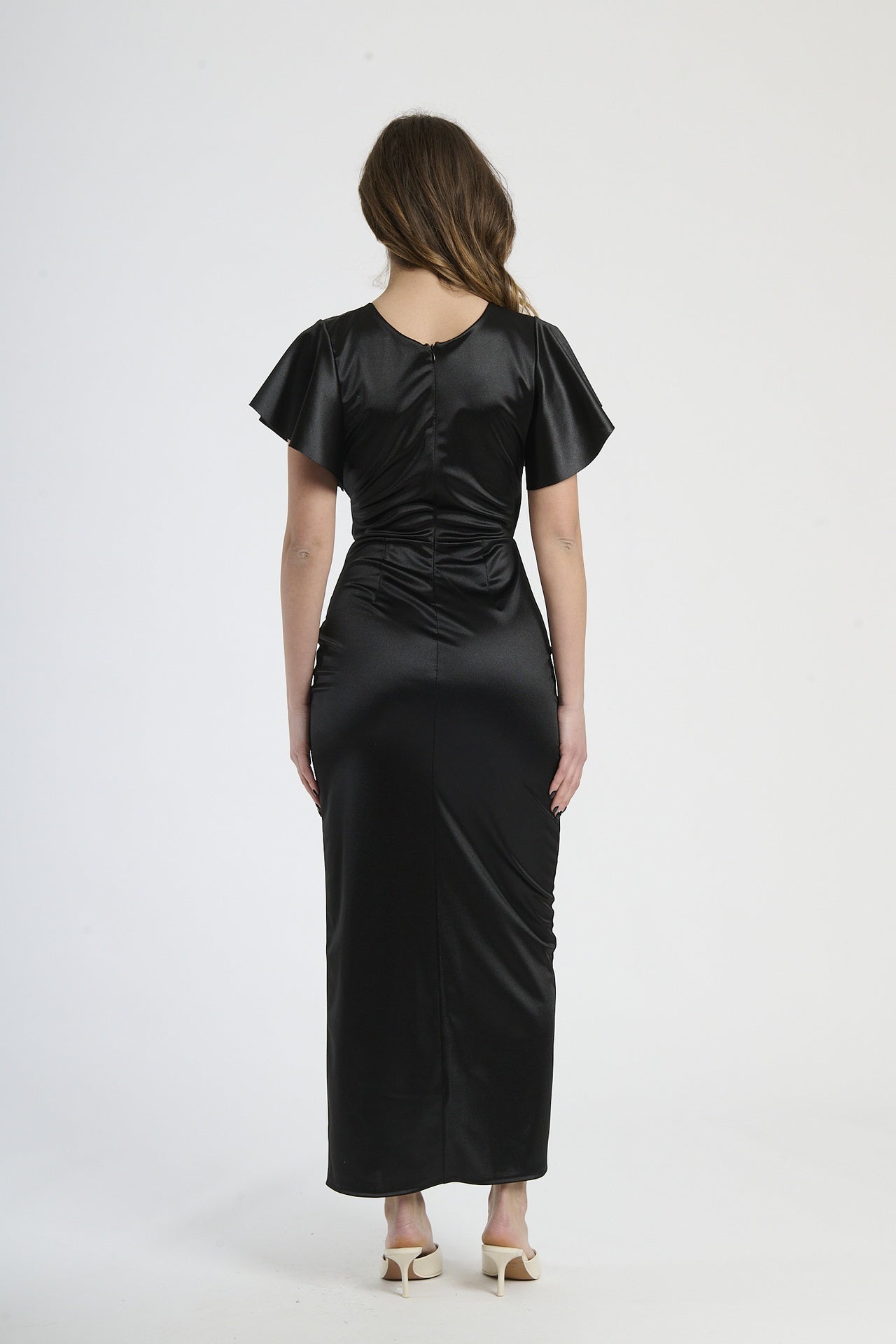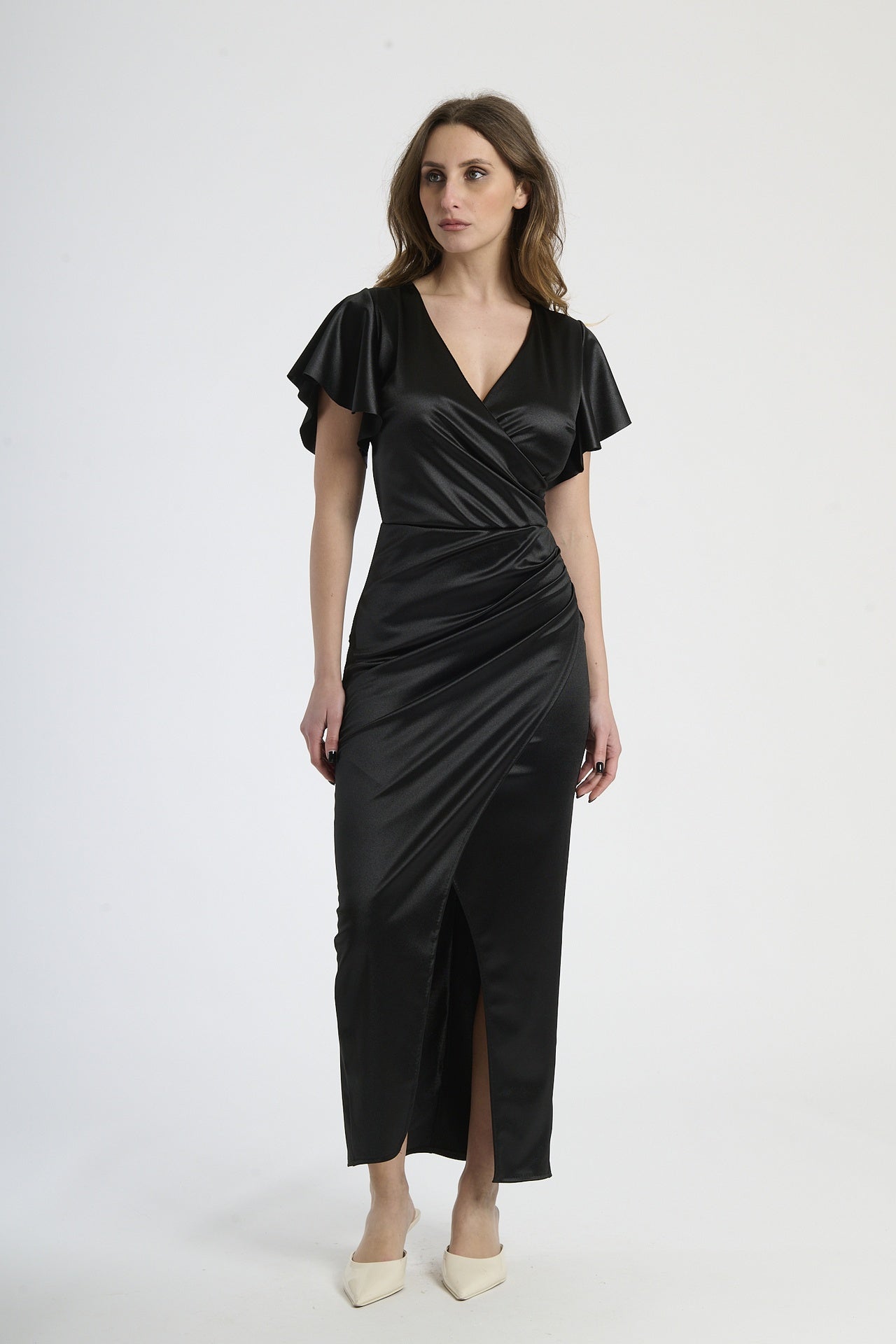Elegante, audace e incredibilmente sofisticato: questo abito lungo in satin è l’emblema della femminilità moderna. Il design con scollo a V valorizza il décolleté, mentre le maniche corte stile kimono aggiungono un tocco chic e contemporaneo. La fascia laterale drappeggiata scolpisce la silhouette e si fonde con lo spacco frontale, regalando sensualità e dinamismo ad ogni passo.