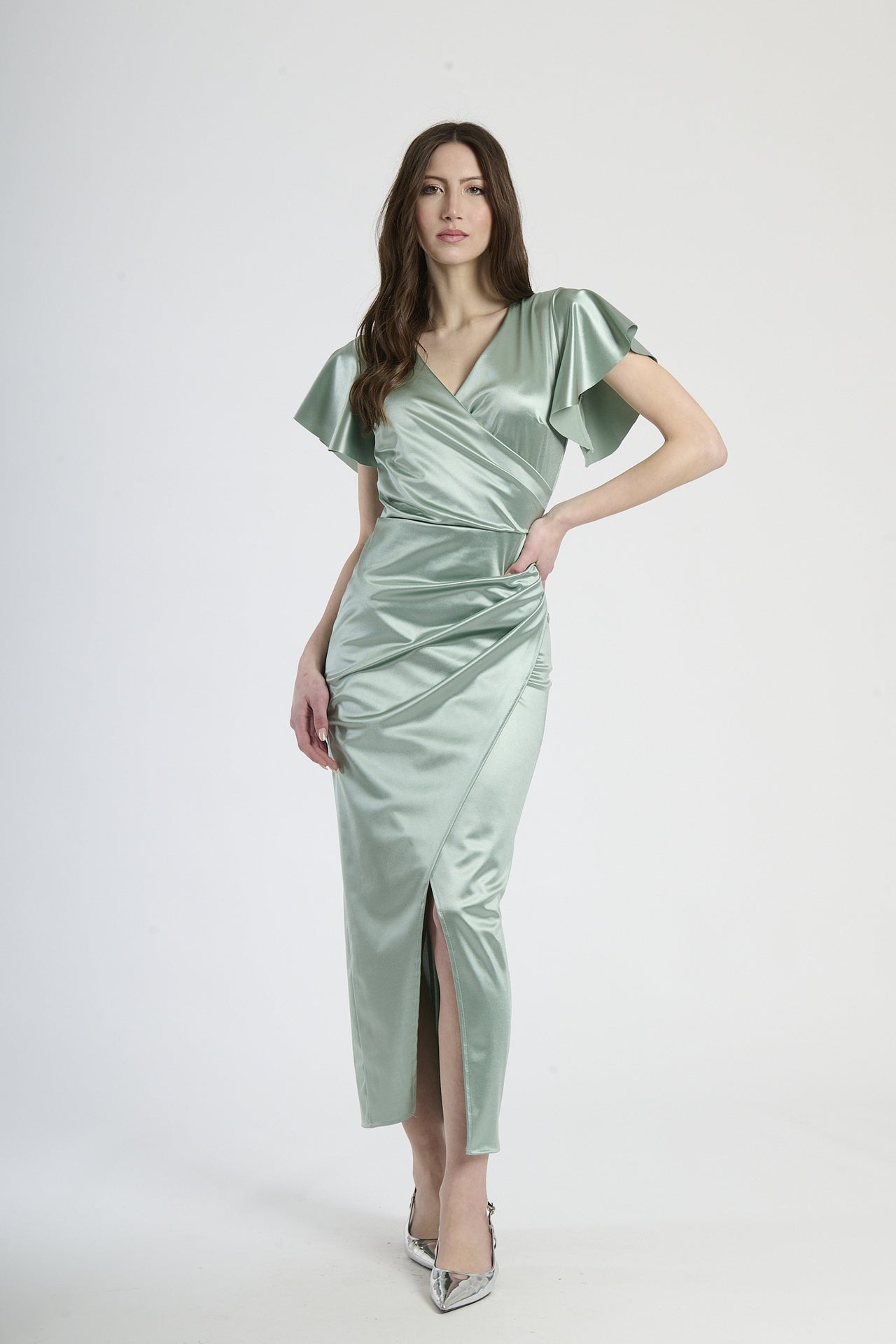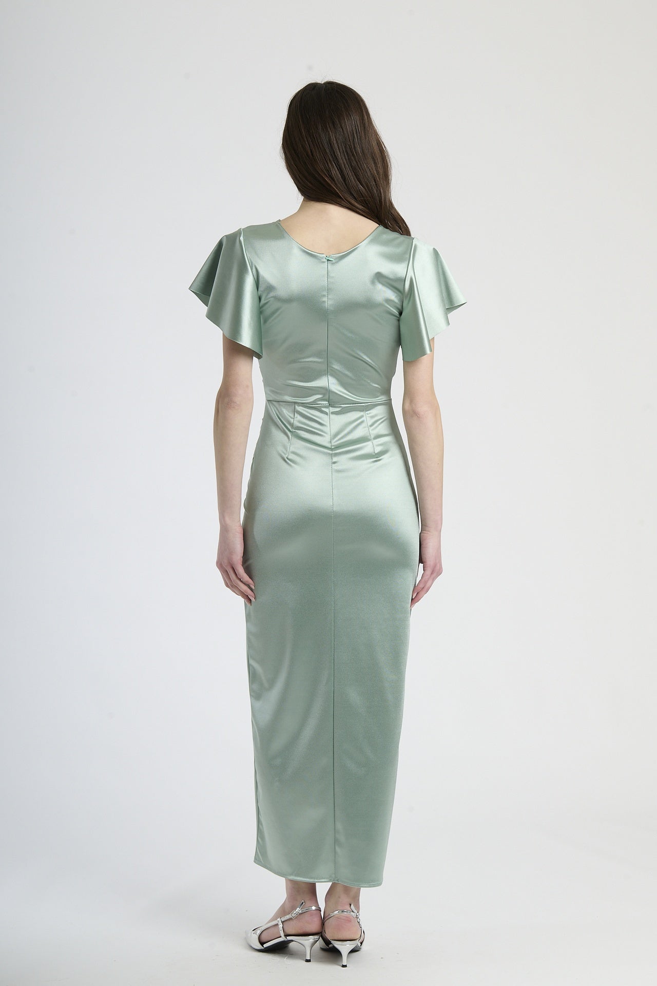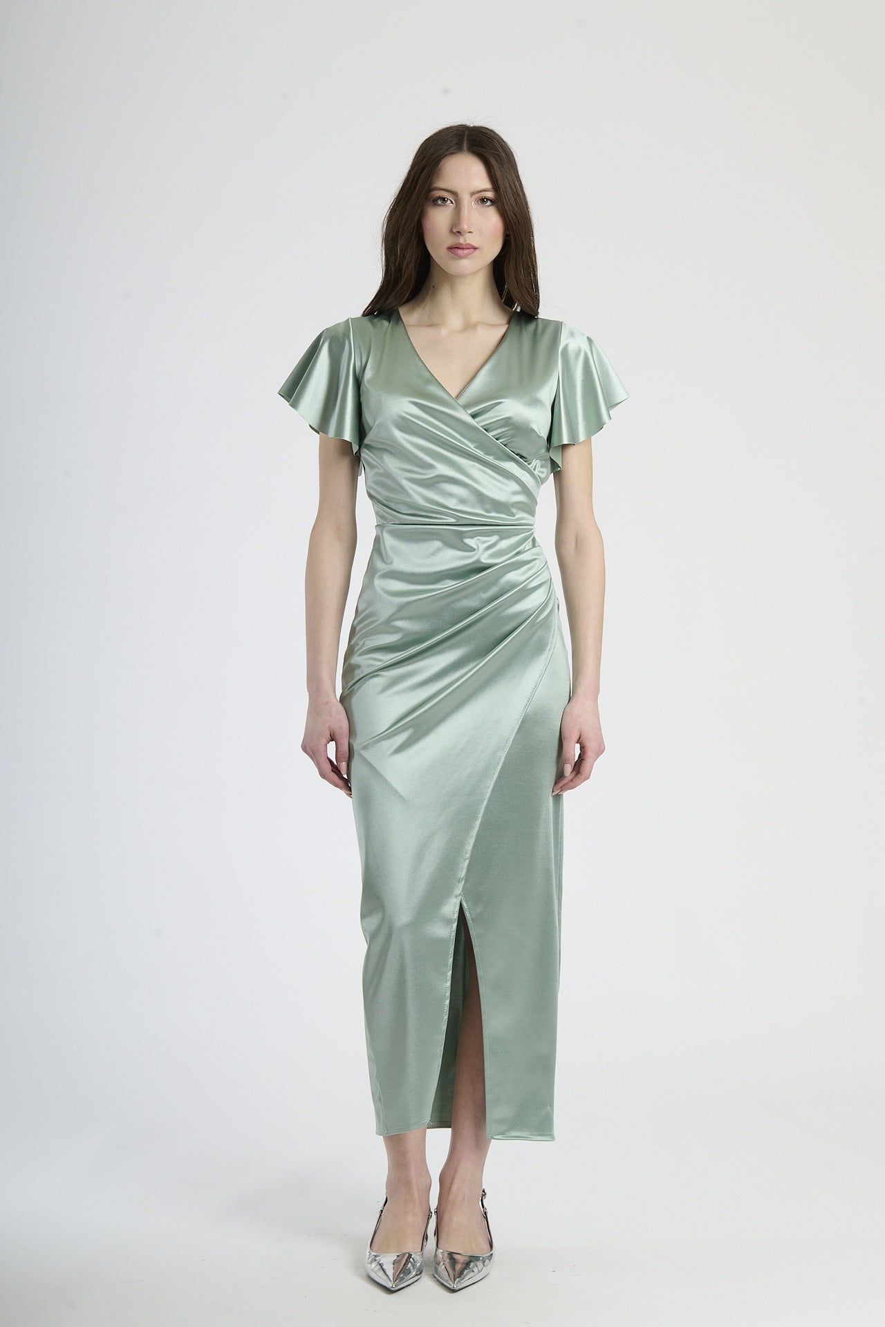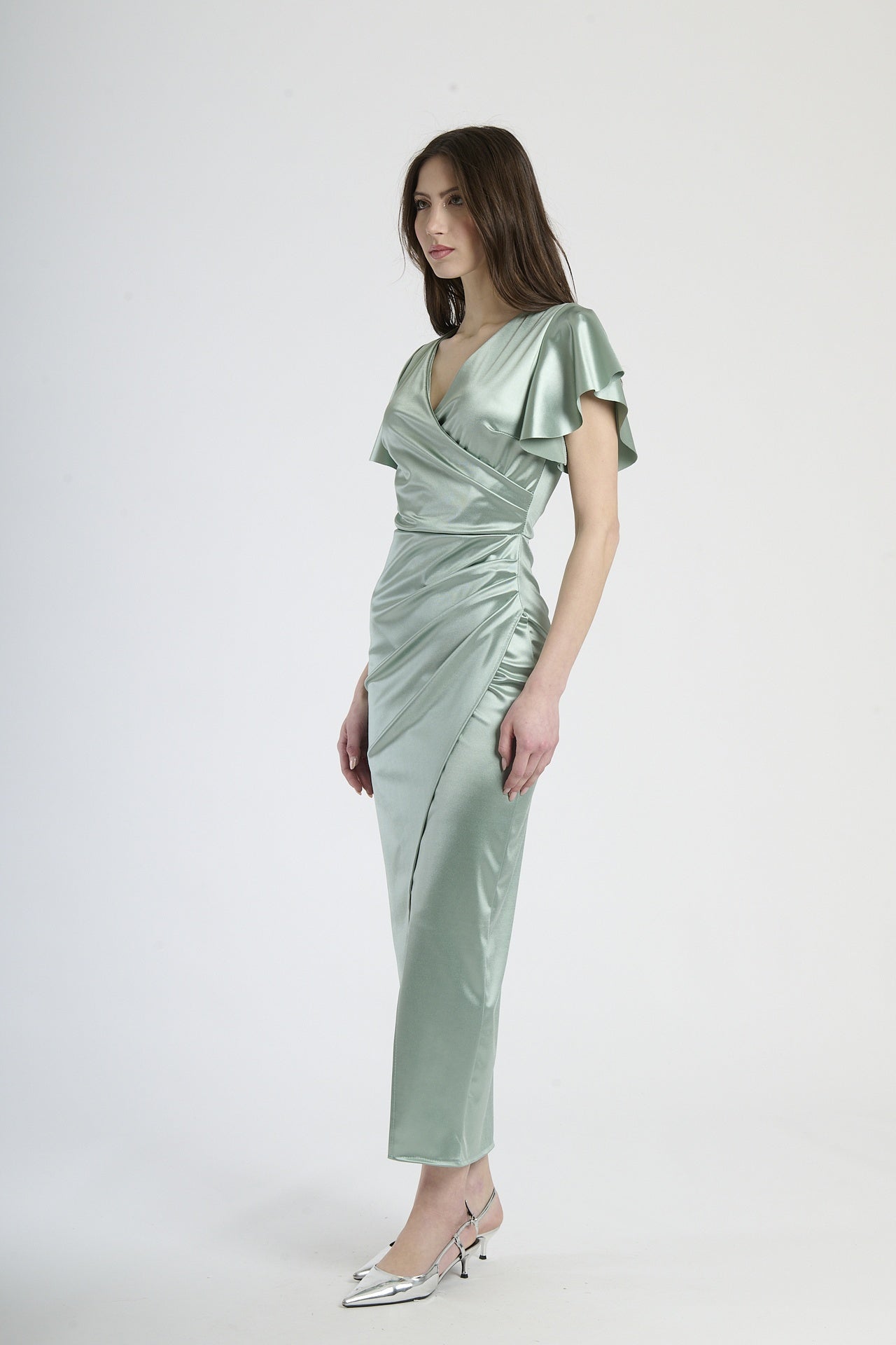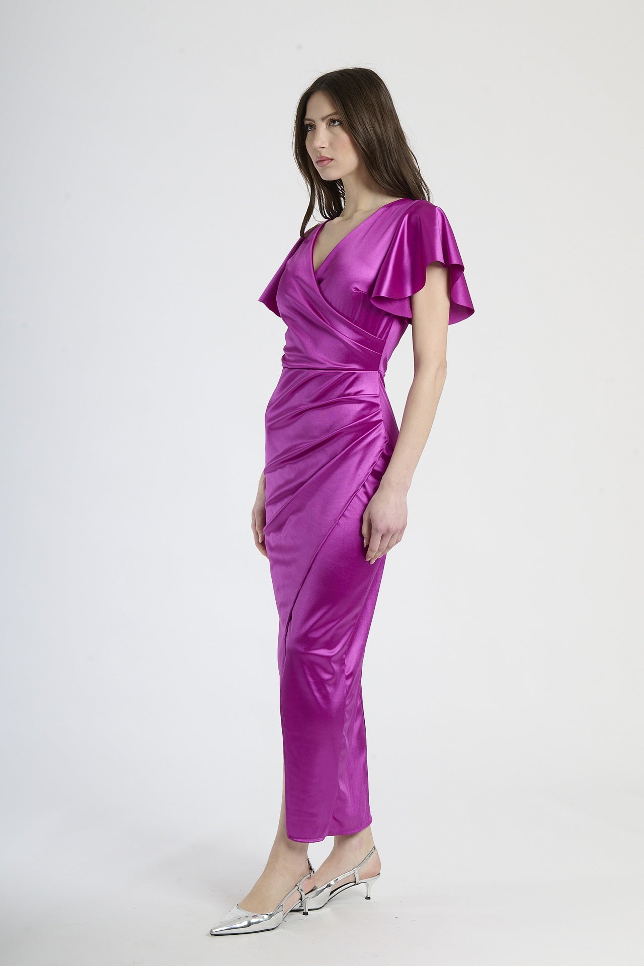 Elegante, audace e incredibilmente sofisticato: questo abito lungo in satin è l’emblema della femminilità moderna. Il design con scollo a V valorizza il décolleté, mentre le maniche corte stile kimono aggiungono un tocco chic e contemporaneo. La fascia laterale drappeggiata scolpisce la silhouette e si fonde con lo spacco frontale, regalando sensualità e dinamismo ad ogni passo.
