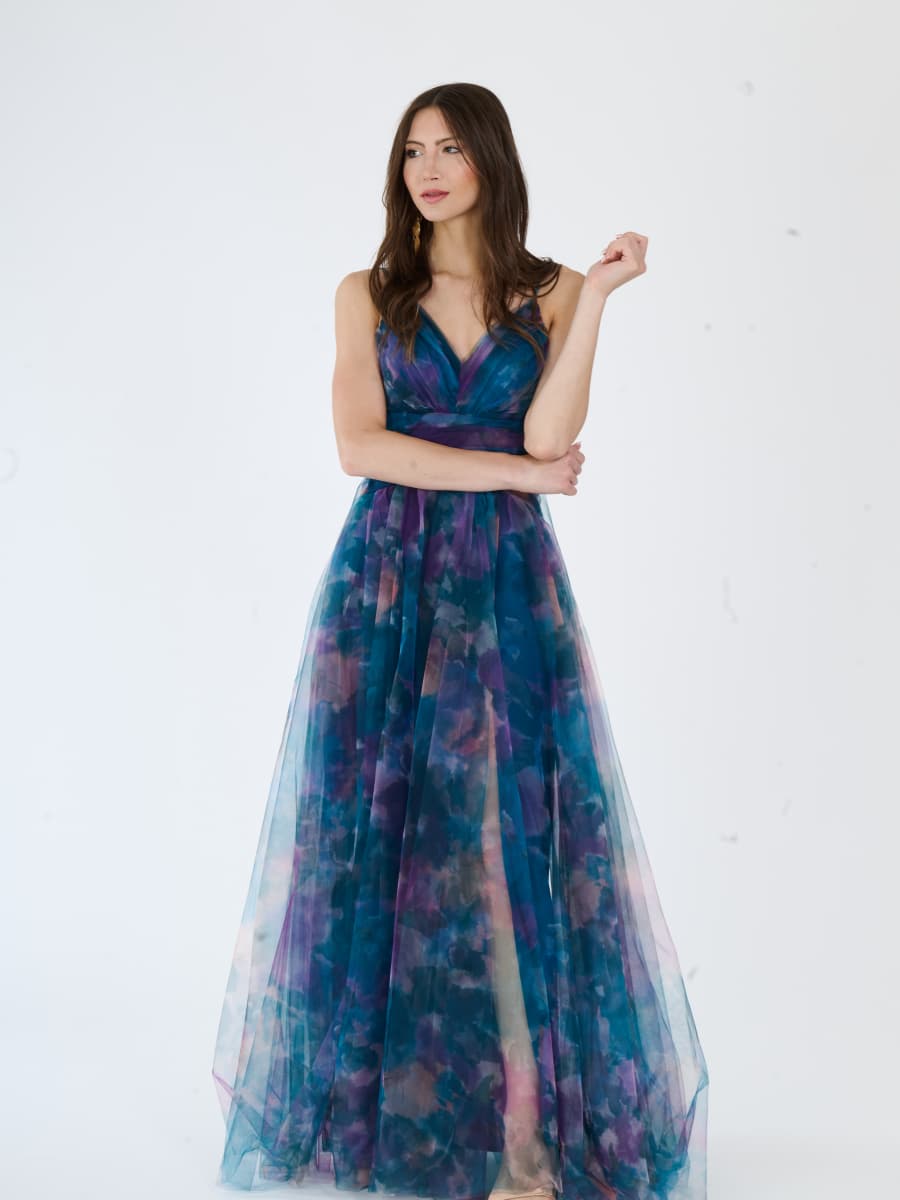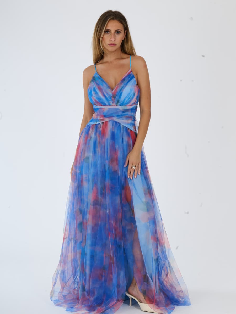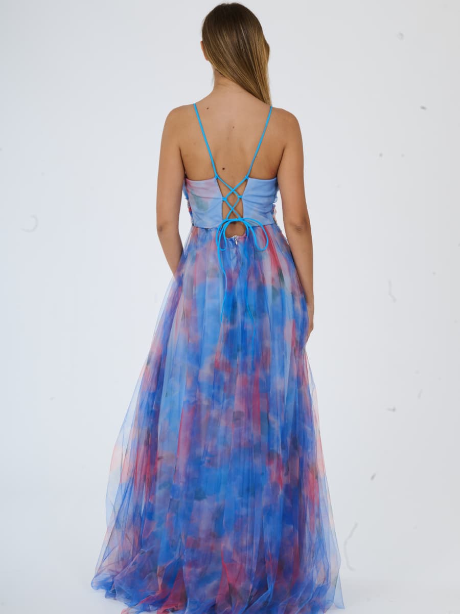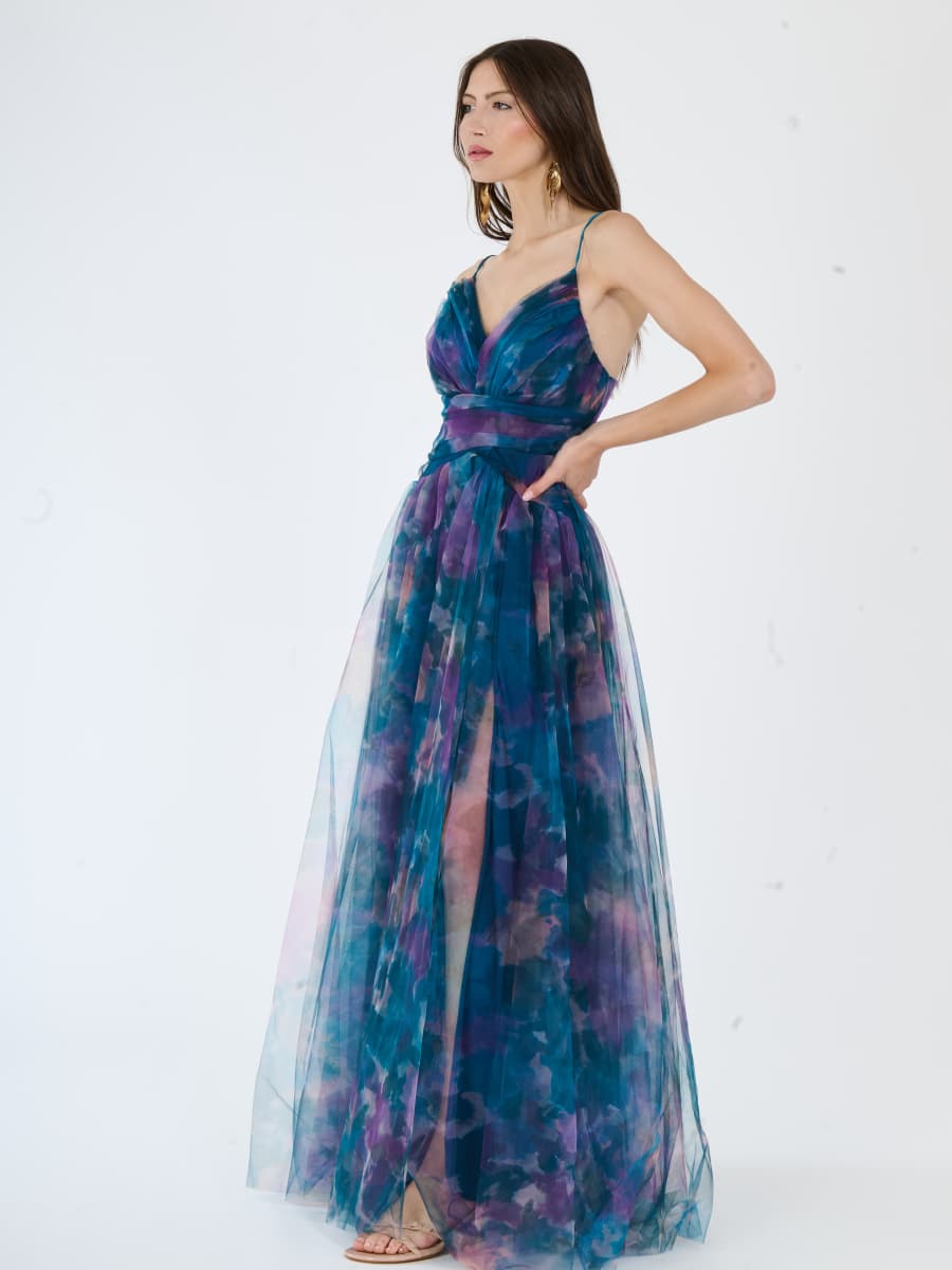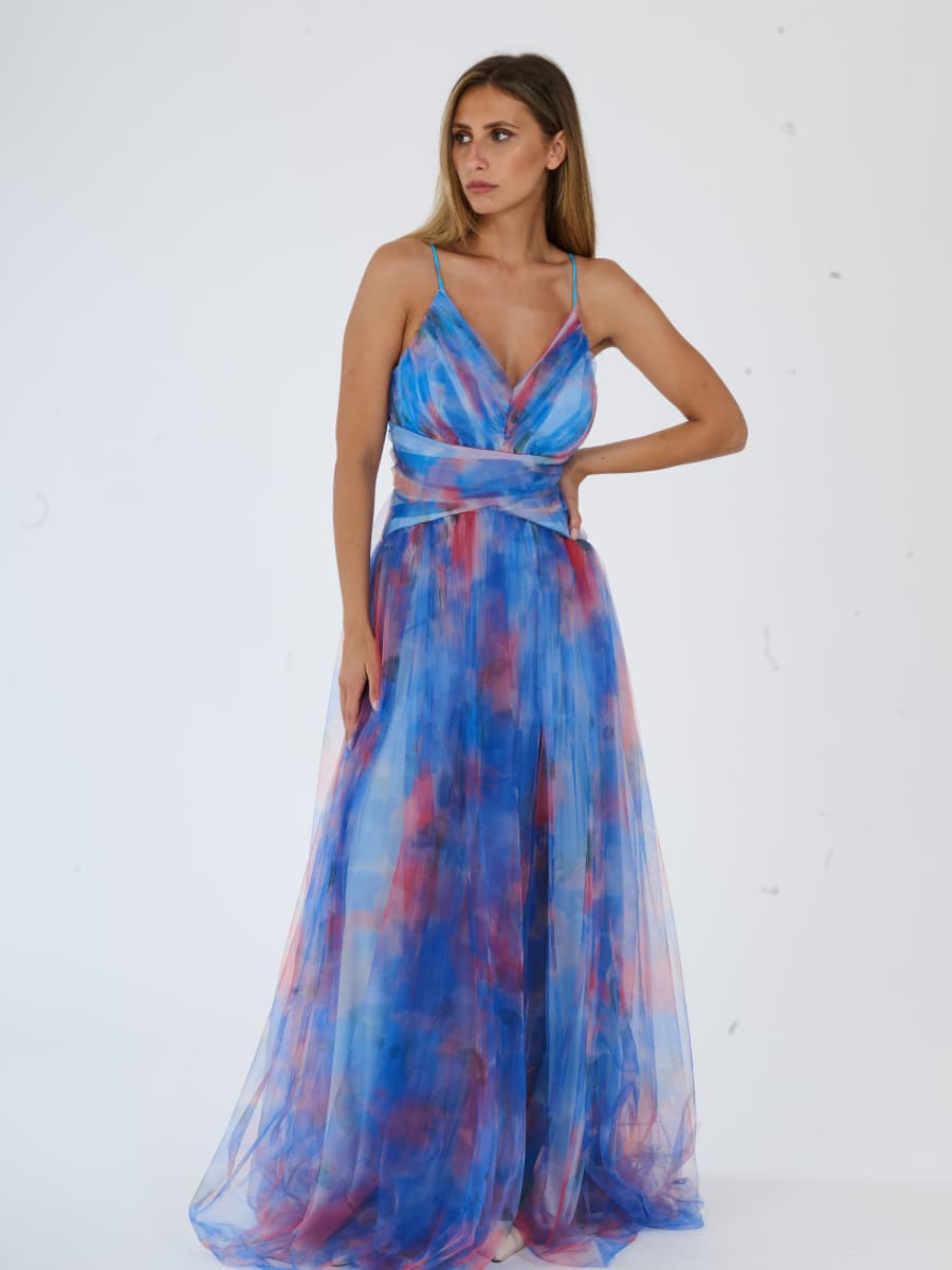 Lasciati conquistare dalla magia di questo abito lungo in tulle leggero, con una spettacolare stampa sfumata nei toni del blu e del rosa. Il corpetto con scollo a V e spalline sottili incrociate sul busto esalta il décolleté con delicatezza, mentre la gonna ampia e fluida crea un effetto etereo ad ogni passo. Lo spacco frontale dona un tocco moderno e audace.