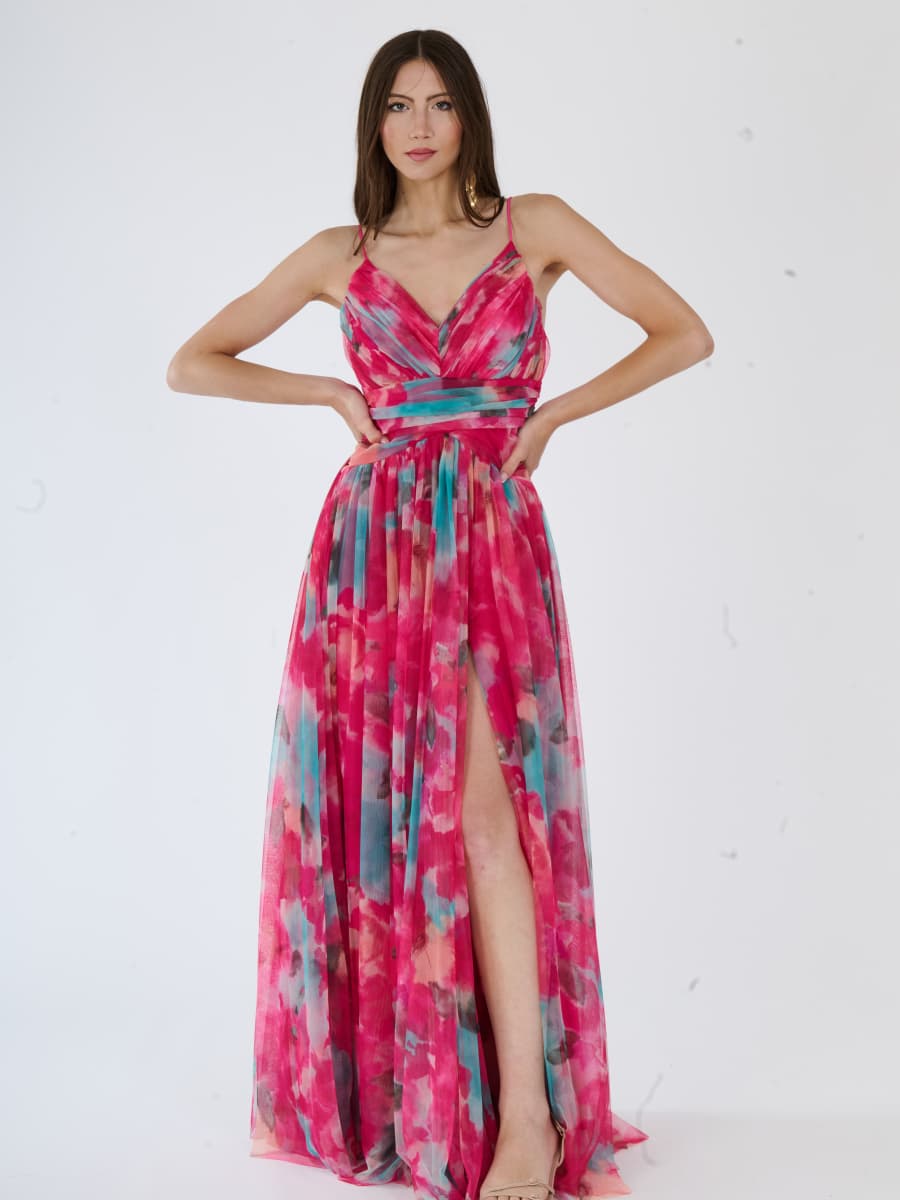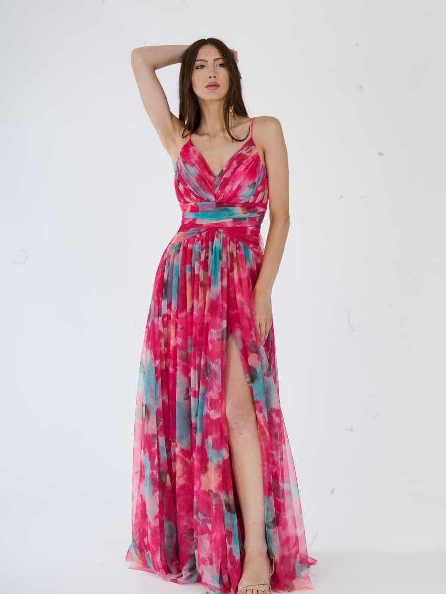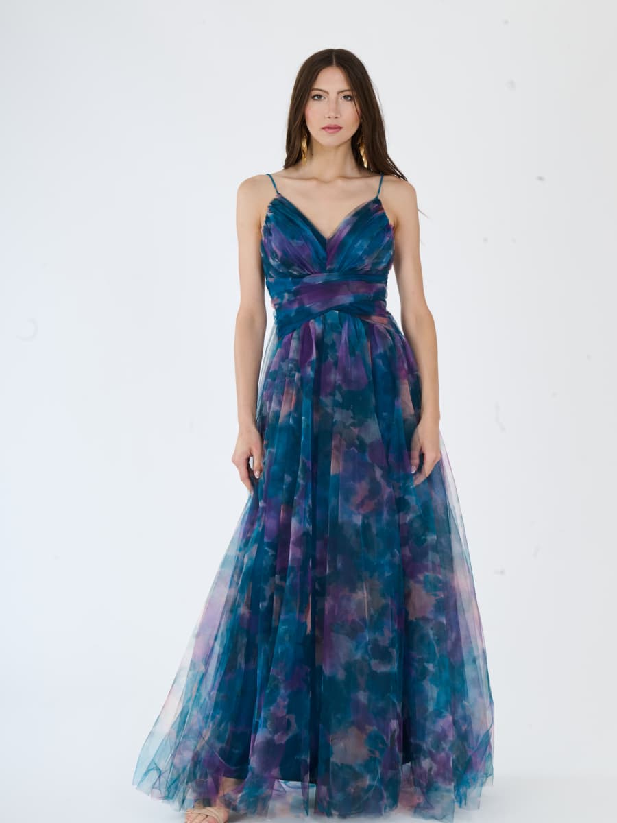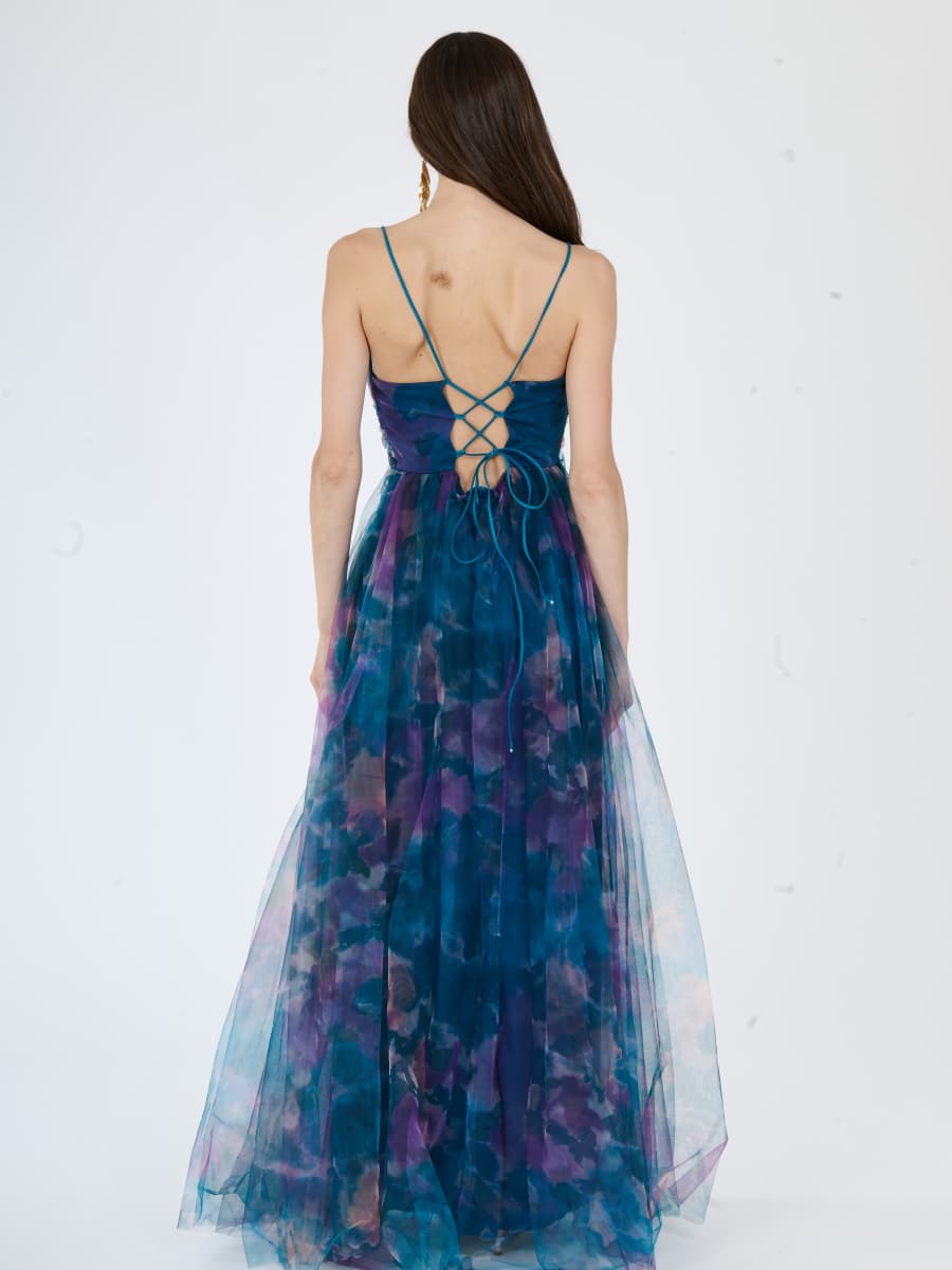 Lasciati conquistare dalla magia di questo abito lungo in tulle leggero, con una spettacolare stampa sfumata nei toni del blu e del rosa. Il corpetto con scollo a V e spalline sottili incrociate sul busto esalta il décolleté con delicatezza, mentre la gonna ampia e fluida crea un effetto etereo ad ogni passo. Lo spacco frontale dona un tocco moderno e audace.