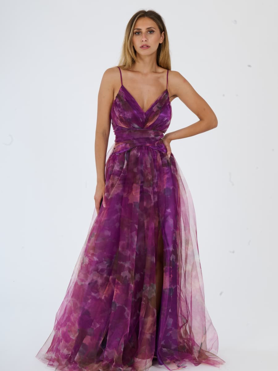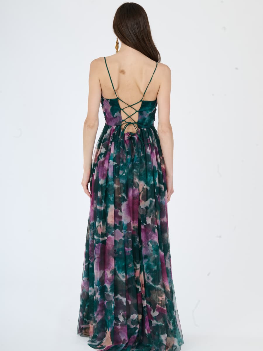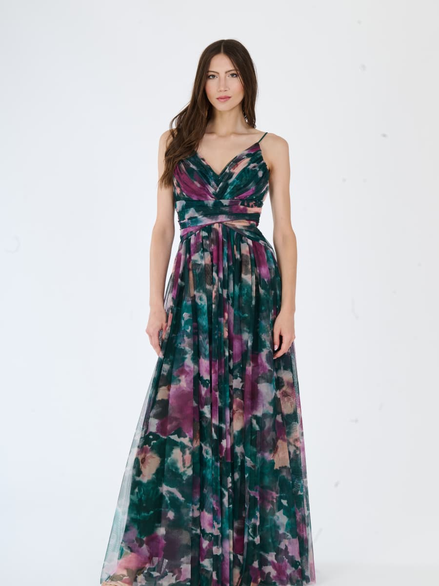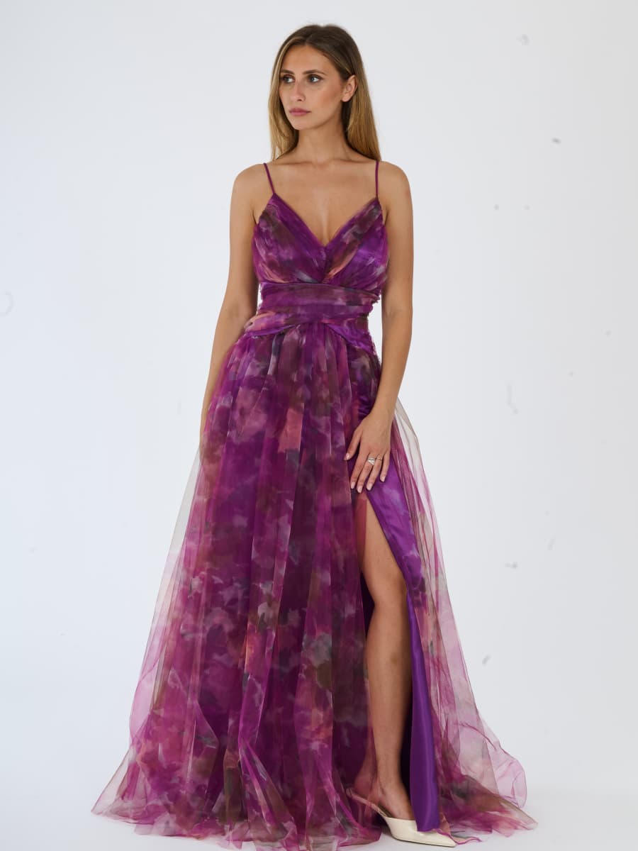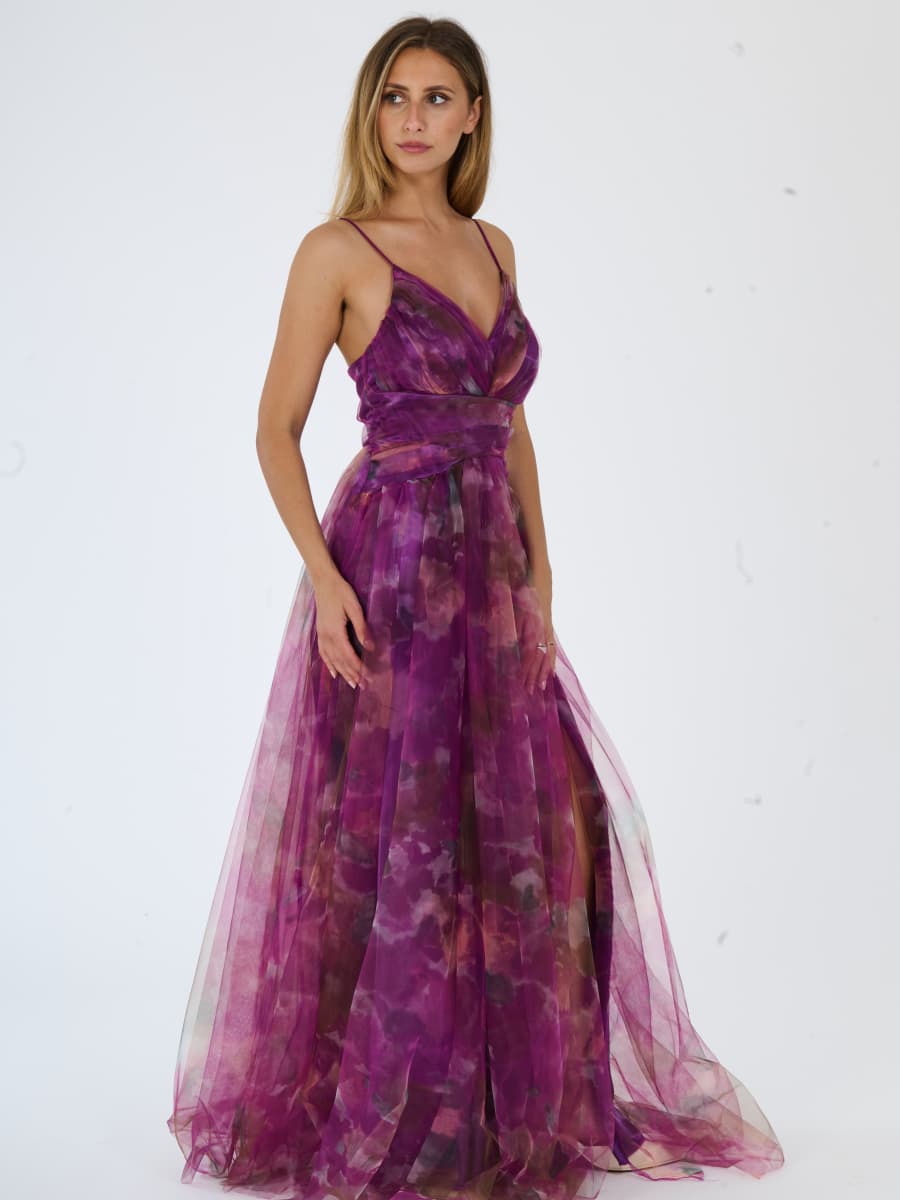 Lasciati conquistare dalla magia di questo abito lungo in tulle leggero, con una spettacolare stampa sfumata nei toni del blu e del rosa. Il corpetto con scollo a V e spalline sottili incrociate sul busto esalta il décolleté con delicatezza, mentre la gonna ampia e fluida crea un effetto etereo ad ogni passo. Lo spacco frontale dona un tocco moderno e audace.