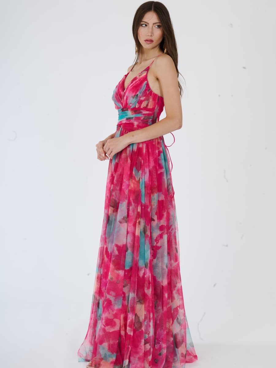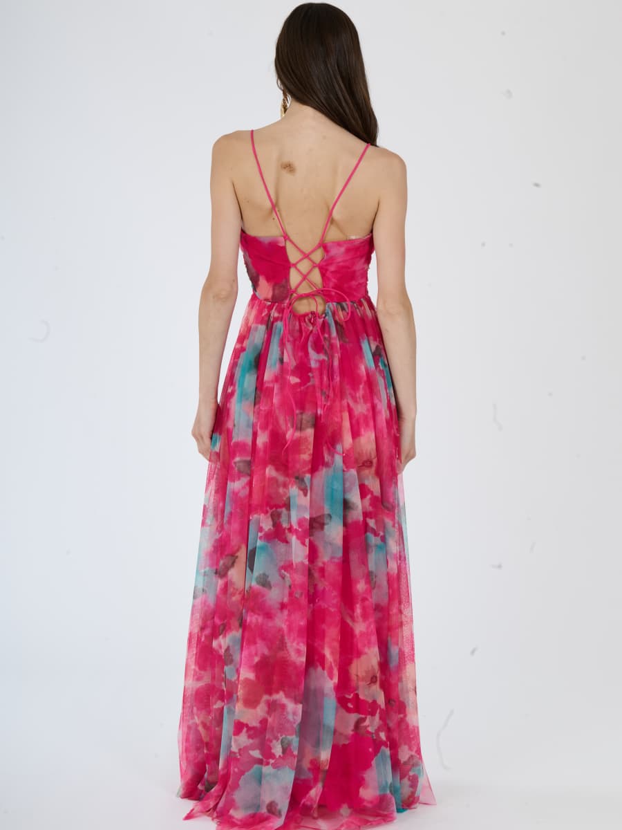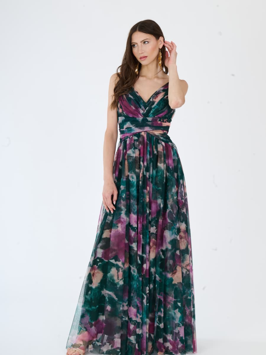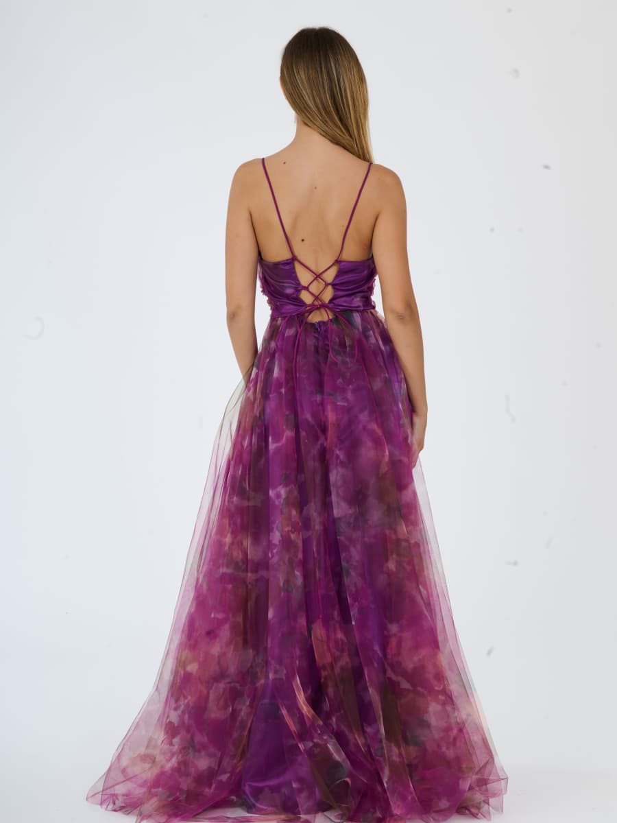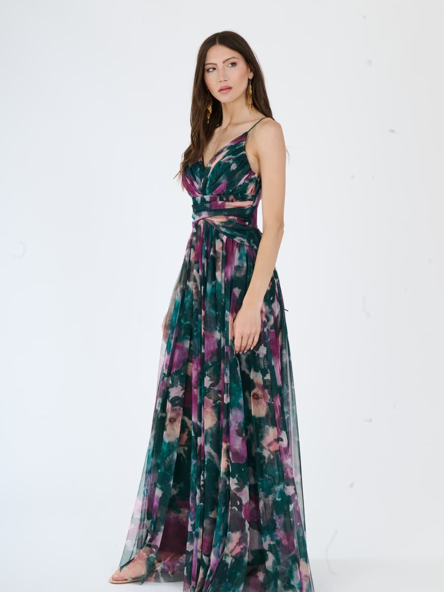 Lasciati conquistare dalla magia di questo abito lungo in tulle leggero, con una spettacolare stampa sfumata nei toni del blu e del rosa. Il corpetto con scollo a V e spalline sottili incrociate sul busto esalta il décolleté con delicatezza, mentre la gonna ampia e fluida crea un effetto etereo ad ogni passo. Lo spacco frontale dona un tocco moderno e audace.