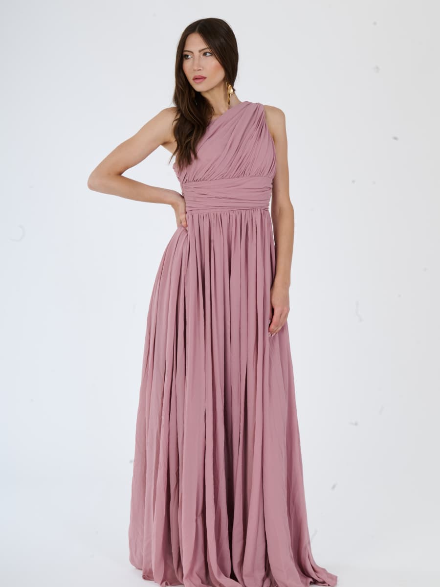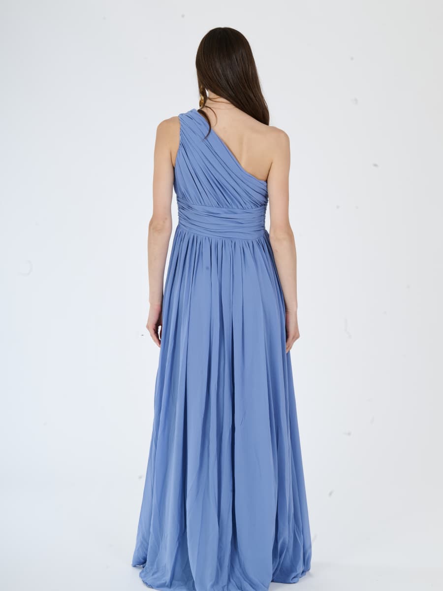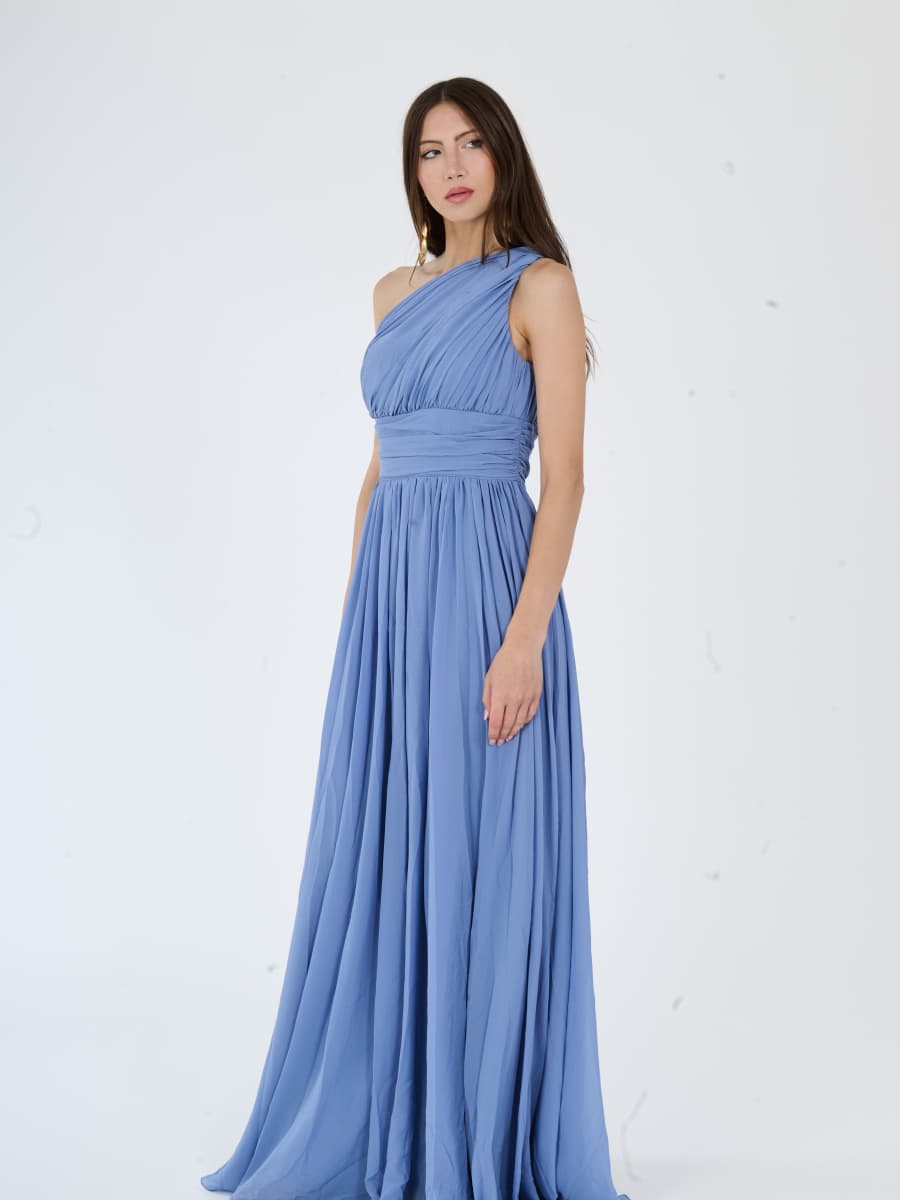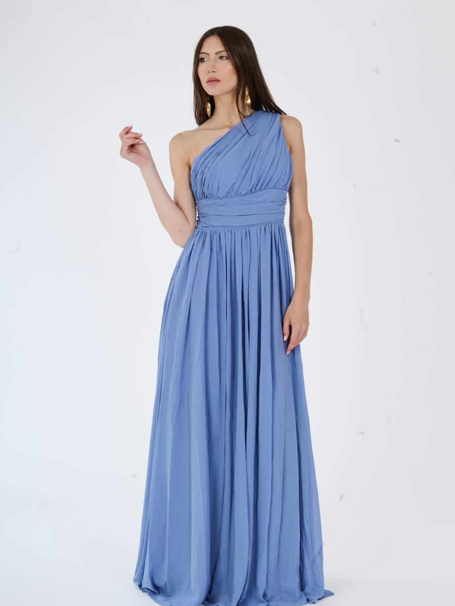 Lasciati conquistare dall’eleganza senza tempo di questo abito lungo monospalla. Il design asimmetrico valorizza la spalla con un tocco moderno e sofisticato, mentre la gonna ampia cade morbida creando un effetto scenografico.