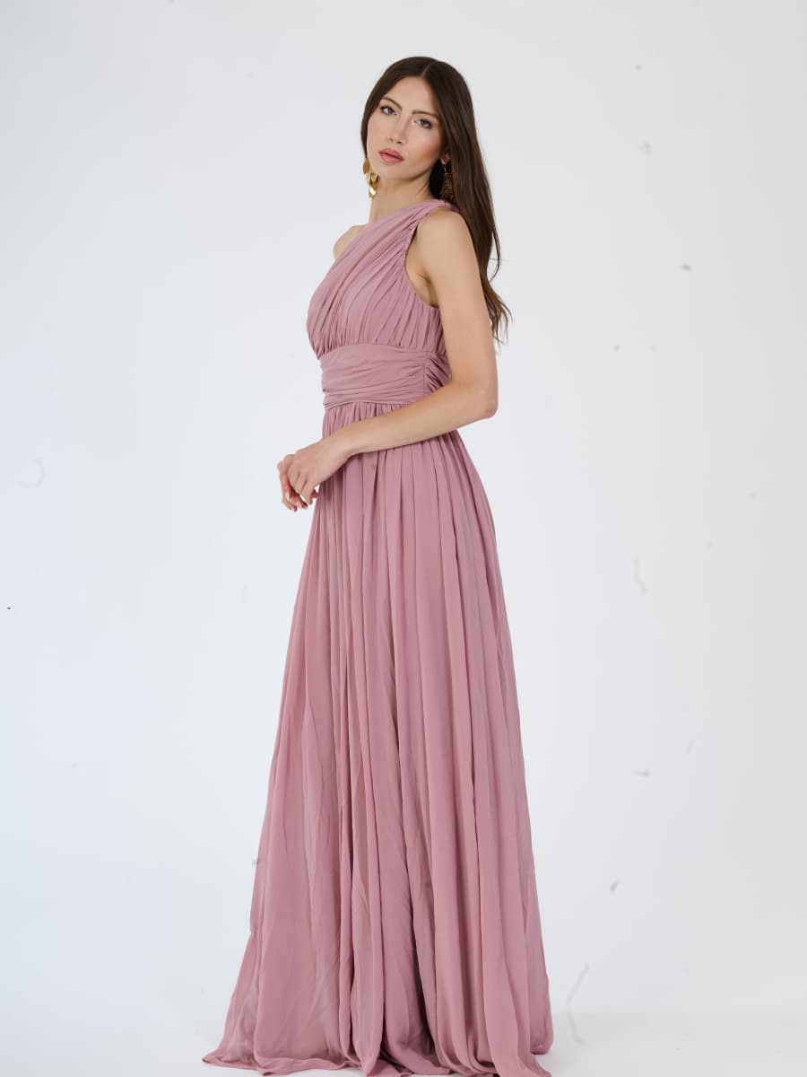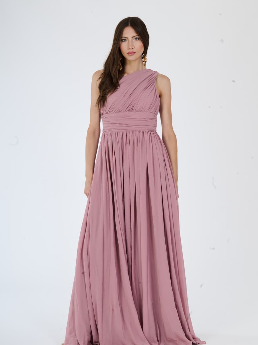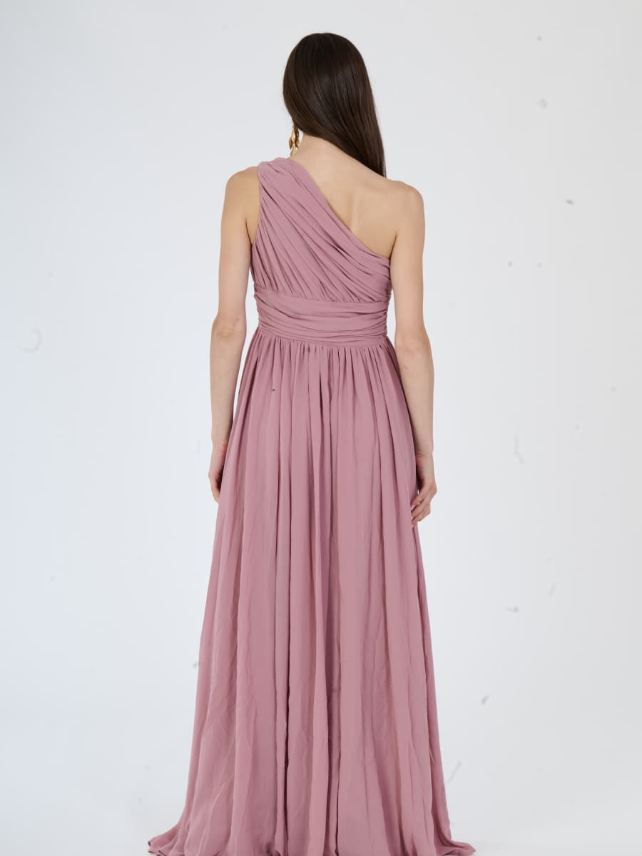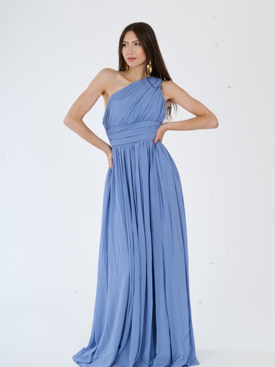 Lasciati conquistare dall’eleganza senza tempo di questo abito lungo monospalla. Il design asimmetrico valorizza la spalla con un tocco moderno e sofisticato, mentre la gonna ampia cade morbida creando un effetto scenografico.
